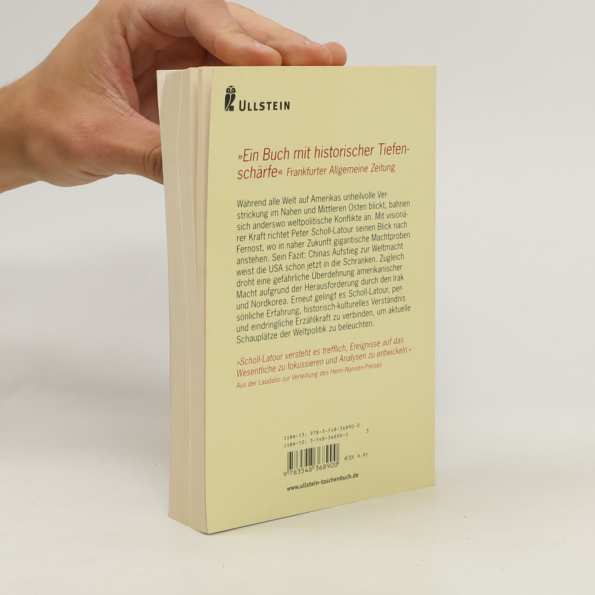 Während alle Welt gebannt auf Amerikas unheilvolle Verstrickung im Nahen und Mittleren Osten blickt, bahnen sich anderswo weltpolitische Konflikte an. Mit der ihm eigenen visionären Kraft richtet Peter Scholl-Latour seinen Blick nach Fernost, wo in naher Zukunft gigantische machtpolitische Kraftproben zu bewältigen sind. Sein Fazit: Der unaufhaltsame Aufstieg Chinas zur Weltmacht weist die USA schon jetzt in die Schranken. Zugleich droht eine gefährliche Überdehnung amerikanischer Macht durch die gleichzeitige Herausforderung durch den Irak und Nordkorea. Erneut gelingt es Scholl-Latour, persönliche Erfahrung, tiefes historisch-kulturelles Verständnis und eindringliche Erzählkraft zu verbinden, um aktuelle Schauplätze der Weltpolitik zu beleuchten.