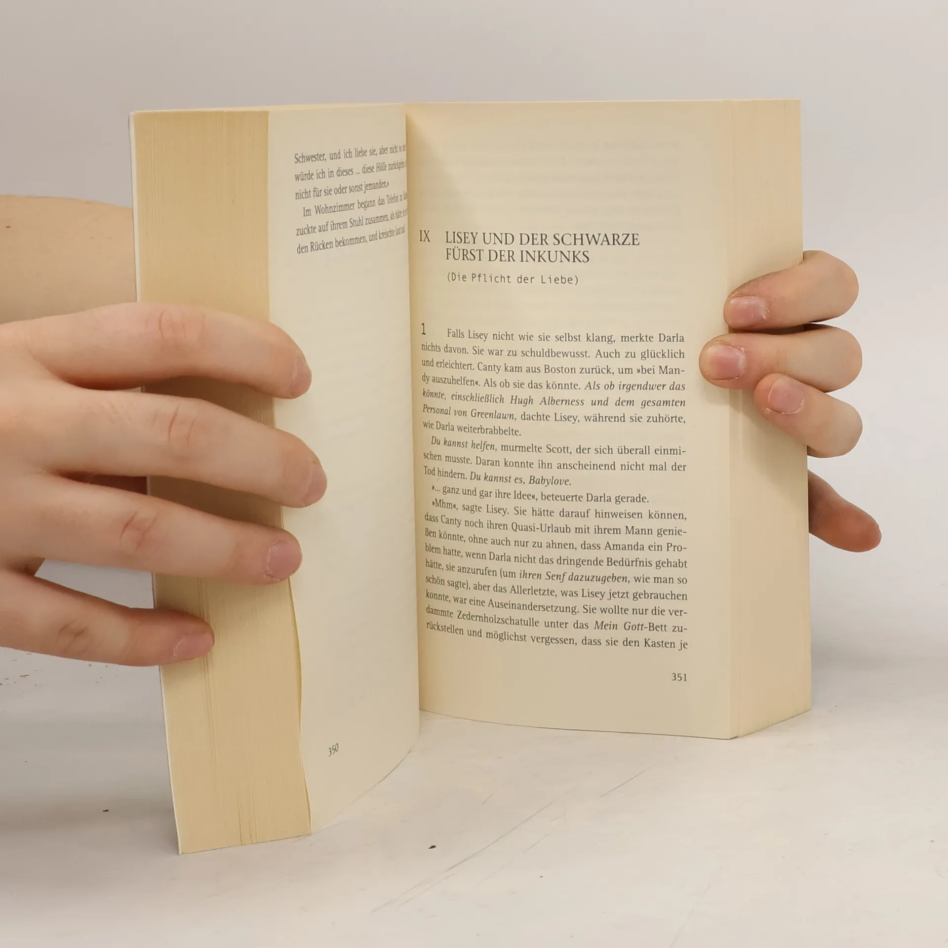 Das Böse kommt nachts. –Das Herz stirbt zuletzt. Liseys berühmter Mann ist tot – und sein Nachlass weckt albtraumhafte Erinnerungen und Ahnungen in ihr, die bald grausame Gewissheit werden ... In Stephen Kings vielleicht dichtestem und persönlichstem Roman geht es um die Geheimsprache der Liebe und die Allgegenwart des Wahnsinns. Lisey ist seit zwei Jahren Witwe. Bereits lange vor seinem Tod hat ihr Mann Scott Landon – ein hochangesehener Romanautor – für sie eine Spur mit Hinweisen ausgelegt, die sie nun immer tiefer in seine von Dämonen bevölkerte Vergangenheit führt. Stück für Stück werden sorgsam verdrängte Erinnerungen in ihr wach: an eine andere Welt, die sie einst mit Scott besucht hat, tagsüber ein märchenhaftes Paradies, während nachts überall das Böse lauert. Ob Scott dort auf sie wartet, damit sie ihn ins Leben zurückholt? Plötzlich tritt ein Verrückter auf den Plan, der sich Zack McCool nennt und es auf Scotts schriftstellerischen Nachlass abgesehen hat. Und um seine Forderungen zu bekräftigen, verletzt er Lisey auf bestialische Weise ... Librarian's note: See alternate cover edition of ISBN 3453432932 here .