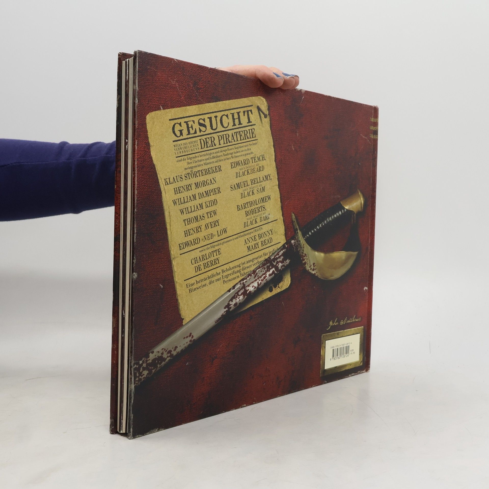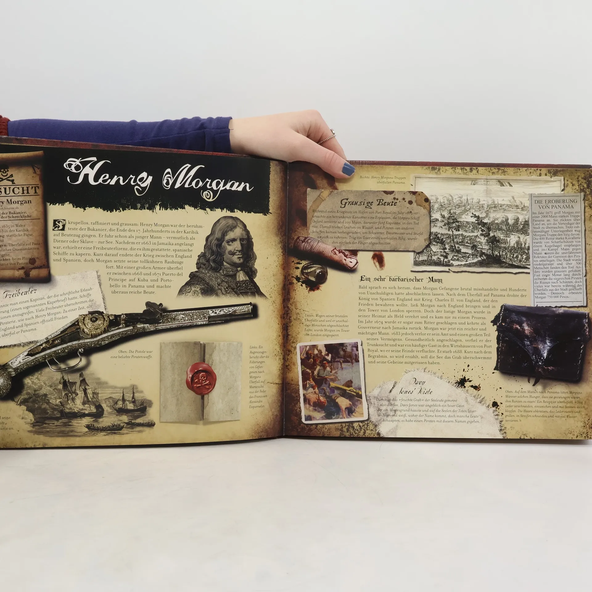 Tollkühne Raubzüge und skrupellose Verbrechen haben sie zu den meistgesuchten Personen der sieben Weltmeere gemacht: Von Klaus Störtebeker bis Black Bart Roberts beschwört dieses Buch die Abenteuer berühmt-berüchtigter Piraten (und Piratinnen) herauf. Alte Dokumente belegen, wie hart das Leben an Bord eines Piratenschiffes war – aber auch wie lukrativ! Schon der Umschlag des Buches verheißt mit einem grünen Juwelenauge und einem glitzernden Goldzahn eine »reiche Beute« …