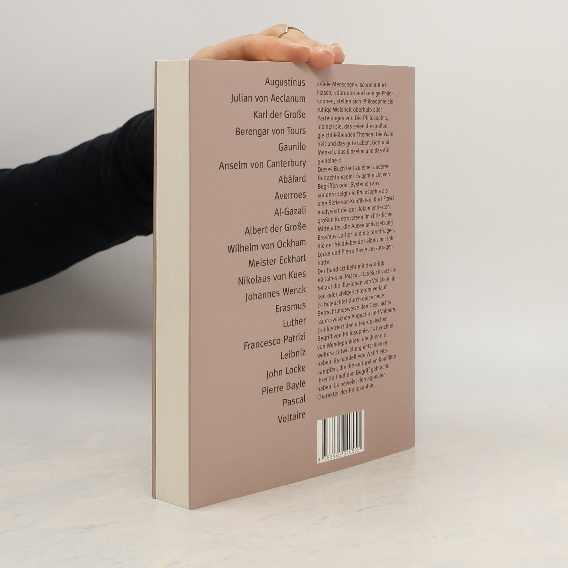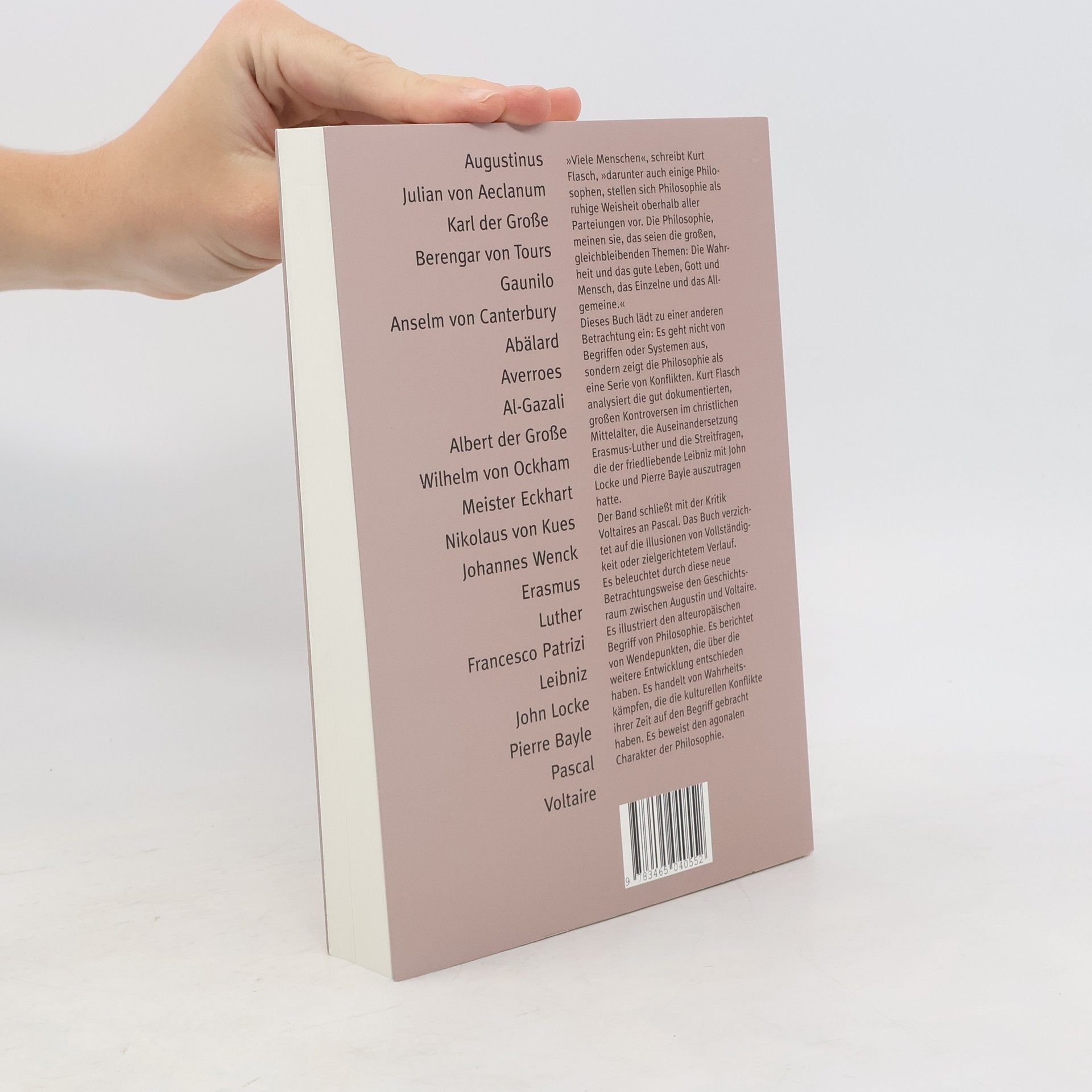 Kurt Flasch lädt zu einer neuen Betrachtung der Philosophie ein, die nicht als ruhige Weisheit, sondern als eine Serie von Konflikten verstanden wird. Er analysiert bedeutende Kontroversen des christlichen Mittelalters, darunter die Auseinandersetzung zwischen Erasmus und Luther sowie die Streitfragen, die Leibniz mit John Locke und Pierre Bayle klären musste. Der Band schließt mit Voltaires Kritik an Pascal und verzichtet auf die Illusionen von Vollständigkeit oder einem zielgerichteten Verlauf. Durch diese Perspektive wird der historische Raum zwischen Augustin und Voltaire beleuchtet und der alteuropäische Begriff von Philosophie illustriert. Es werden Wendepunkte dargestellt, die entscheidend für die Entwicklung des Denkens waren, und die Wahrheitskämpfe, die die kulturellen Konflikte ihrer Zeit prägten, werden aufgezeigt. Die intrinsisch agonale Natur der Philosophie wird deutlich. In einundzwanzig Kapiteln kommen unter anderem folgende Philosophen zu Wort: Augustinus, Julian von Aeclanum, Karl der Große, Berengar von Tours, Gaunilo, Anselm von Canterbury, Abälard, Averroes, Al-Gazali, Albert der Große, Wilhelm von Ockham, Meister Eckhart, Nikolaus von Kues, Johannes Wenck, Erasmus, Luther, Francesco Patrizi, Leibniz, John Locke, Pierre Bayle, Pascal und Voltaire.