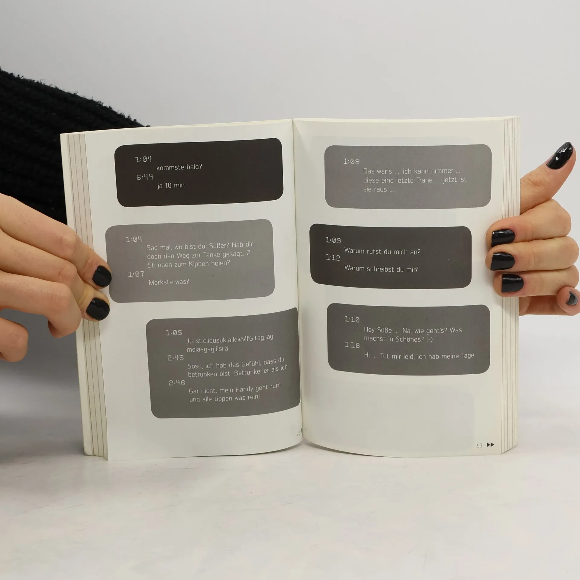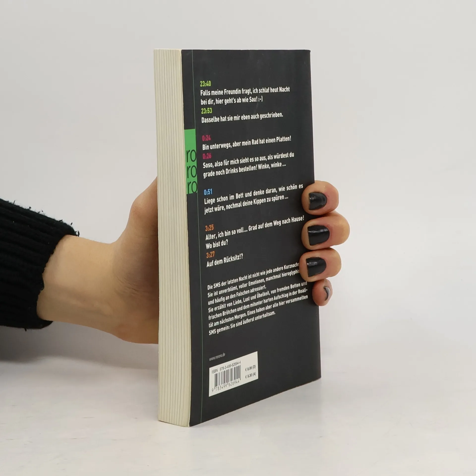 23:40Falls meine Freundin fragt, ich schlaf heut Nacht bei dir, hier gehts ab wie Sau! :-)23:53Dasselbe hat sie mir eben auch geschrieben.0:24Bin unterwegs, aber mein Rad hat einen Platten!0:26Soso, also für mich sieht es so aus, als würdest du grade noch Drinks bestellen! Winke, winke …0:51Liege schon im Bett und denke daran, wie schön es jetzt wäre, nochmal deine Kippen zu spüren …3:25Alter, ich bin so voll ... Grad auf dem Weg nach Hause! Wo bist du?3:27Auf dem Rücksitz!? Die SMS der letzten Nacht ist nicht wie jede andere Kurznachricht. Sie ist unverblümt, voller Emotionen, manchmal hieroglyphisch – und häufig an den Falschen adressiert.Sie erzählt von Liebe, Lust und Übelkeit, von fremden Betten und frischen Brötchen und dem mitunter harten Aufschlag in der Realität am nächsten Morgen. Eines haben aber alle hier versammelten SMS gemein: Sie sind äußerst unterhaltsam.