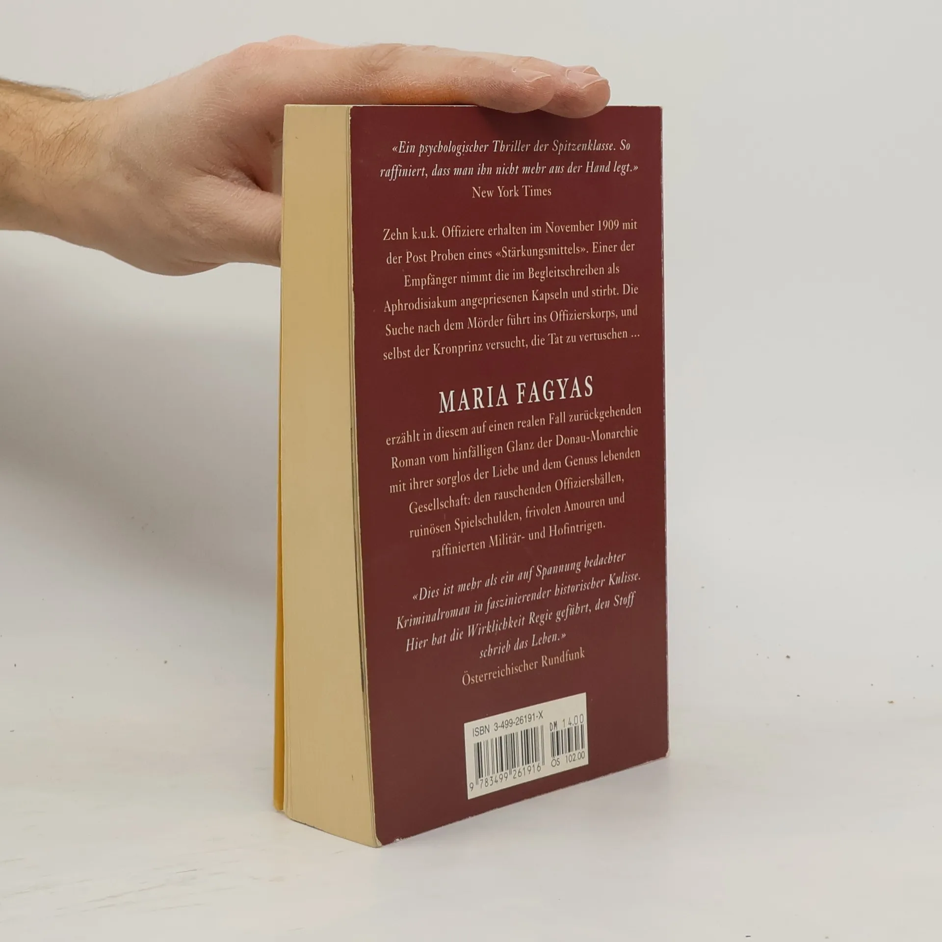 "Zehn k.u.k. Offiziere erhalten im November 1909 mit der Post Proben eines "Stärkungsmittels". Einer der Empfänger nimmt die im Begleitschreiben als Aphrodisiakum angepriesenen Kapseln und stirbt. Die Suche nach dem Mörder führt ins Offizierskorps, und selbst der Kronprinz versucht, die Tat zu vertuschen...". Maria Fagyas erzählt in diesem auf einen realen Fall zurückgehenden Roman vom hinfälligen Glanz der Donaumonarchie mit ihrer sorglos der Liebe und dem Genuss lebenden Gesellschaft: den raschenden Offiziersbällen, ruinösen Spielschulden, frivolen Amouren und raffinierten Militär- und Hofintrigen. «Dies ist mehr als ein auf Spannung bedachter Kriminalroman in faszinierender historischer Kulisse. Hier hat die Wirklichkeit Regie geführt, den Stoff schrieb das Leben.» Österreichischer Rundfunk.