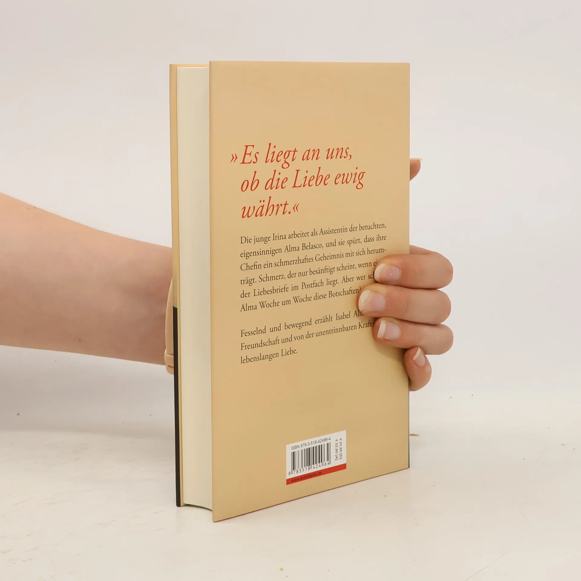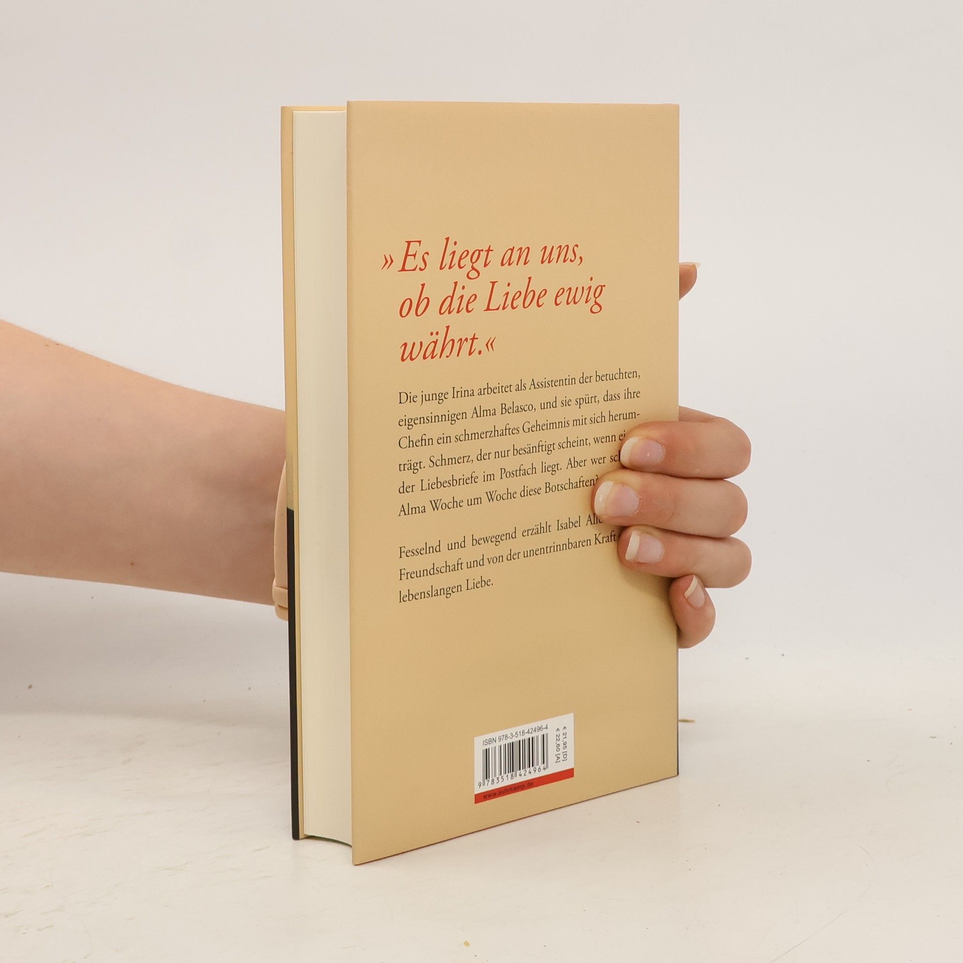 Isabel Allende auf dem Höhepunkt ihres Schaffens »Es liegt an uns, ob die Liebe ewig währt.« Für Irina ist der neue Job ein Glücksfall. Die junge Frau soll für die Millionärin Alma Belasco als Assistentin arbeiten. Mit einem Schlag ist sie nicht nur ihre Geldsorgen los, sondern gewinnt auch eine Freundin, wie sie noch keine hatte: extravagant, überbordend, mitreißend und an die achtzig. Doch bald spürt sie, dass Alma verwundet ist. Eine Wunde, die nur vergessen scheint, wenn eines der edlen Kuverts im Postfach liegt. Aber wer schreibt Woche um Woche diese Liebesbriefe? Und von wem stammen all die Blumen? Auch um sich von den eigenen Lebenssorgen abzulenken, folgt Irina den Spuren, und es beginnt eine abenteuerliche Reise bis weit in die Vergangenheit. Isabel Allende erzählt von Freundschaft und der unentrinnbaren Kraft einer lebenslangen Liebe. Davon, wie Zeit und Zwänge über eine solche Liebe hinweggehen und sie verwandeln, in Verbundenheit, Wehmut und ein leises Staunen – darüber, schon so lange gemeinsam unterwegs zu sein.