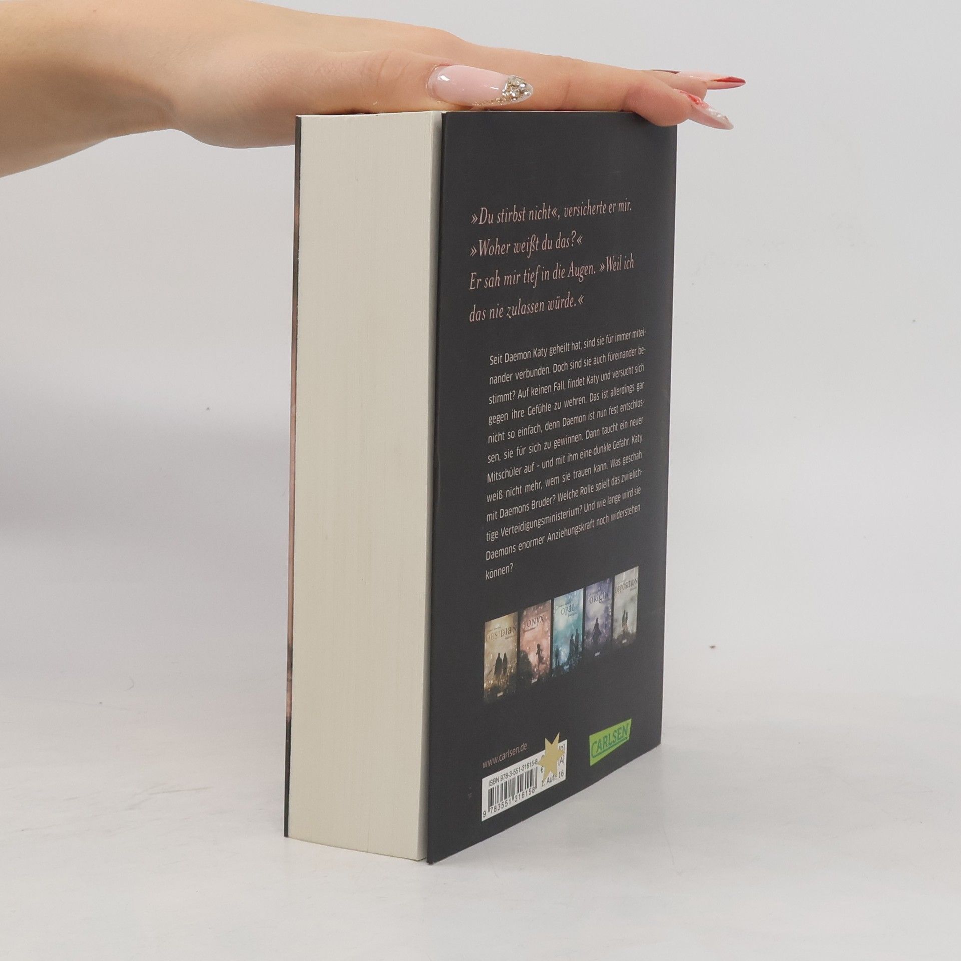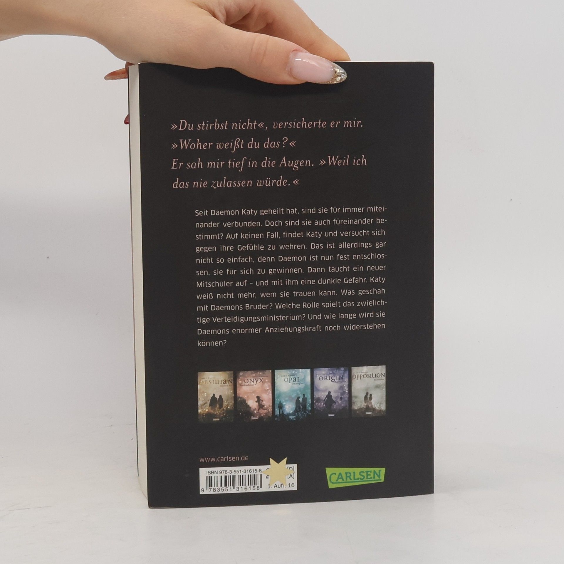 Seit Daemon Katy geheilt hat, sind sie für immer miteinander verbunden. Doch heißt das, dass sie auch füreinander bestimmt sind? Auf keinen Fall, findet Katy und versucht sich gegen ihre Gefühle zu wehren. Das ist allerdings gar nicht so einfach, denn Daemon ist nun fest entschlossen, sie für sich zu gewinnen. Dann taucht ein neuer Mitschüler auf – und mit ihm eine dunkle Gefahr. Katy weiß nicht mehr, wem sie trauen kann. Was geschah mit Daemons Bruder? Welche Rolle spielt das zwielichtige Verteidigungsministerium? Und wie lange wird sie Daemons enormer Anziehungskraft noch widerstehen können? Dies ist der zweite Band der Obsidian-Serie von Jennifer L. Armentrout. Alle Bände der unwiderstehlichen Bestsellerserie:Obsidian. SchattendunkelOnyx. SchattenschimmerOpal. SchattenglanzOrigin. SchattenfunkeOpposition. Schattenblitz Alle Bände der dazugehörigen Oblivion-Serie:Oblivion 1: Lichtflüstern (Obsidian aus Daemons Sicht erzählt)Oblivion 2: Lichtflimmern (Onyx aus Daemons Sicht erzählt)Oblivion 3: Lichtflackern (Opal aus Daemons Sicht erzählt) Alle bisher erschienenen Bände der Spin-off-Serie »Revenge«:Revenge. SternensturmRebellion. SchattensturmRedemption. Nachtsturm