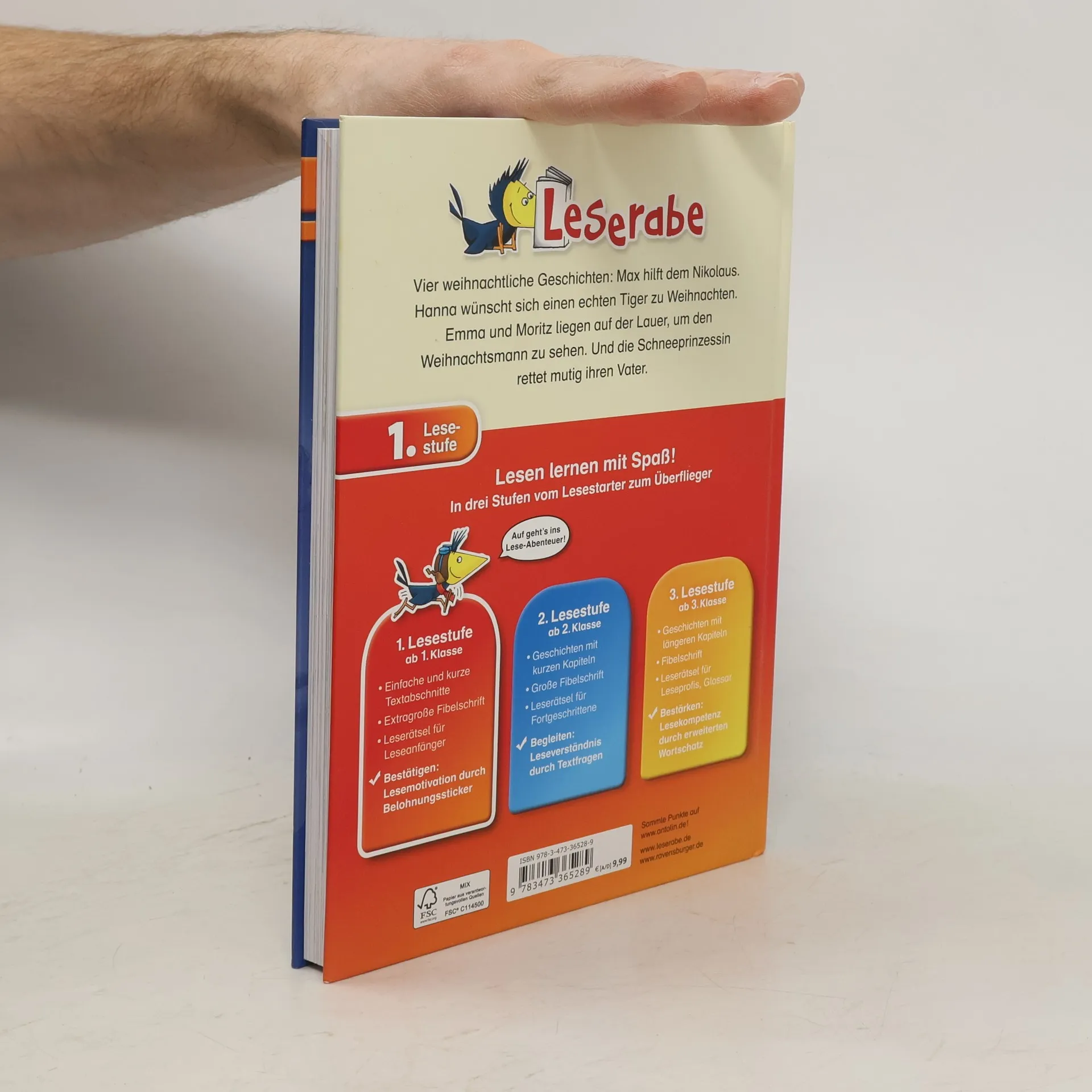 Vier bezaubernde Weihnachtsgeschichten in einem Band: Max hilft dem Nikolaus, seinen Mantel zu flicken, und Hanna wünscht sich nichts sehnlicher als einen echten Tiger zu Weihnachten. Die Zwillinge Emma und Moritz liegen auf der Lauer, um endlich einmal den Weihnachtsmann zu sehen, der überraschenderweise vom Weihnachtshasen vertreten wird. Und die Schneeprinzessin will ihren Vater befreien, der von der Eishexe Saria entführt wurde. Lesen lernen wie im Flug! Die Kinderbücher der Reihe Leserabe – 1. Lesestufe wurden mit Pädagogen entwickelt und richten sich an Leseanfänger ab der 1. Klasse. Kurze Texte in großer Fibelschrift sichern erste Leseerfolge und steigern die Lesekompetenz von Mädchen und Jungen ab 6 Jahren. Empfohlen von Stiftung Lesen, gelistet bei Antolin.