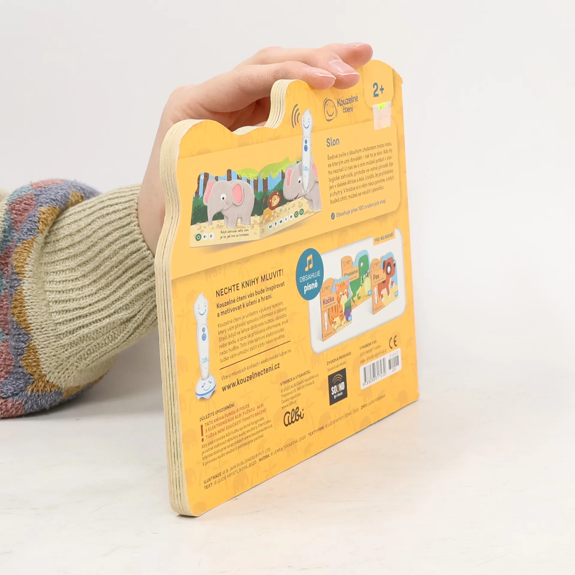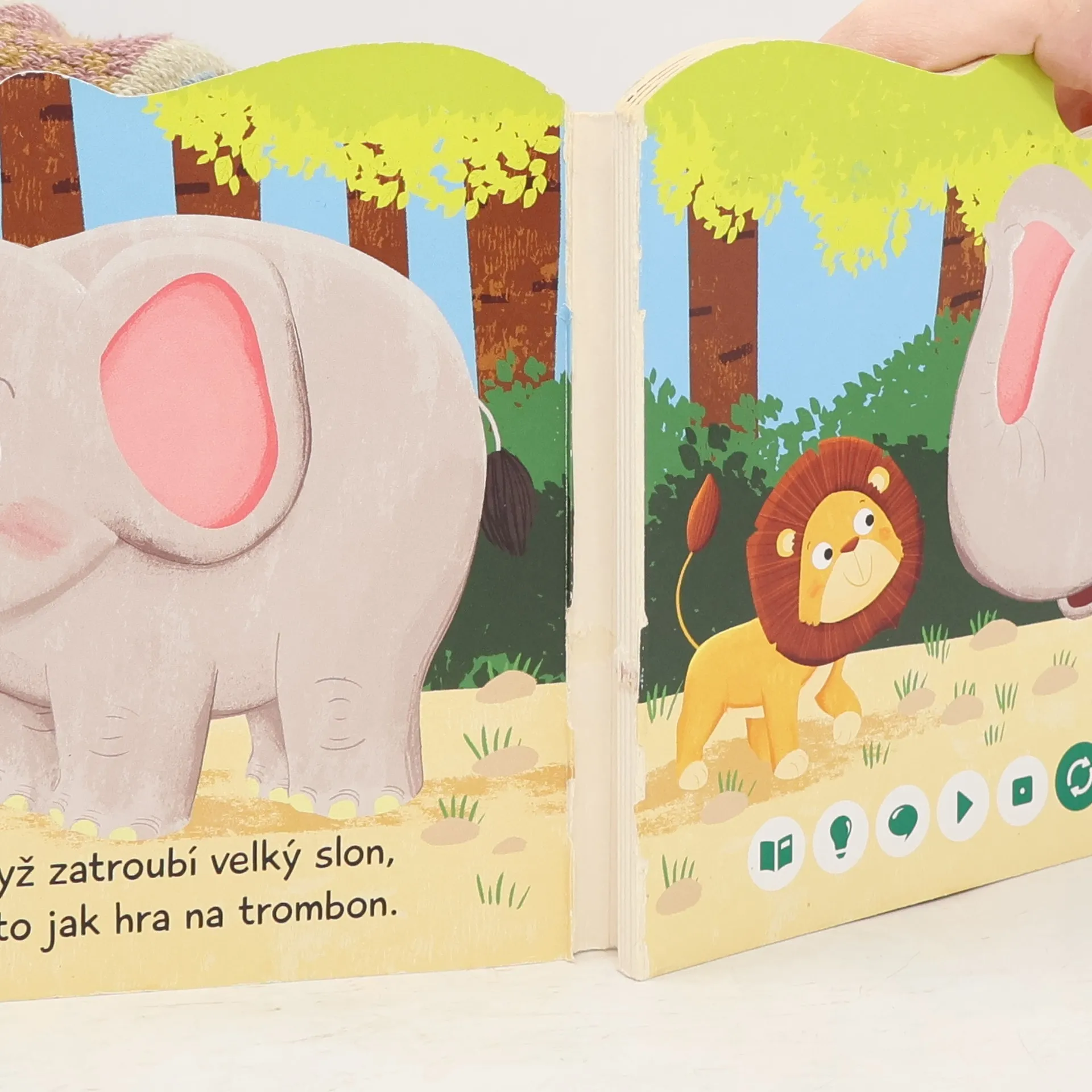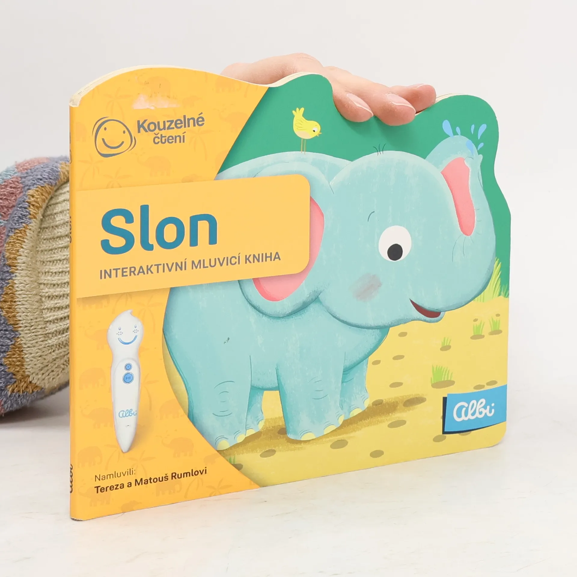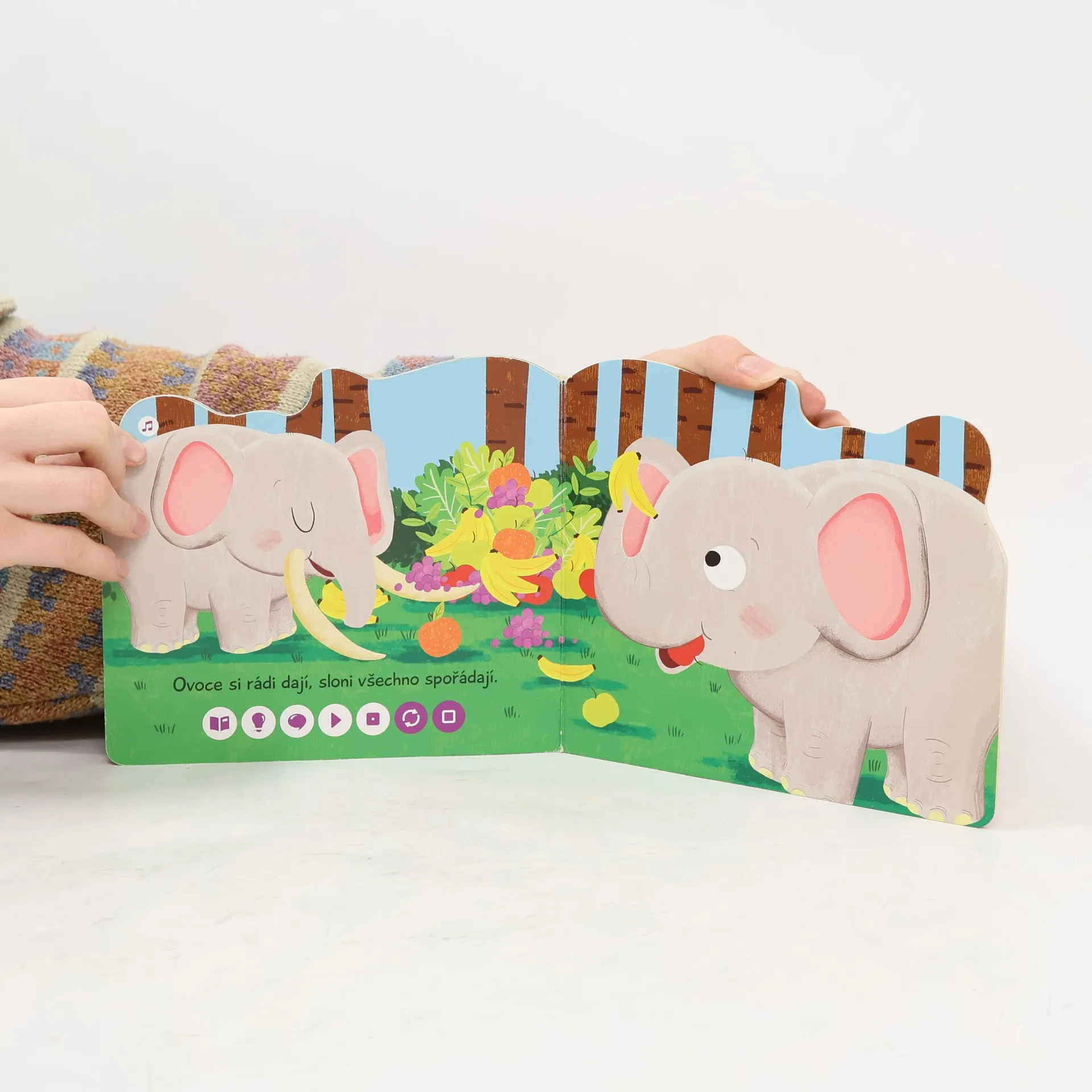 Interaktivní obrázková kniha s tuhými listy a říkadly o slonech, určena pro čtení s elektronickou tužkou.