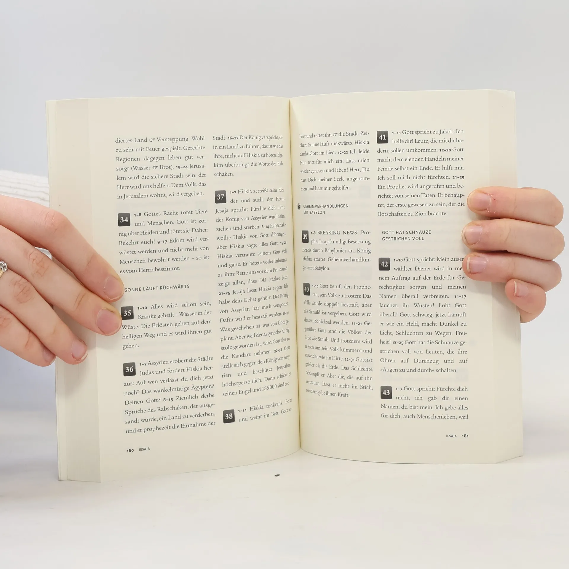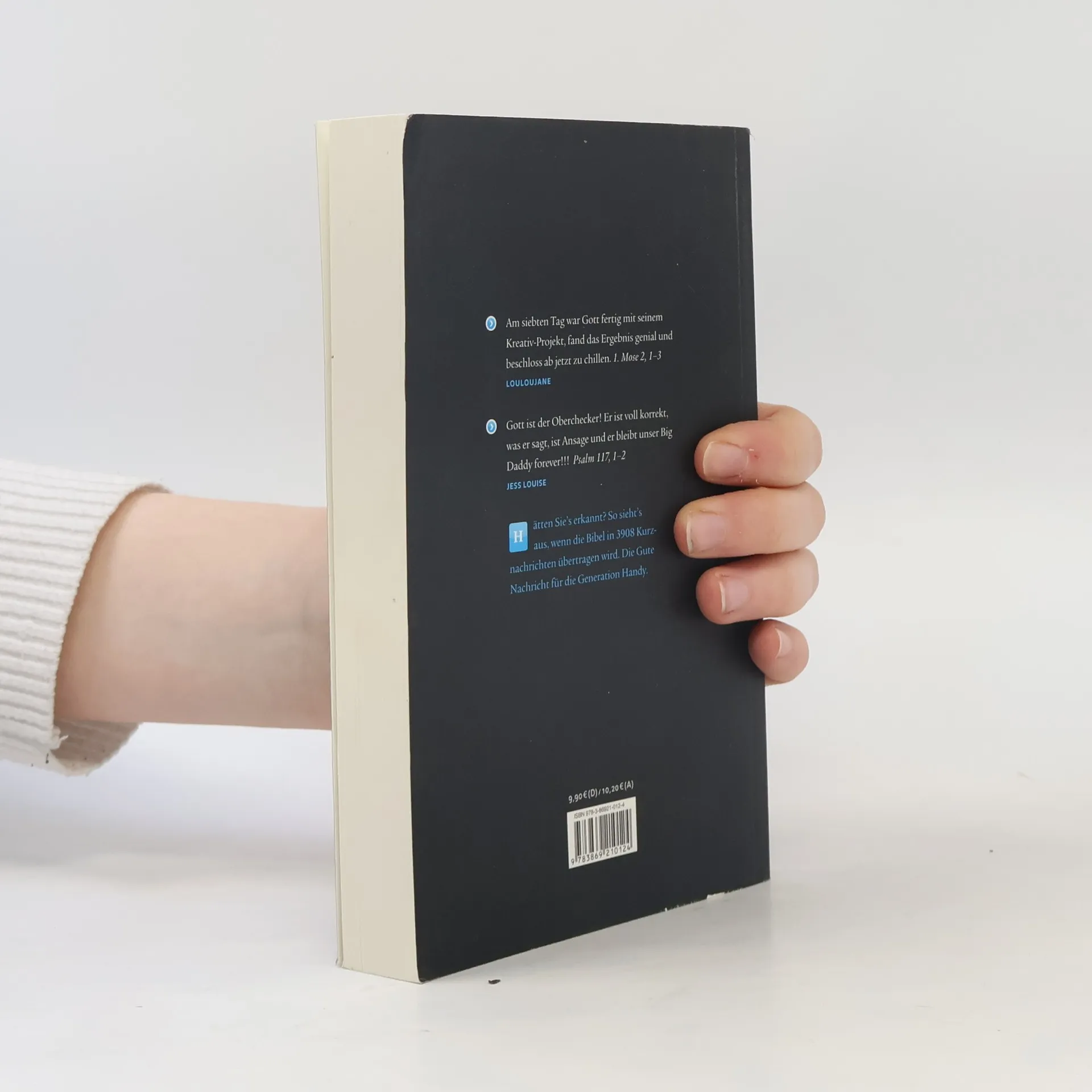 Am siebten Tag war Gott fertig mit seinem Kreativ-Projekt, fand das Ergebnis genial und beschloss ab jetzt zu chillen. 1. Mose 2, 1–3 (louloujane,) Gott ist der Oberchecker! Er ist voll korrekt, was er sagt, ist Ansage und er bleibt unser Big Daddy forever!!! Psalm 117, 1–2 (jess louise) Hätten Sie´s erkannt? So sieht´s aus, wenn die Bibel in 3908 Kurznachrichten übertragen wird. Die Gute Nachricht für die Generation Handy. 500 Jahre nach Luther: Über 3000 Menschen – Alte und Junge, Protestanten, Katholiken und Zweifler – scharen sich aufgeregt um die Bibel. Sie haben eine gemeinsame Mission. Es gilt, Altes und Neues Testament in die heute geläufige Sprache zu übertragen, Twitter- oder auch SMSDeutsch genannt. Das heißt: 3908 Bibelstellen in Kurznachrichten zu je 140 Zeichen zusammenzufassen. Dauern solide Bibelübertragungen in der Regel mehrere Jahrzehnte, so hat man hier noch nicht mal eine Woche Zeit. Der Rekordversuch startet vier Tage vor Pfingsten, am Pfingstsonntag liegen 6000 Zusammenfassungen vor. Dieses Projekt markiert den Auftakt des neuen Internetportals evangelisch. de. Der Bibel-Twitter-Rekord wurde 2009 auf dem Evangelischen Kirchentag in Bremen erreicht. Für das Begleitbuch „Und Gott chillte“ sind die markantesten 3908 Bibelstellen für eine verblüffende Bibelübertragung ausgewählt. Sie eignet sich hervorragend für den Konfirmandenunterricht oder als Inspiration neben der Lutherbibel 1984.