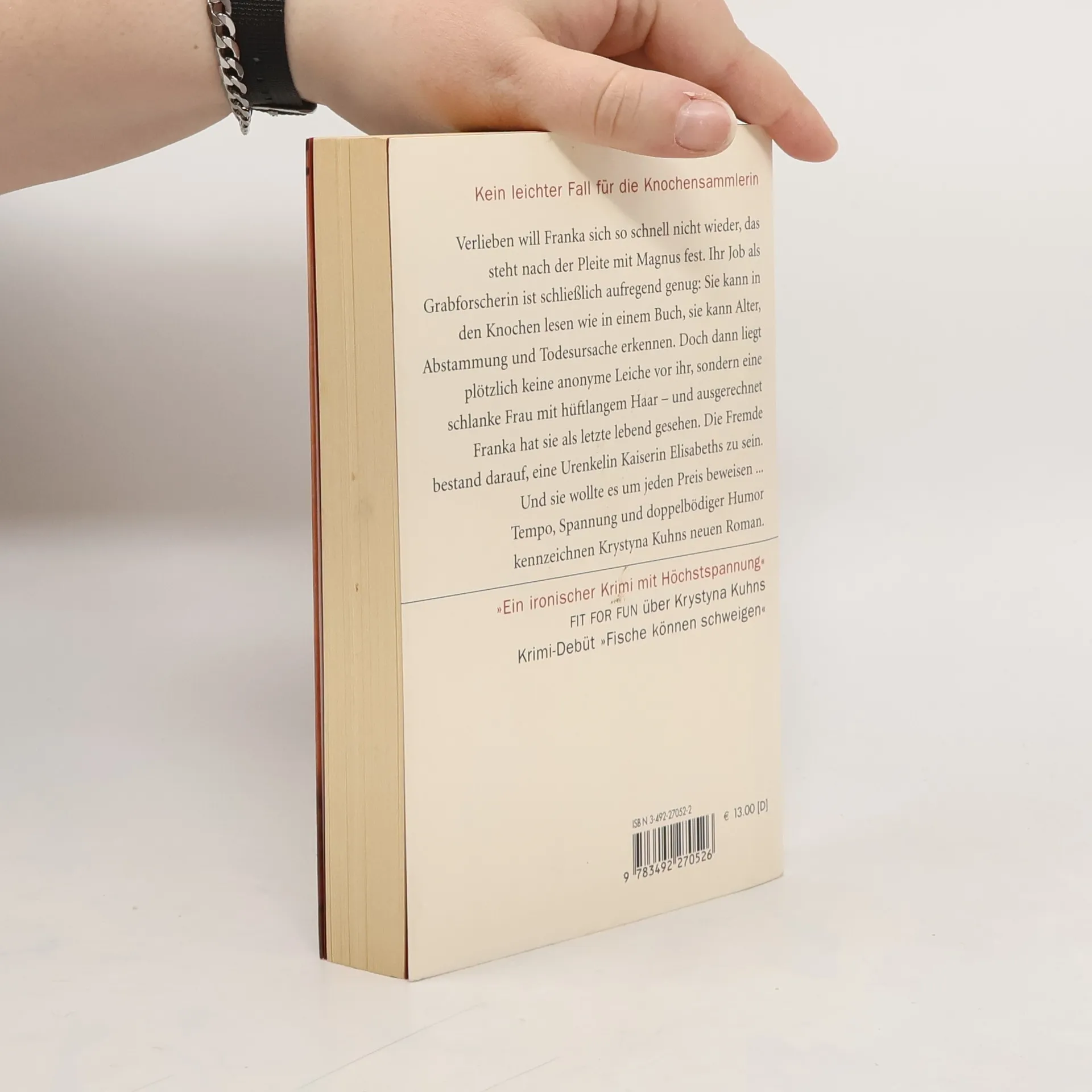 Tote machen Franka Friedland nichts aus, schließlich ist die junge Frankfurterin Grabforscherin. Doch diesmal ist es anders: Die Frau mit den drei Einschüssen im Kopf, die auf dem Seziertisch liegt, hat Franka als Letzte lebend gesehen. Die Unbekannte hatte bei Frankas Vater, einem Internisten im Ruhestand, geklingelt, doch dieser war in Wien. Franka öffnete die Tür und fand die Frau verzweifelt und völlig fertig. Was wollte sie von Dr. Friedland? Und warum leugnet der Arzt, sie gekannt zu haben? Ermutigt von dem attraktiven Gerichtsmediziner Henning Veit, beginnt Franka, selbst zu recherchieren. Die Spur führt sie und ihre Freundin Theresa nach Wien: Die Frau mit dem langen Haar hielt sich für eine Urenkelin der Kaiserin Sisi und wollte dies mit einem DNA-Test beweisen. Doch in Wien gibt es einige, die kein Interesse an einer vermeintlichen Verwandten haben und auch nicht davor zurückschrecken, unliebsame Schnüfflerinnen auszuschalten. Krystyna Kuhn, die 1997 ein Schreibseminar für Spannungsromane belegte, hat mit ihrem ersten Roman und dem Folgebuch eine hartnäckige Heldin geschaffen, die auf der Suche nach Mörder und Motiv ist. Sie kombiniert Kriminalgeschichte mit einer Lovestory, gewürzt mit Humor und einer ungewöhnlichen Story bis zur letzten Seite.