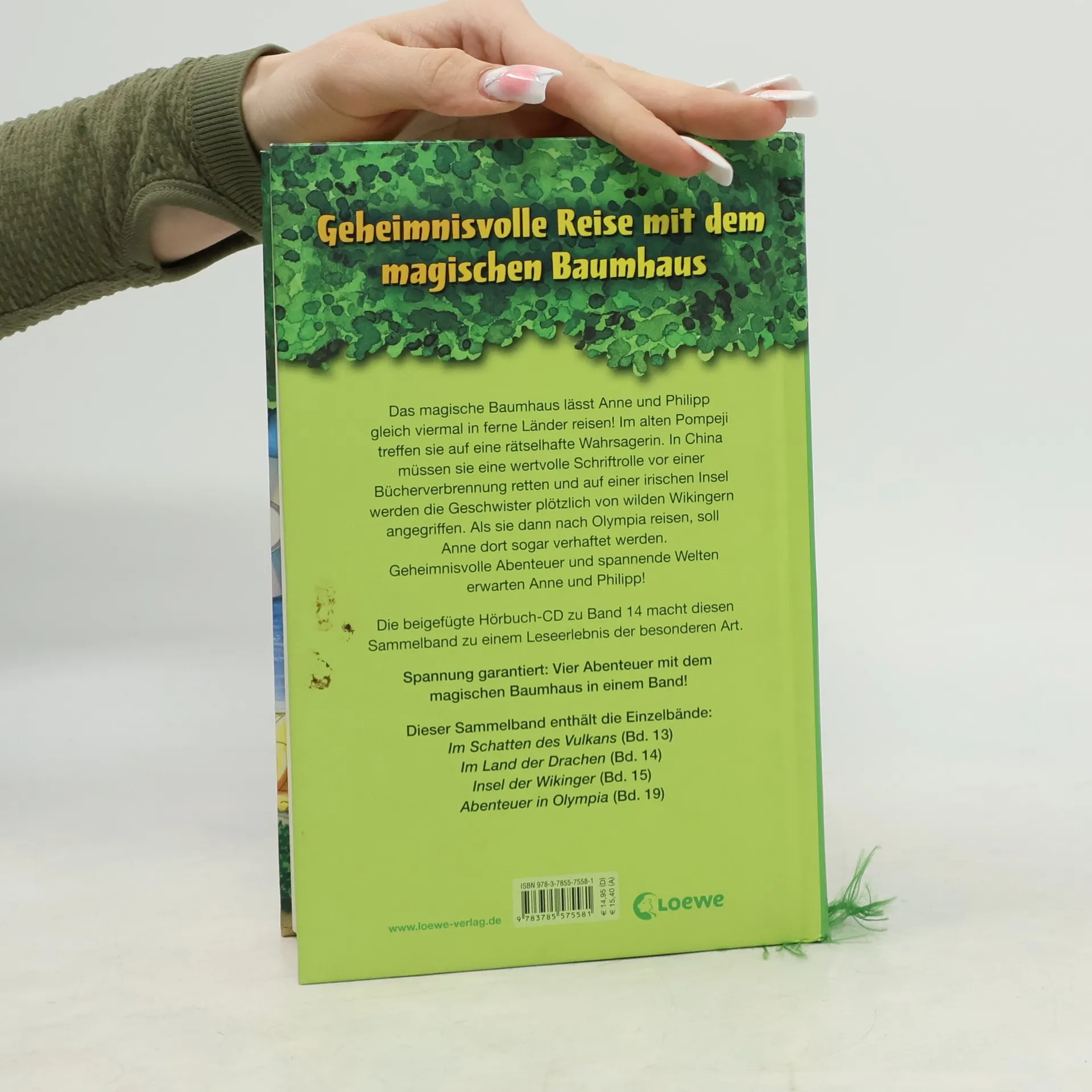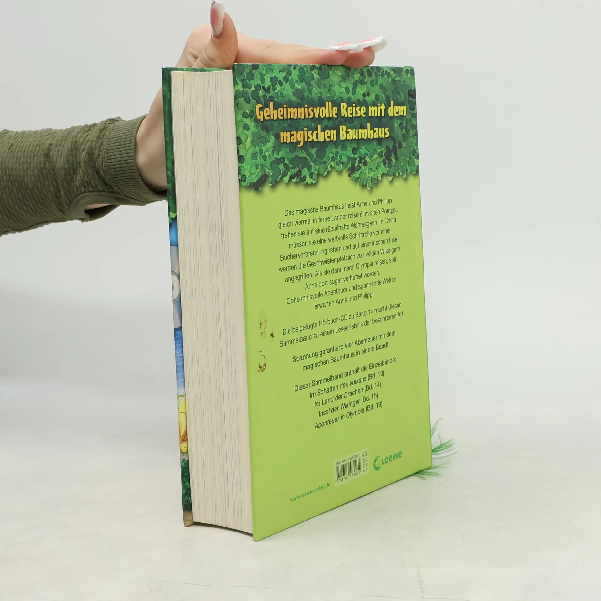 Das Buch ist bei deiner Buchhandlung vor Ort und bei vielen Online-Buchshops erhältlich! + Bücher, die Kinder gerne lesen wollen + Beliebte Themen: Abenteuer, Tiere und fremde Länder + Hochwertiges Hardcover + Mit vielen Illustrationen + Bereits über 10 Millionen verkaufte Bücher der Baumhaus-Reihe + Ausgewogenes Text-Bild-Verhältnis + Große Schrift + Kurze Kapitel + Das magische Baumhaus lässt Anne und Philipp gleich viermal in ferne Länder reisen! Im alten Pompeji treffen sie auf eine rätselhafte Wahrsagerin. In China müssen sie eine wertvolle Schriftrolle vor einer Bücherverbrennung retten und auf einer irischen Insel werden die Geschwister plötzlich von wilden Wikingern angegriffen. Als sie dann nach Olympia reisen, soll Anne dort sogar verhaftet werden. Geheimnisvolle Abenteuer und spannende Welten erwarten Anne und Philipp! Die beigefügte Hörbuch-CD zu Band 14 macht diesen Sammelband zu einem Leseerlebnis der besonderen Art. Dieser Sammelband enthält die Einzelbände: „Im Schatten des Vulkans“ (Bd. 13) „Im Land der Drachen“ (Bd. 14) „Insel der Wikinger“ (Bd. 15) „Abenteuer in Olympia“ (Bd. 19) Die beliebte Kinderbuch-Reihe von Bestsellerautorin Mary Pope Osborne! Die Geschwister Anne und Philipp reisen mit dem magischen Baumhaus durch die Zeit. Sie erleben spannende Abenteuer, entdecken ferne Länder und lernen viele berühmte Persönlichkeiten kennen.