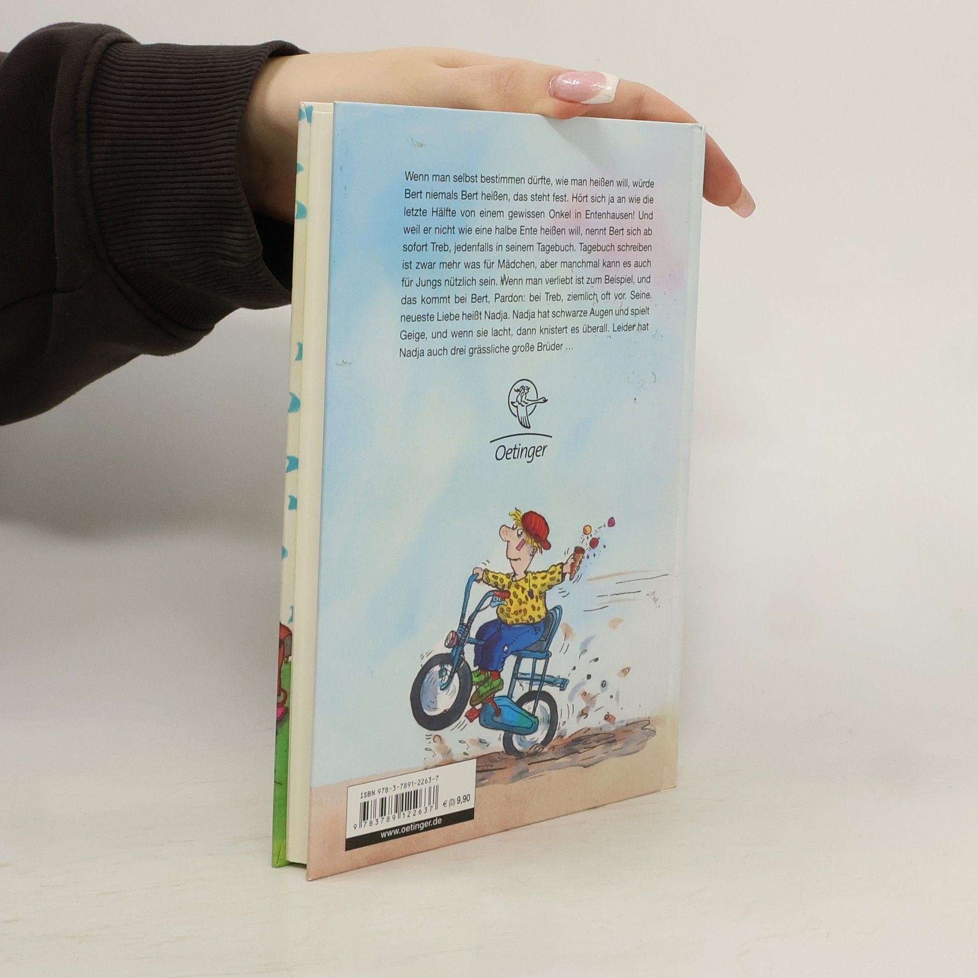 Wenn man selbst bestimmen dürfte, wie man heißen will, würde Bert niemals Bert heißen, das steht fest. Hört sich ja an wie die letzte Hälfte von einem gewissen Onkel in Entenhausen! Und weil er nicht wie eine halbe Ente heißen will, nennt Bert sich ab sofort Treb, jedenfalls in seinem Tagebuch. Tagebuch schreiben ist zwar mehr was für Mädchen, aber manchmal kann es auch für Jungs nützlich sein. Wenn man verliebt ist zum Beispiel, und das kommt bei Bert, Pardon: bei Treb, ziemlich oft vor. Seine neueste Liebe heißt Nadja. Nadja hat schwarze Augen und spielt Geige, und wenn sie lacht, dann knistert es überall. Leider hat Nadja auch drei grässliche große Brüder...