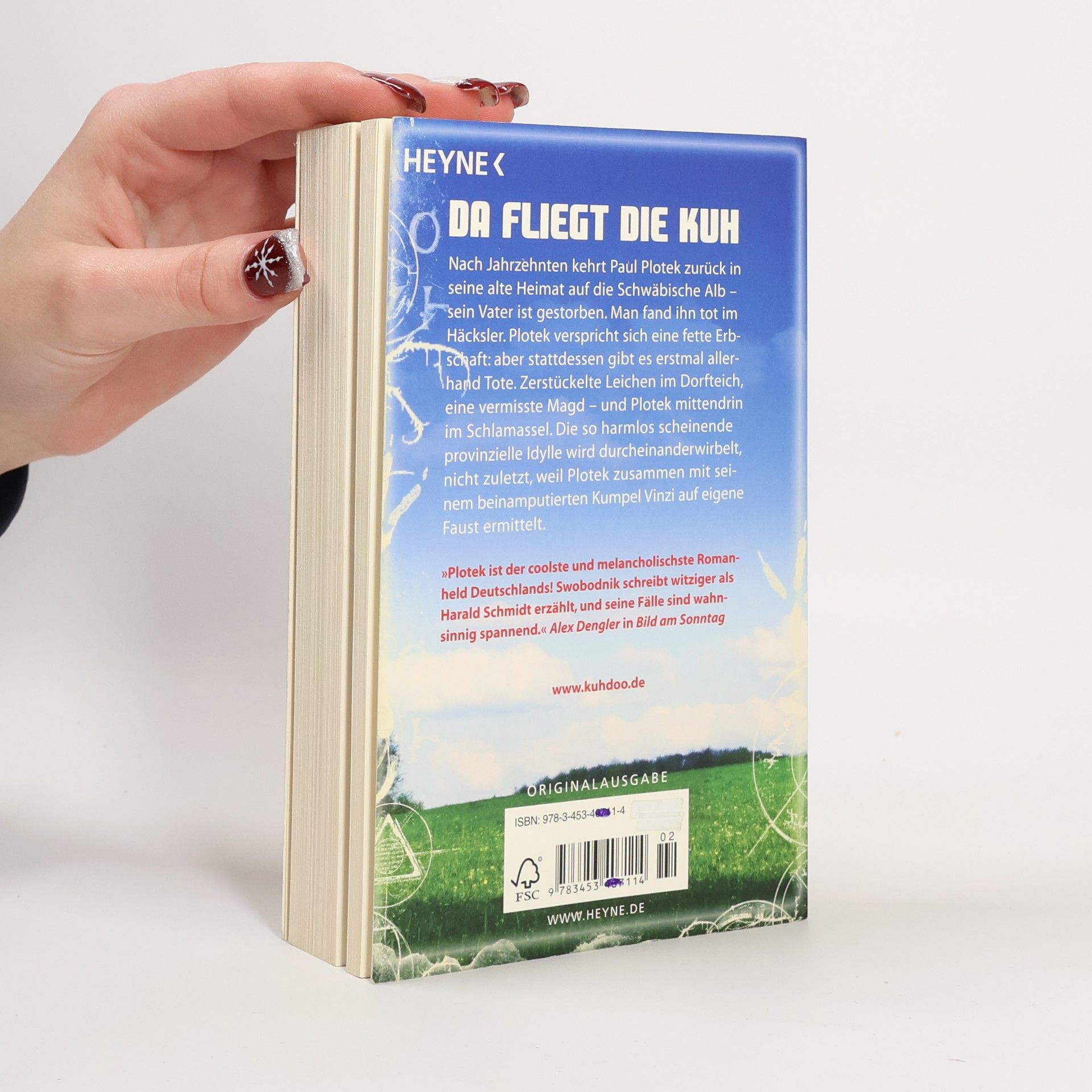 Da fliegt die Kuh Nach Jahrzehnten kehrt Paul Plotek zurück in seine alte Heimat auf die Schwäbische Alb – sein Vater ist gestorben. Man fand ihn tot im Häcksler. Plotek verspricht sich eine fette Erbschaft, aber stattdessen gibt es erst mal allerhand Tote. Zerstückelte Leichen im Dorfteich, eine vermisste Magd und Plotek mittendrin im Schlamassel. Die so harmlos scheinende provinzielle Idylle wird durcheinandergewirbelt, nicht zuletzt, weil Plotek zusammen mit seinem beinamputierten Kumpel Vinzi auf eigene Faust ermittelt.