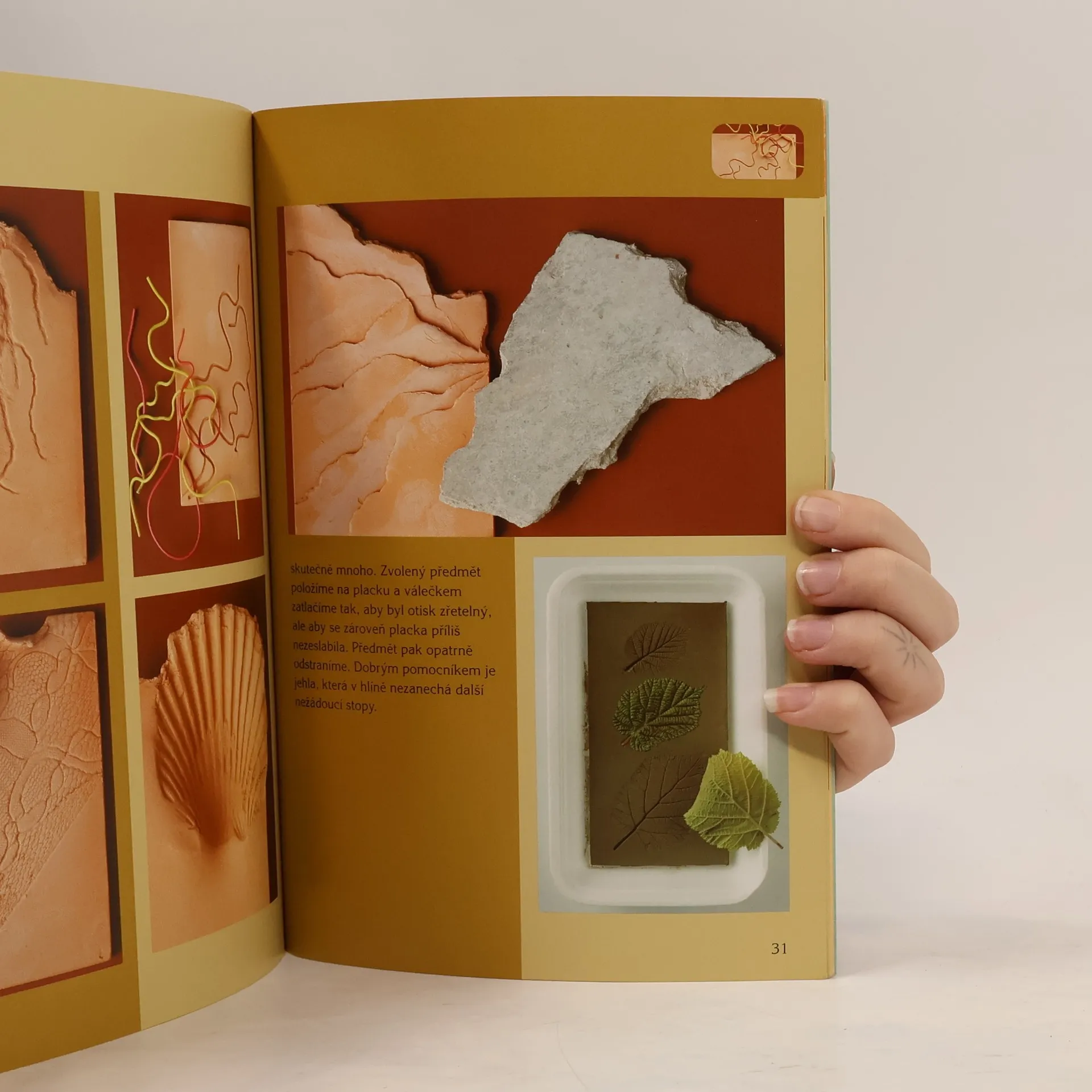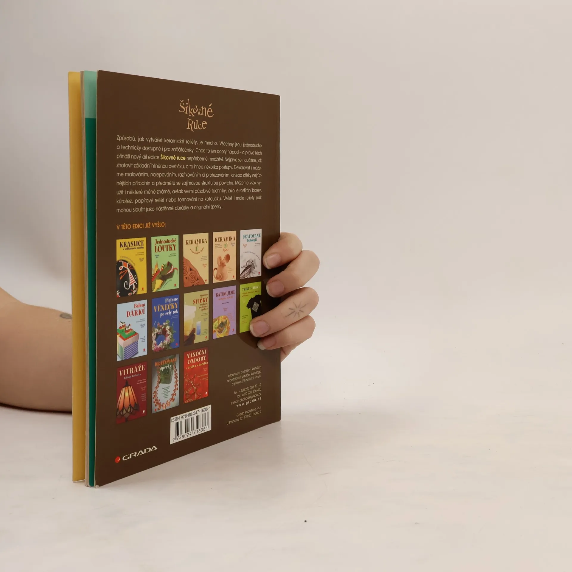 Způsobů, jak vytvářet keramické reliéfy, je mnoho. Všechny jsou jednoduché a technicky dostupné i pro začátečníky. Chce to jen dobrý nápad - a právě těch přináší nový díl edice Šikovné ruce nepřeberné množství. Nejprve se naučíme, jak zhotovit základní hliněnou destičku, a to hned několika postupy. Dekorovat ji můžeme malováním, nalepováním, razítkováním či prořezáváním, anebo otisky nejrůznějších přírodnin a předmětů se zajímavou strukturou povrchu. Můžeme však využít i některé méně známé, avšak velmi působivé techniky, jako je roztírání barev, kůrořez, papírový reliéf nebo formování na kotoučku. Velké i malé reliéfy pak mohou sloužit jako nástěnné obrázky a originální šperky. Originální návodová knížka je určena pro děti i rodiče, vedoucí keramických kroužků, kurzů i učitele výtvarné výchovy.