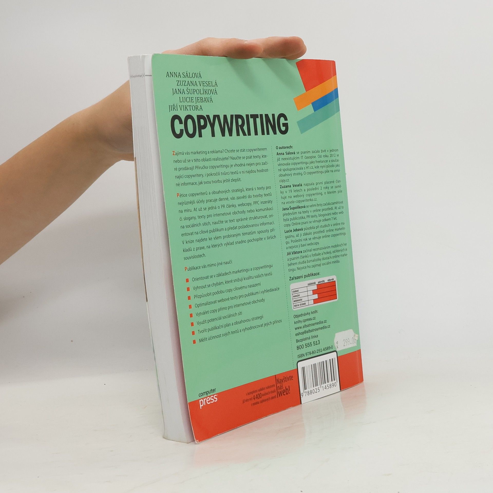 Zajímá vás marketing a reklama? Chcete se stát copywriterem, nebo už se v této oblasti realizujete? Naučte se psát texty, které prodávají! Příručka copywritingu je vhodná nejen pro začínající copywritery, i pokročilí tvůrci textů v ní najdou hodnotné informace, jak svou tvorbu ještě zlepšit. Pětice copywriterů a obsahových stratégů, která s texty pro nejrůznější účely pracuje denně, vás zasvětí do tvorby textů na míru. Ať už se jedná o PR články, webcopy, PPC inzeráty či slogany, texty na internetové obchody nebo komunikaci na sociálních sítích, naučíte se text správně strukturovat, orientovat na cílové publikum a předat požadovanou informaci. V knize najdete ke všem probíraným tématům spousty příkladů z praxe, na kterých výklad snadno pochopíte v širších souvislostech. Publikace vás mimo jiné naučí: - Orientovat se v základech marketingu a copywritingu - Vyhnout se chybám, které snižují kvalitu vašich textů - Přizpůsobit podobu copy cílovému nasazení - Optimalizovat webové texty pro cílové publikum i vyhledávače - Vytvářet copy přímo pro internetové obchody - Využít potenciál sociálních sítí - Tvořit publikační plán a obsahovou strategii - Měřit účinnost svých textů a vyhodnocovat jejich přínos