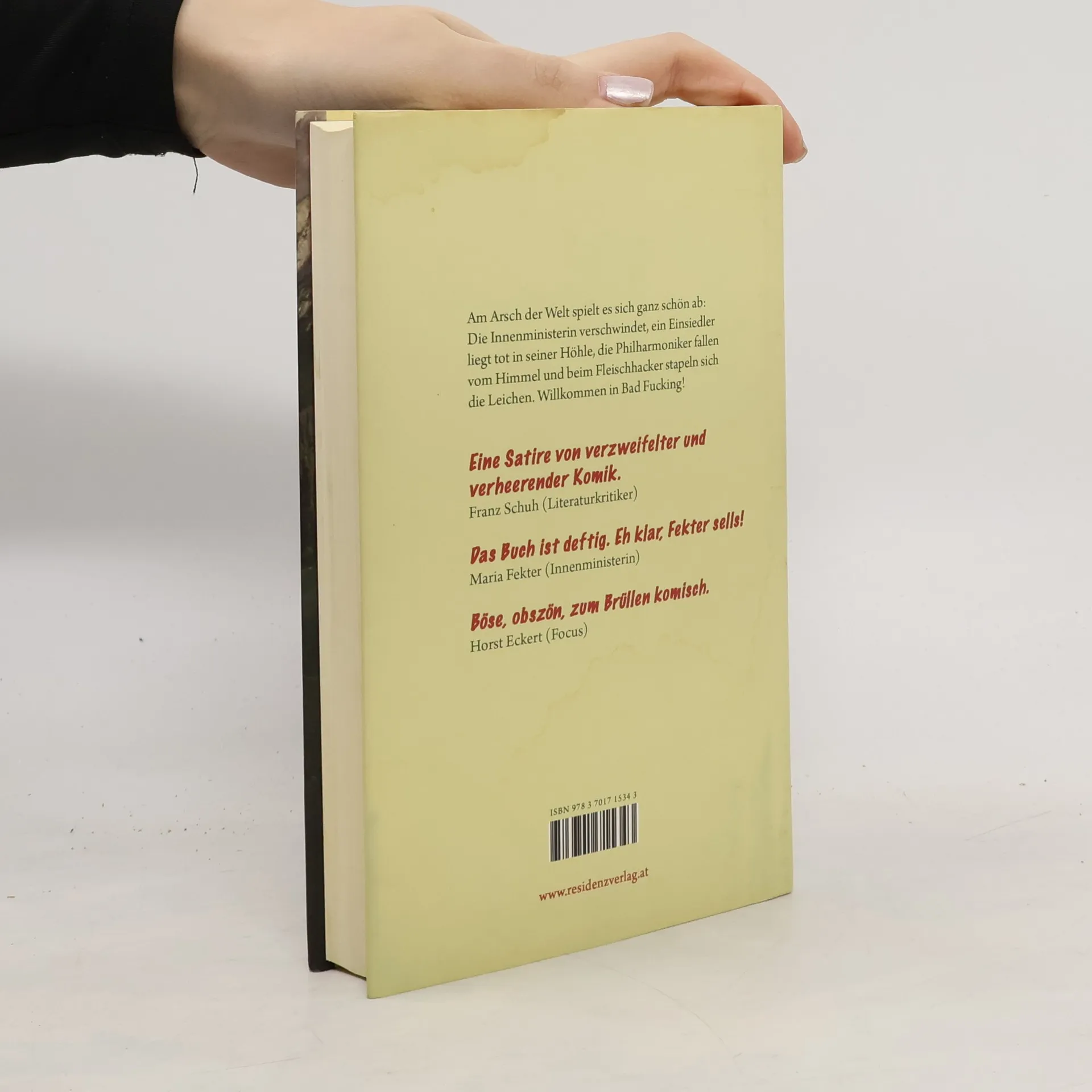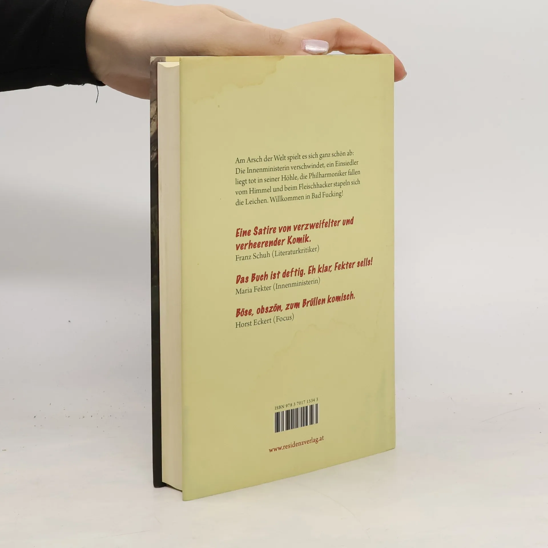 Eine Provinzpolitkrimigroteske, ein Bad Fucking Alptraum! In Bad Fucking braut sich etwas zusammen: Zuerst liegt Vitus Schallmoser (Sonderling) tot in seiner Wohnhöhle. Dann bekommt Camilla Glyck (Bundeskriminalamt) den Auftrag, nach Maria Sperr (Innenministerin) zu suchen, die als Bauunternehmerin in Bad Fucking quasi nebenberuflich ein Asylantenheim errichten lassen wollte. Und während auf dem Sportplatz von Bad Fucking eine Gruppe Cheerleader trainiert, beschließt Jagoda Dragicevic (Putzfrau), Dr. Ulrich (Zahnarzt) wegen eines Nacktfotos zu erpressen. Unterdessen flüchtet in Wien Ludmilla Jesenská (Einbrecherin) vor ihren Verfolgern: Sie hat in Bad Fucking Fotos von geheimnisvollen Höhlenmalereien gemacht. Das alles (und noch viel mehr) geschieht, während eine Hitzewelle Europa beinahe lahm legt und sich Tausende Aale und ein Mordsunwetter auf Bad Fucking zubewegen.