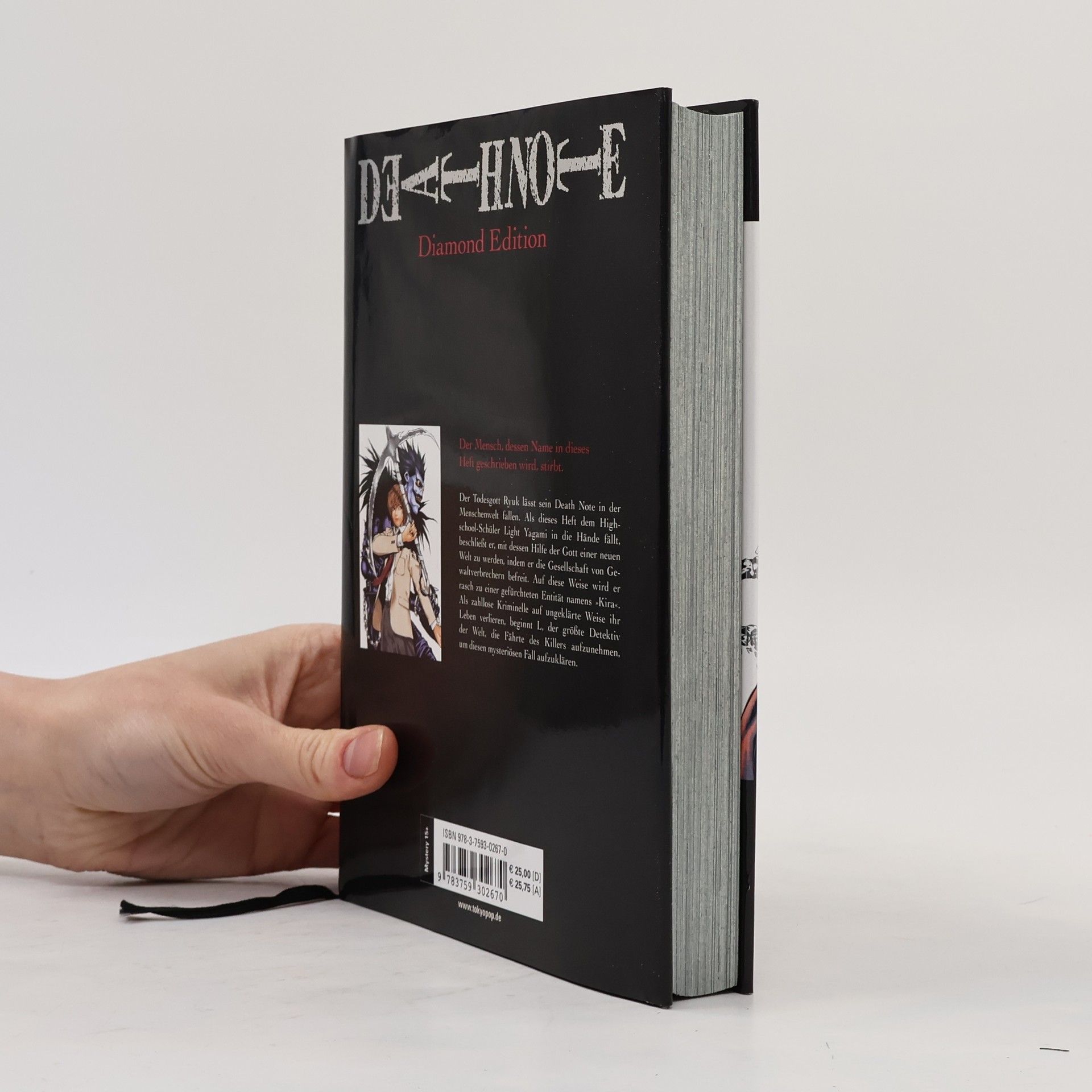 Der Todesgott Ryuk lässt sein Death Note in der Menschenwelt fallen. Als dieses Heft dem Highschool-Schüler Light Yagami in die Hände fällt, beschließt er, mit dessen Hilfe der Gott einer neuen Welt zu werden, indem er die Gesellschaft von Gewaltverbrechern befreit. Auf diese Weise wird er rasch zu einer gefürchteten Entität namens »Kira«. Als zahllose Kriminelle auf ungeklärte Weise ihr Leben verlieren, beginnt L, der größte Detektiv der Welt, die Fährte des Killers aufzunehmen, um diesen mysteriösen Fall aufzuklären. Die ultimative Edition des Bestsellers mit 10 Farbseiten, Hardcover, Schutzumschlag, Farbschnitt, Fadenbindung und beiliegender Kira-Card in jedem Band.
