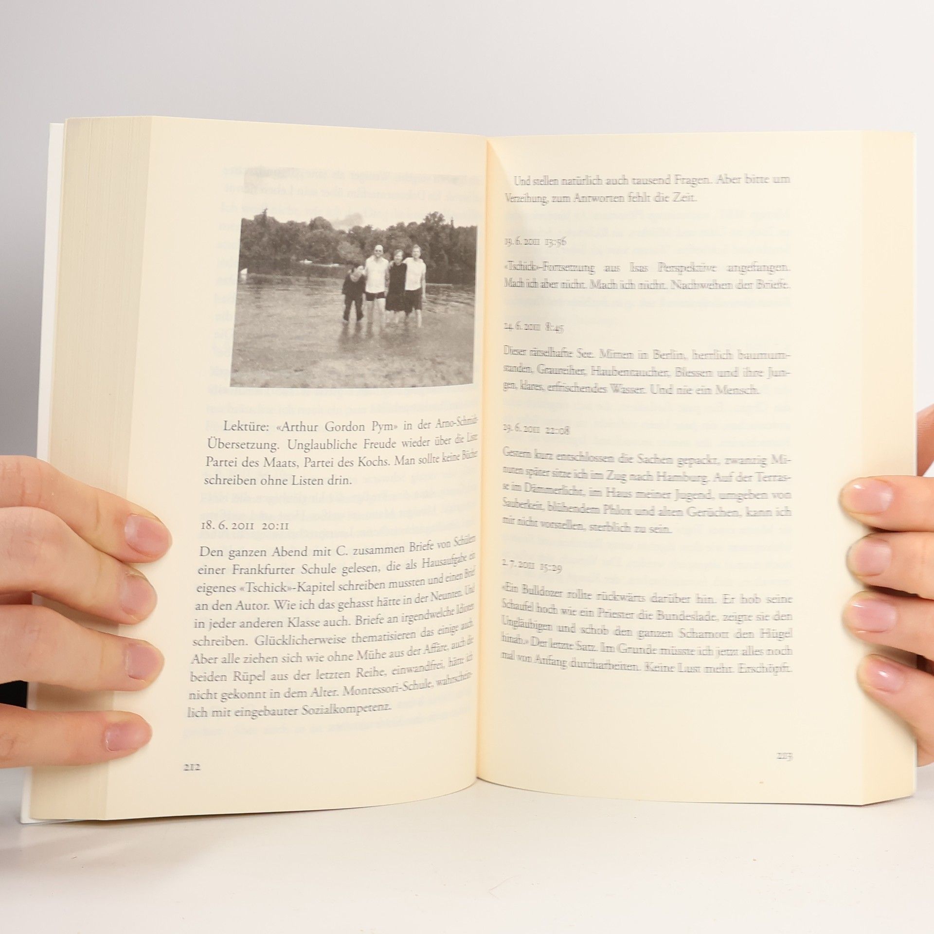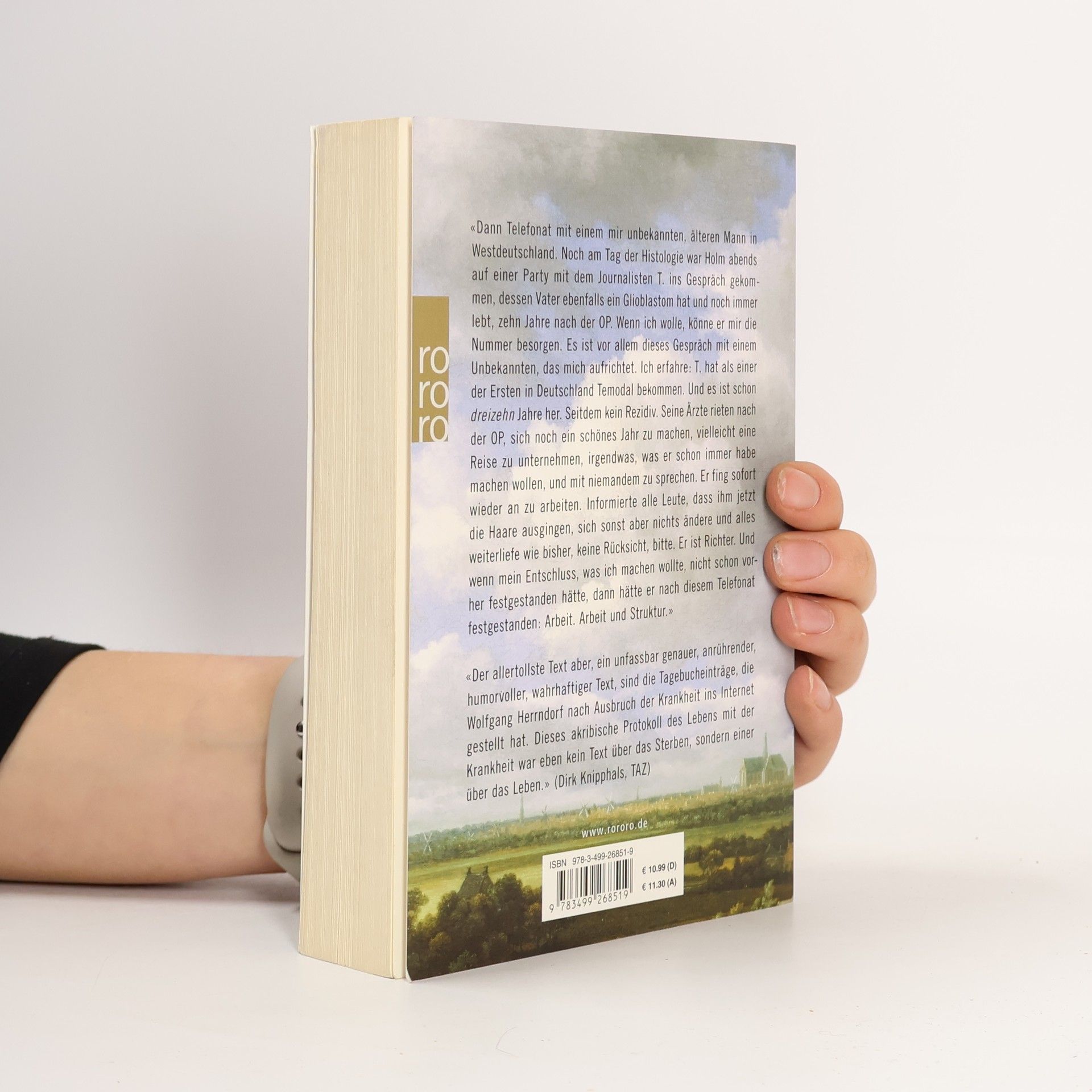 «Dann Telefonat mit einem mir unbekannten, älteren Mann in Westdeutschland. Noch am Tag der Histologie war Holm abends auf einer Party mit dem Journalisten T. ins Gespräch gekommen, dessen Vater ebenfalls ein Glioblastom hat und noch immer lebt, zehn Jahre nach der OP. Wenn ich wolle, könne er mir die Nummer besorgen. Es ist vor allem dieses Gespräch mit einem Unbekannten, das mich aufrichtet. Ich erfahre: T. hat als einer der Ersten in Deutschland Temodal bekommen. Und es ist schon dreizehn Jahre her. Seitdem kein Rezidiv. Seine Ärzte rieten nach der OP, sich noch ein schönes Jahr zu machen, vielleicht eine Reise zu unternehmen, irgendwas, was er schon immer habe machen wollen, und mit niemandem zu sprechen. Er fing sofort wieder an zu arbeiten. Informierte alle Leute, dass ihm jetzt die Haare ausgingen, sich sonst aber nichts ändere und alles weiterliefe wie bisher, keine Rücksicht, bitte. Er ist Richter. Und wenn mein Entschluss, was ich machen wollte, nicht schon vorher festgestanden hätte, dann hätte er nach diesem Telefonat festgestanden: Arbeit. Arbeit und Struktur.»