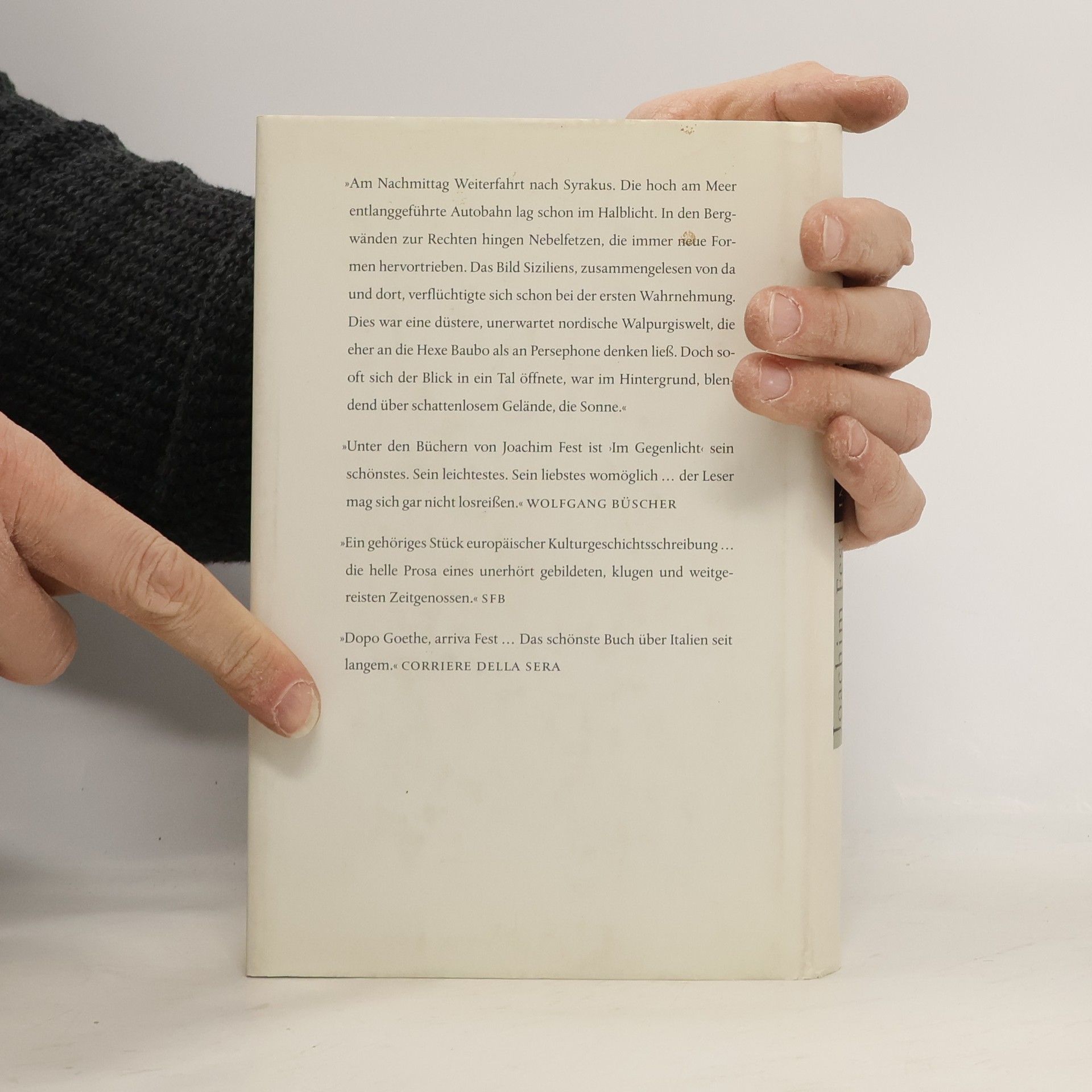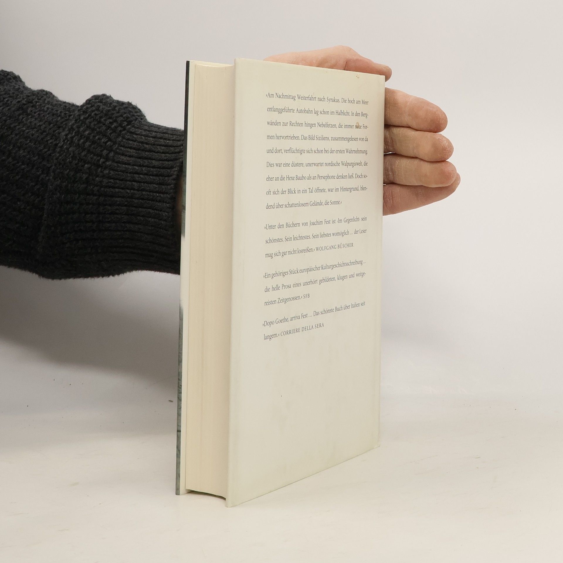 Kein Land hat die Sehnsucht der Deutschen mehr geweckt als Italien. Nirgendwo sonst gehen Vergangenheit und Gegenwart eine so spannungsreiche Verbindung ein, liegen Fremdes und scheinbar Vertrautes so eng nebeneinander. Joachim Fest hat dieses Land nicht auf der herkömmlichen Route bereist, sondern von Süden her. Dabei ist ein lebendiges, facettenreiches Bild entstanden. Stets wechseln sich scharfsichtige Beobachtungen mit pointierten Reflexionen oder packenden historischen Skizzen ab. Im Mittelpunkt jedoch stehen die Menschen, denen er begegnet ist. Ein brillant geschriebenes Reisejournal und zugleich viel mehr: ein literarisches Meisterwerk, kunstvoll komponiert und dennoch sehr persönlich. «Unter den Büchern von Joachim Fest ist ‹Im Gegenlicht› sein schönstes. Sein leichtestes. Sein liebstes womöglich … der Leser mag sich gar nicht losreißen.» (Wolfgang Büscher) «Das schönste Buch über Italien seit langem.» (Corriere della Sera)
