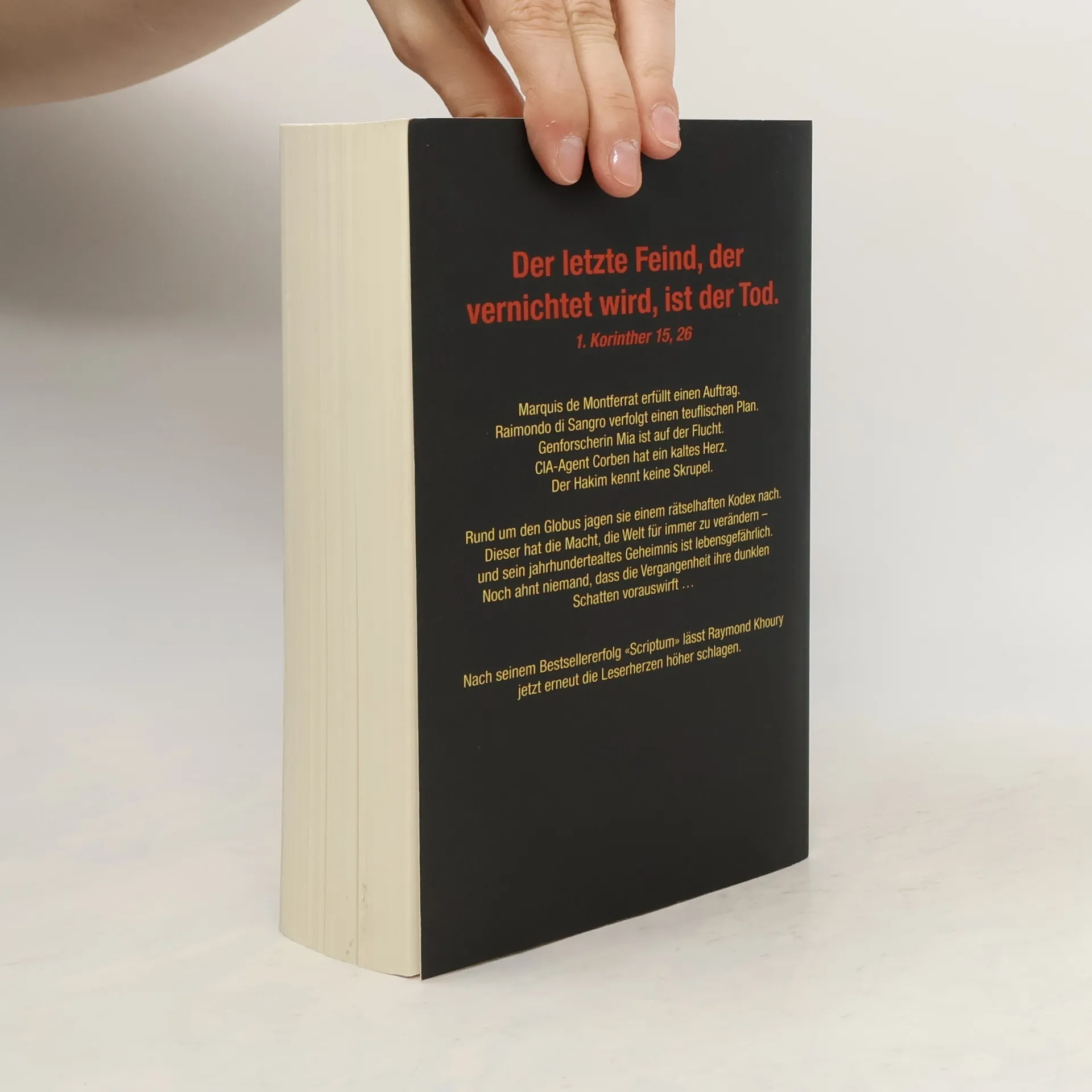 Der letzte Feind, der vernichtet wird, ist der Tod. 1. Korinther 15, 26Marquis de Montferrat erfüllt einen Auftrag.Raimondo di Sangro verfolgt einen teuflischen Plan.Genforscherin Mia ist auf der Flucht.CIA Agent Corben hat ein kaltes Herz.Der Hakim kennt keine Skrupel.Rund um den Globus jagen sie einem rätselhaften Kodex nach. Doch das Buch, das sie suchen, hat die Macht, die Welt für immer zu verändern – und sein jahrhundertealtes Geheimnis lebensgefährlich. Noch ahnt niemand, dass die Vergangenheit ihre dunklen Schatten voraus wirft …Nach seinem Bestsellererfolg „Scriptum“ lässt Raymond Khoury jetzt erneut die Leserherzen höher schlagen.