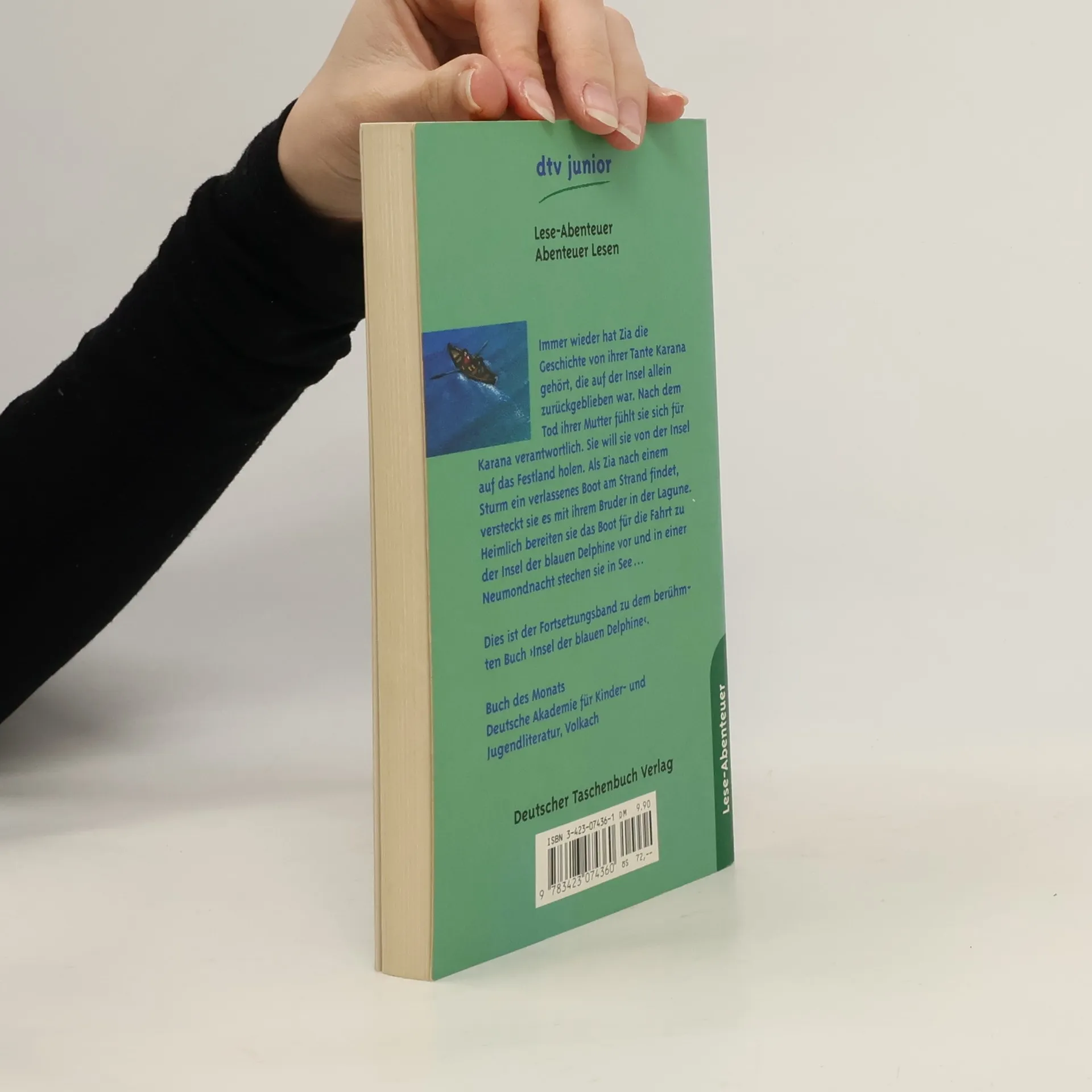 Immer wieder hat Zia die Geschichte, von ihrer Tante Karana gehört, die auf der Insel allein zurückgeblieben war. Nach dem Tod ihrer Mutter fühlt sie sich für Karana verantwortlich. Sie will sie von der Insel auf das Festland holen. Als Zia nach einem Sturm ein verlassenes Boot am Strand findet, versteckt sie es mit ihrem Bruder in der Lagune. Heimlich bereiten sie das Boot für die Fahrt zu der Insel der blauen Delphine vor und in einer Neumondnacht stechen sie in See. Buch des Monats. Deutsche Akademie für Kinder- und Jugendliteratur, Volkach. Fortsetzungsband zu dem Buch ›Insel der blauen Delphine‹, ebenfalls bei dtv junior erschienen.