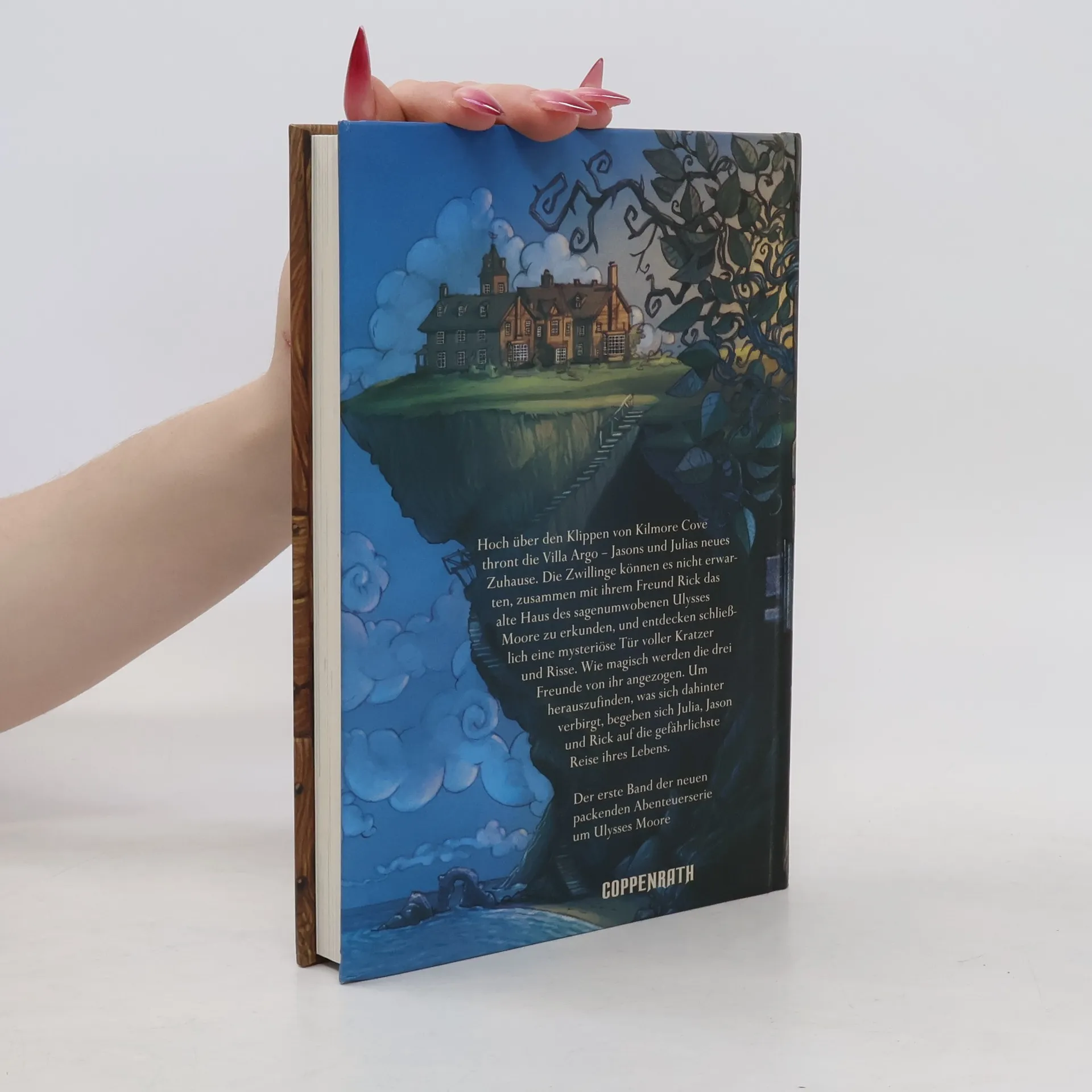 Ein Stapel verwitterter Hefte dokumentiert die unglaublich spannende Geschichte dreier junger Abenteurer. Von dem geheimnisvollen Autor weiß man nur eins mit Sicherheit, seinen Namen: Ulysses Moore. Hoch über den Klippen von Kilmore Cove thront die Villa Argo - Jason und Julias neues Zuhause. Die Zwillinge können es nicht erwarten, zusammen mit ihrem Freund Rick das alte Haus mit seinen rätselhaften Zimmern und verborgenen Gängen zu erkunden, und entdecken schließlich eine geheimnisvolle Tür. Wie magisch werden die drei Freunde von ihr angezogen. Um herauszufinden, was sich dahinter verbirgt, begeben sich Julia, Jason und Rick auf das größte und gefährlichste Abenteuer ihres Lebens.