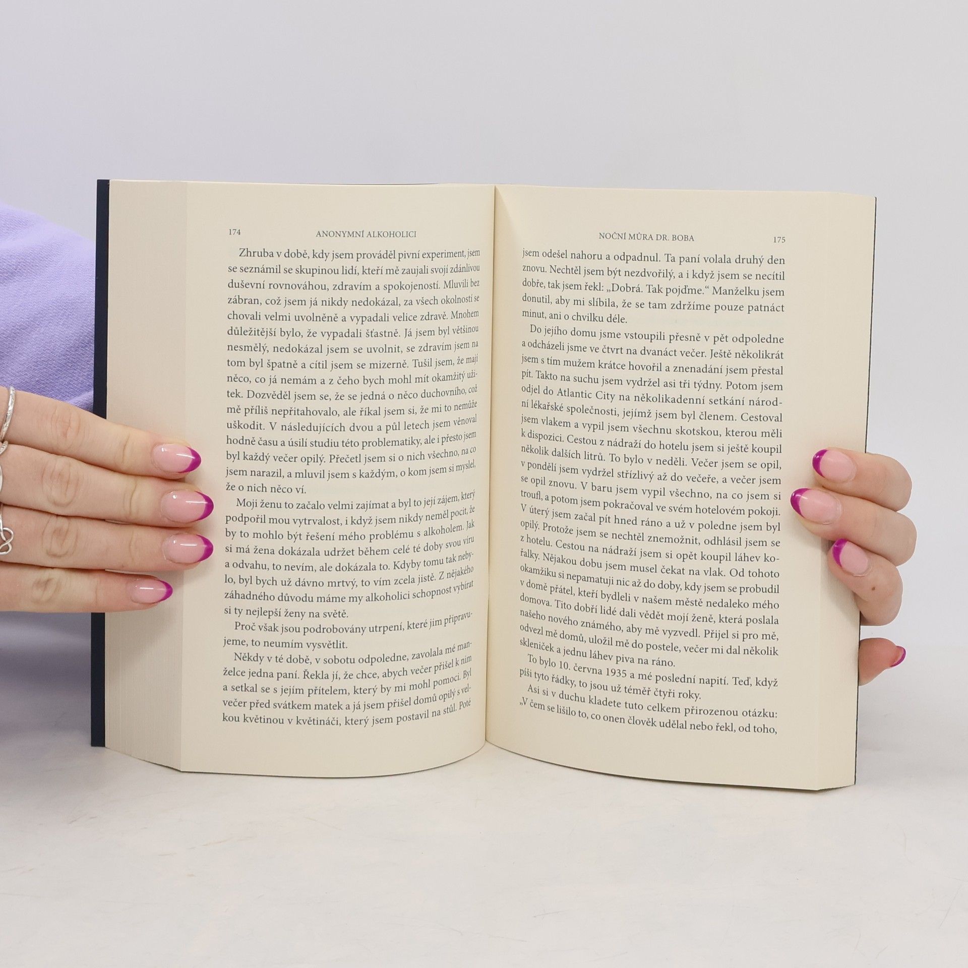 Překlad původního vydání textu z roku 1939 (4 roky poté,co bylo společenství AA založeno) nabízí jednoduchý i zajímavý,léty pravděpodobně i ověřený návod na léč- bu alkoholismu.Informuje o příčinách a podstatě alkoholismu,který je velmi závaž- nou chorobou,vysvětluje psychologii alkoholika a ukazuje,jak jednoduše AA pomáhá už léta šířit tyto informace po celém světě.Princip léčby spočívá v dodržování úplné abstinence,změně dosavadních návyků a přátel a podstatné motivaci pro nový život bez alkoholu.Zvláštní kapitoly jsou věnovány manželkám,dětem a zaměstnavate- lům alkoholiků.Kniha je doplněna životními osudy dvou zakládajících členů AA.