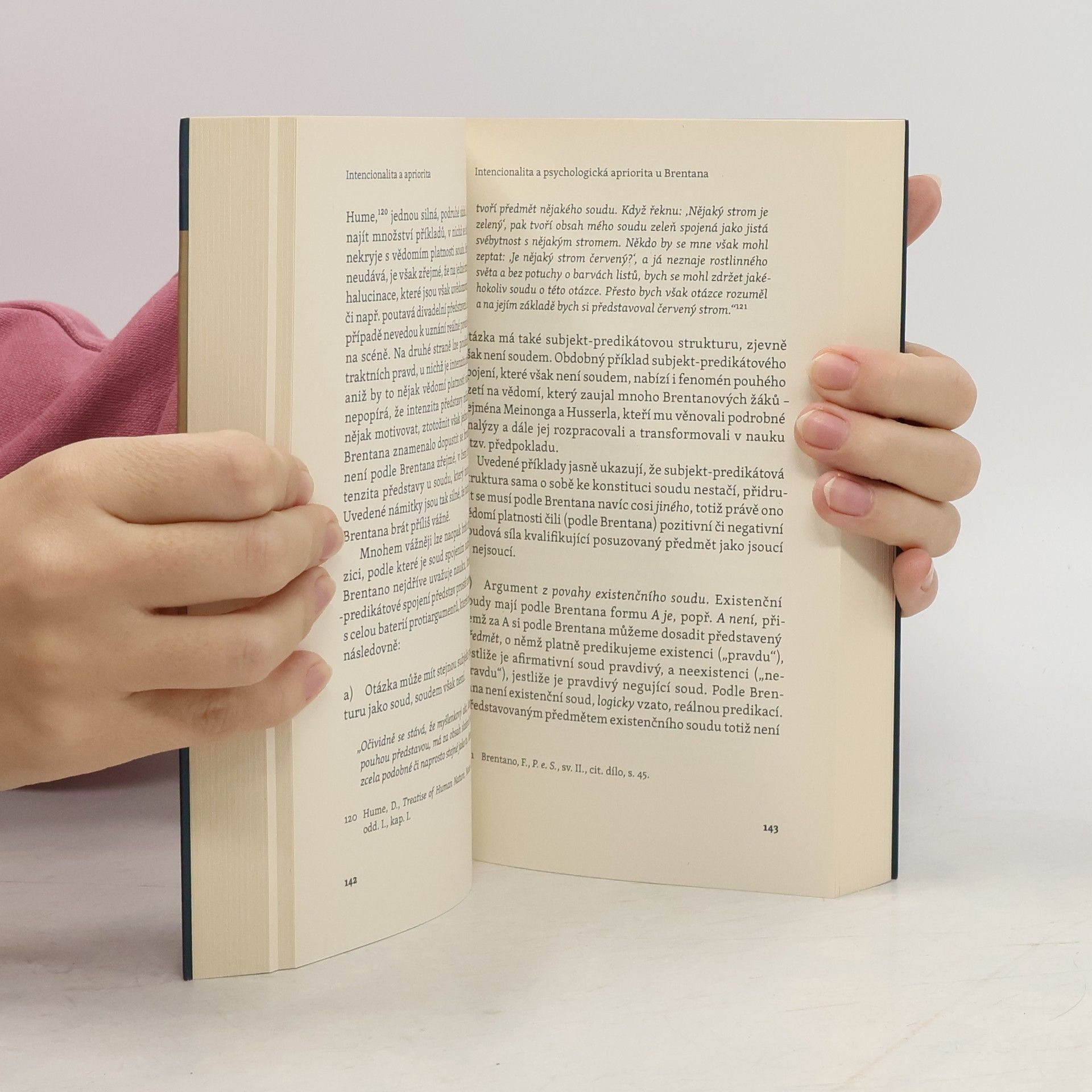 Kniha Intencionalita a apriorita. Studie ke vztahu Brentanovy a Husserlovy filosofie představuje základní pojmy Brentanovy deskriptivní, apriorně orientované psychologie s důrazem na tu část Brentanovy nauky, na kterou navázala fenomenologie Edmunda Husserla, přičemž rozebírá i některá aristotelská východiska Brentanova projektu. Diskutován je také přínos Twardowského nauky o obsahu a předmětu představ. V druhé části je podán stručný nástin rozvoje Husserlovy rané koncepce intencionality a myšlenky jejího apriorního popisu v období před publikováním Logických zkoumání, a to zejména rozlišení reprezentace a názoru, obsahu a předmětu, transformace Husserlova pojetí soudu, přijetí Bolzanových představ a vět o sobě, názoru obecnin a Husserlův pokus o řešení problému intencí neexistujících předmětů. Kromě analýzy usnadňující pochopení rané fenomenologie Edmunda Husserla chce kniha upozornit na Brentanovu filosofii, která byla významnou součástí německy psané filosofie v Čechách před druhou světovou válkou.