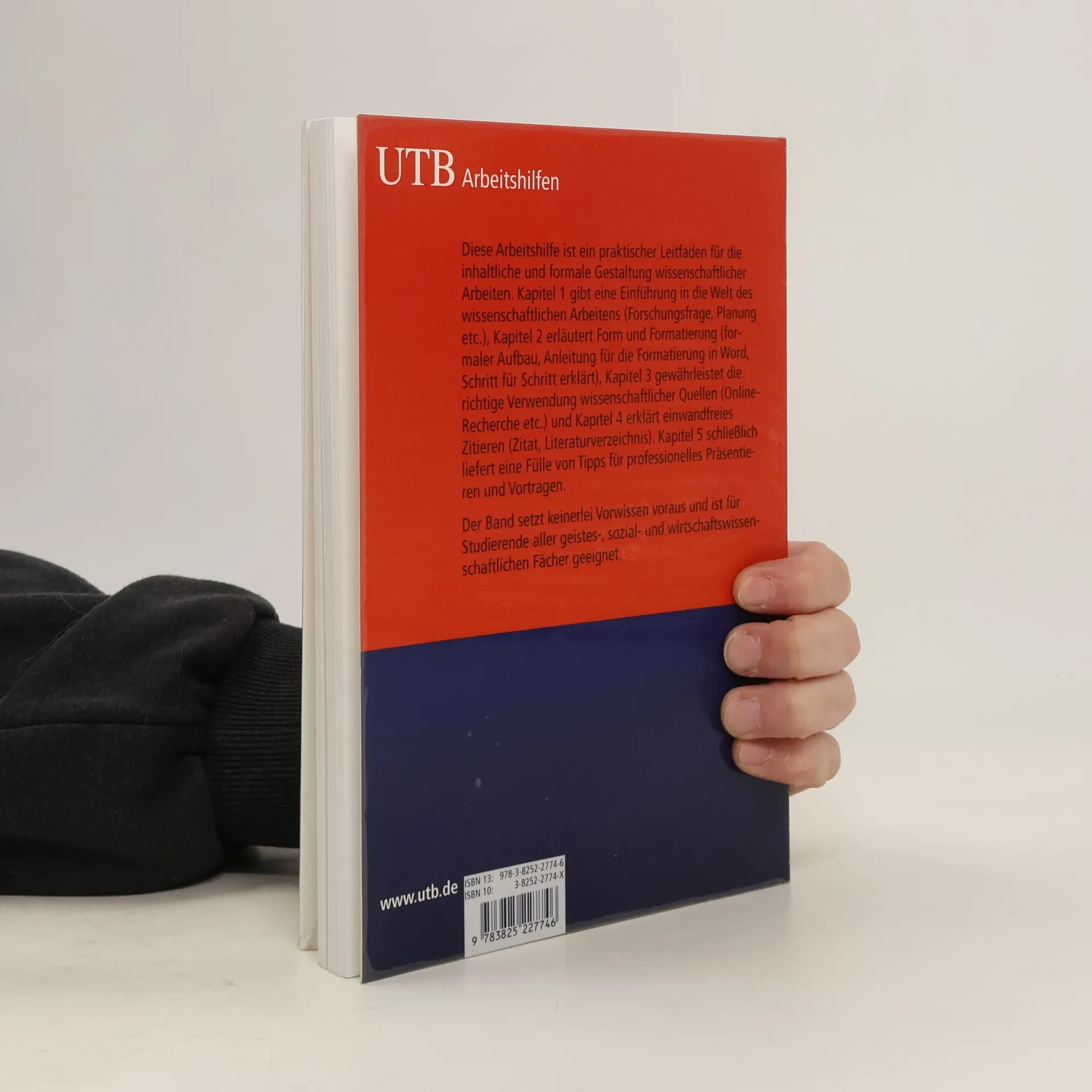 Diese Arbeitshilfe ist ein praktischer Leitfaden für die inhaltliche und formale Gestaltung wissenschaftlicher Arbeiten. Kapitel 1 gibt eine Einführung in die Welt des wissenschaftlichen Arbeitens (Forschungsfrage, Planung), Kapitel 2 erläutert Form und Formatierung (formaler Aufbau, Anleitung für die Formatierung in Word), Kapitel 3 behandelt ausführlich den Prozess des wissenschaftlichen Arbeitens und Recherchierens (Hypothesen, Argumentation, Quellen). Kapitel 4 erklärt einwandfreies Zitieren (Zitat, Literaturverzeichnis) und Kapitel 5 schließlich liefert eine Fülle von Tipps für professionelles Präsentieren und Vortragen. Der Band setzt keinerlei Vorwissen voraus und ist für Studierende aller geistes-, sozial- und wirtschaftswissenschaftlichen Fächer geeignet.