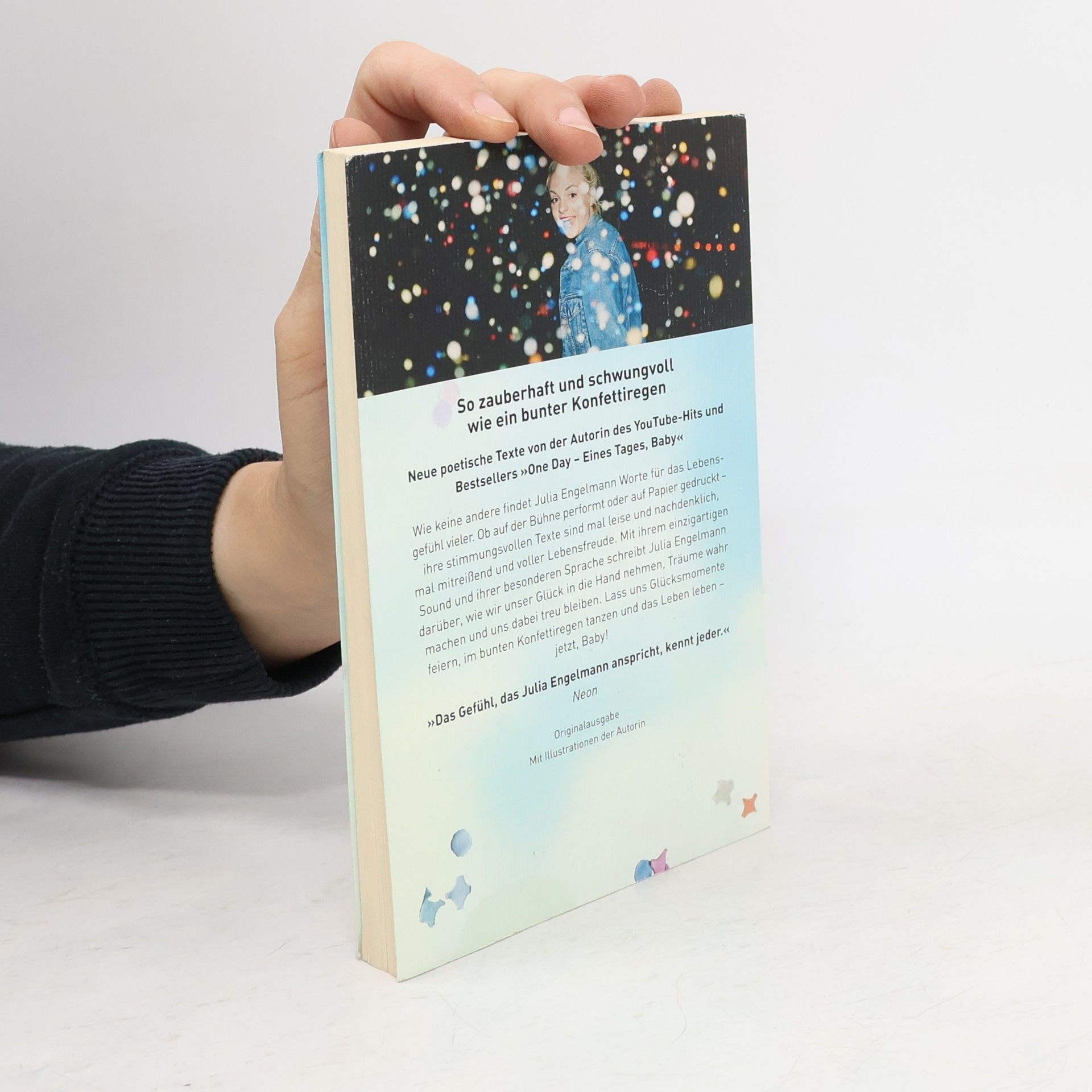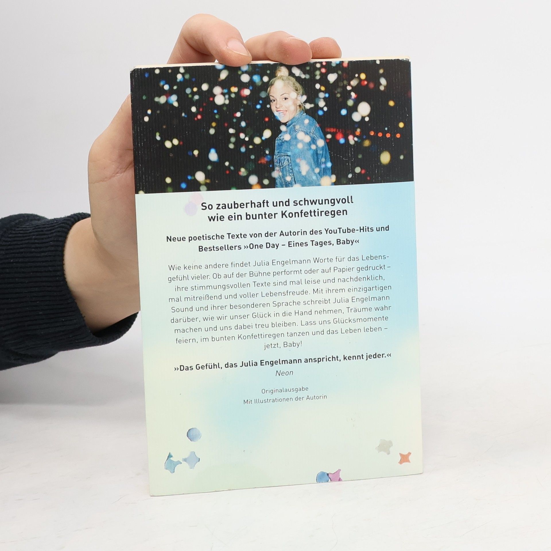 Seit ihr Slam „One Day“ ein sensationeller Interneterfolg wurde, fängt Julia Engelmann wie keine andere das Lebensgefühl einer ganzen Generation ein. Ob auf der Bühne performt oder auf Papier gedruckt – ihre Texte sind mitreißend, ehrlich und berührend. So auch in ihrem neuen Buch: Mit ihrem einzigartigen Sound und ihrer besonderen Sprache schreibt sie darüber, wie wir unser Glück in die Hand nehmen, Träume wahr machen und uns dabei treu bleiben. Lass uns Glücksmomente feiern, im bunten Konfettiregen tanzen und das Leben leben – jetzt, Baby! Ausstattung: mit farbigen Illustrationen