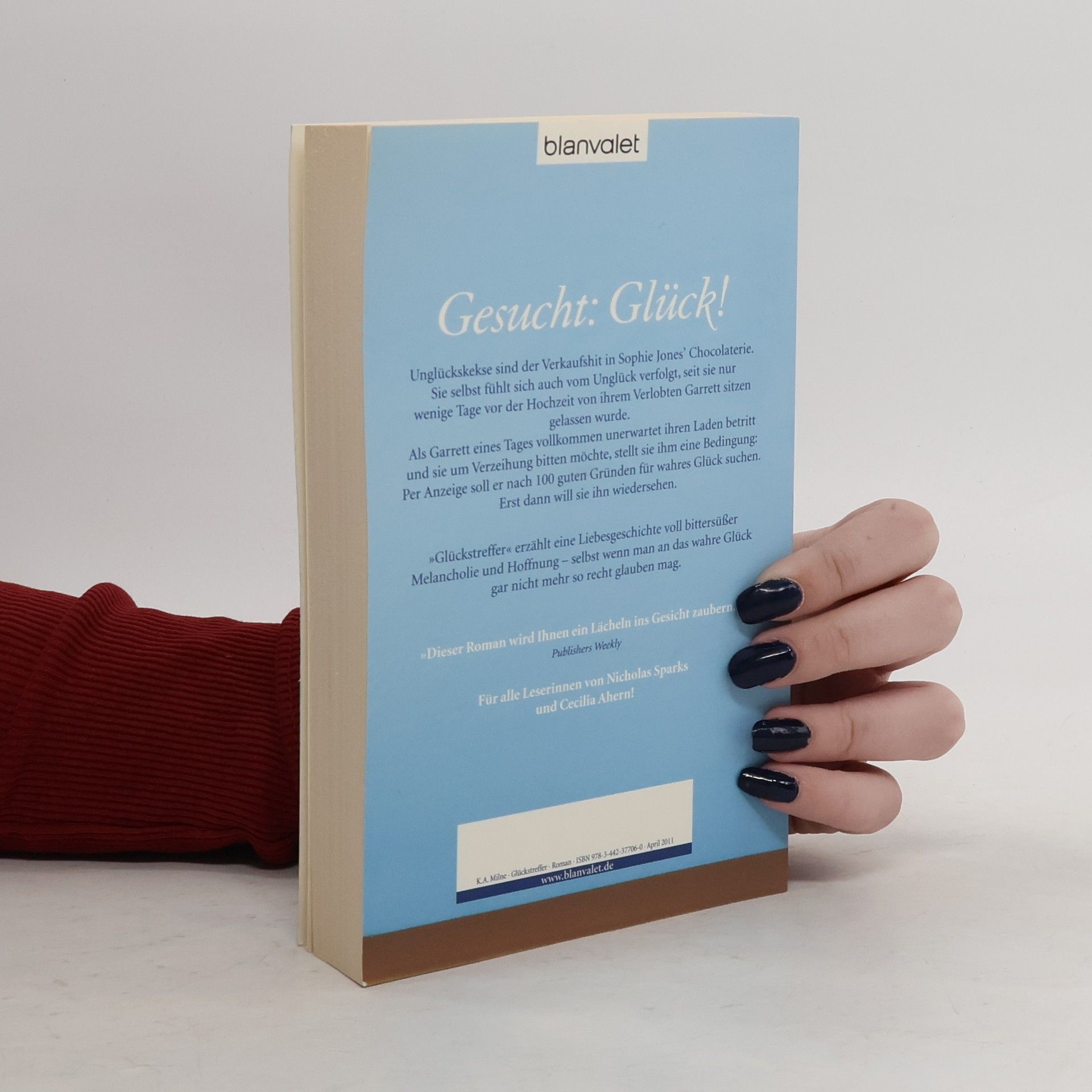 Eine Heldin wie 'Amélie', die von 'Tatsächlich Liebe' träumt und Glückskekse mit Bitter-Chocolat herstellt in einer Konditorei, die in 'Notting Hill' liegen könnte! 'Manche Menschen haben Glück in der Liebe. Du ganz bestimmt nicht.' - In Bitterschokolade getunkt, sind die Unglückskekse der Verkaufshit in Sophies Chocolaterie. Doch auch der Erfolg lässt das Herz der jungen Frau nicht höher schlagen, seit sie kurz vor der Hochzeit von Garrett verlassen wurde. Als Garrett eines Tages ihren Laden betritt und sie um Verzeihung bitten möchte, schlägt sie ihm einen Handel vor: Per Anzeige soll er nach dem wahren Glück suchen. Und erst wenn 100 gute Gründe, glücklich zu sein, vor ihr liegen, will sie ihn wiedersehen.