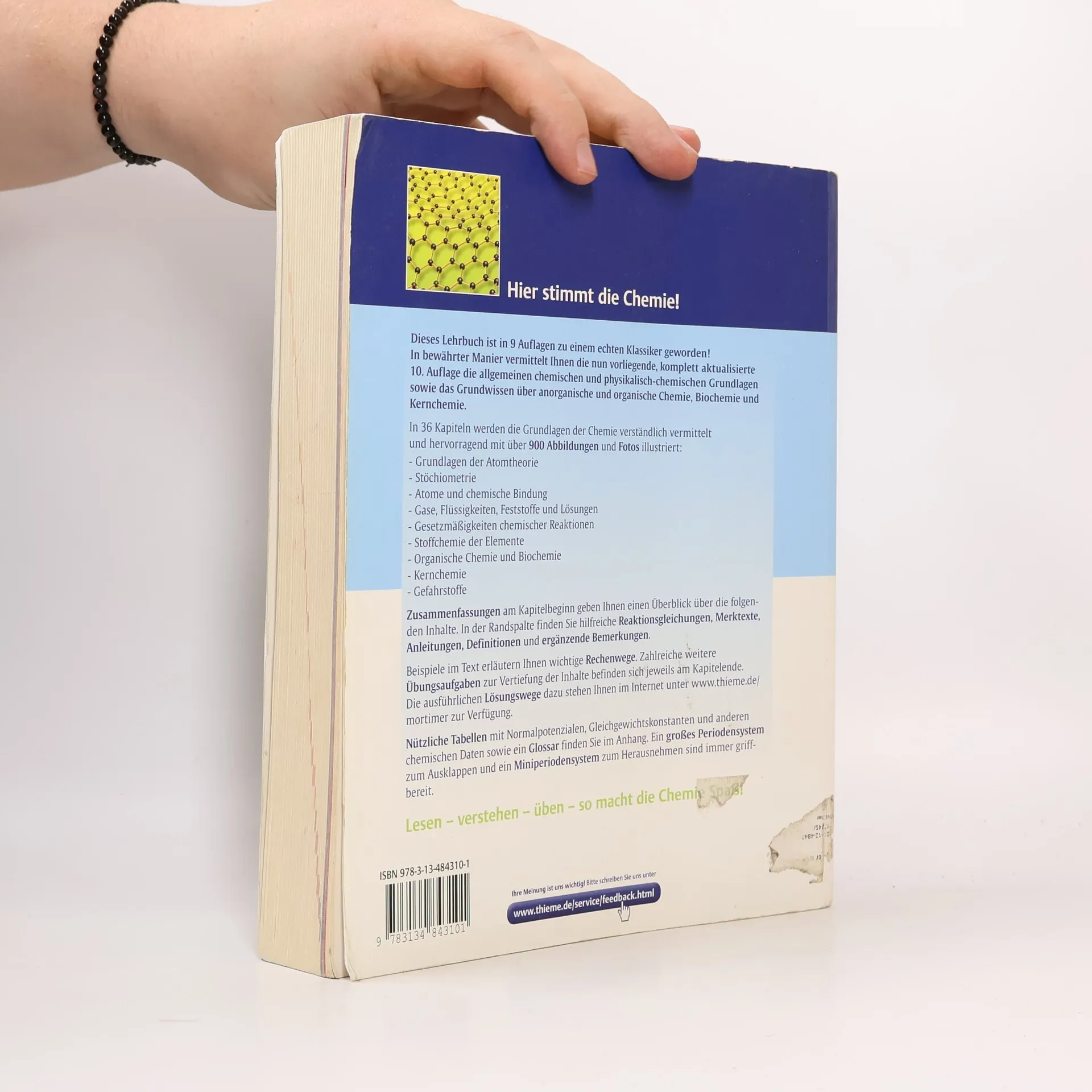 Die gesamte allgemeine und anorganische Chemie jetzt wieder hochaktuell Leicht verständlich und gut lesbar - 35 didaktisch aufbereitete Kapitel zu allgemeiner anorganischer Chemie - Grundwissen der Kernchemie, organischen Chemie und Biochemie - Ein zusätzliches Kapitel zum aktuellen Gefahrstoffrecht - transparent und praxisbezogen Anschaulich und übersichtlich gestaltet: - Komplett vierfarbig - Mit Beispielen zur Veranschaulichung von Rechenverfahren - Übungsaufgaben mit Lösungen zur effizienten Selbstkontrolle und Klausurvorbereitung - Ausführliche Lösungswege im Internet abrufbar - Tabellen mit Normalpotenzialen, Gleichgewichtskonstanten, thermodynamischen Daten und Bindungsenergien im Anhang - Glossar zum Nachschlagen der wichtigsten Begriffe - Ausklappbares Periodensystem und herausnehmbares Miniperiodensystem