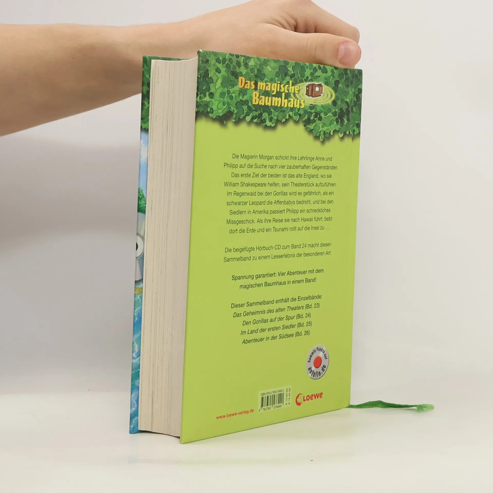 Das Buch ist bei deiner Buchhandlung vor Ort und bei vielen Online-Buchshops erhältlich! + Bücher, die Kinder gerne lesen wollen + Beliebte Themen: Abenteuer, Tiere und fremde Länder + Hochwertiges Hardcover + Mit vielen Illustrationen + Bereits über 10 Millionen verkaufte Bücher der Baumhaus-Reihe + Ausgewogenes Text-Bild-Verhältnis + Große Schrift + Kurze Kapitel + Die Magierin Morgan schickt ihre Lehrlinge Anne und Philipp auf die Suche nach vier besonderen Zaubern. Ihr erstes Ziel ist das alte England, in dem sie William Shakespeare helfen, sein Theaterstück aufzuführen. Im Regenwald bei den Gorillas wird es gefährlich, als ein schwarzer Leopard die Affen-Babys bedroht, und bei den ersten Siedlern in Amerika passiert Philipp ein schreckliches Missgeschick. Als ihre Reise sie nach Hawaii führt, bebt dort die Erde und eine Tsunami-Welle rollt auf die Insel zu. Die beigefügte Hörbuch-CD zum Band 24 macht diesen Sammelband zu einem Leseerlebnis der besonderen Art. Dieser Sammelband enthält die Einzelbände: „Das Geheimnis des alten Theaters“ (Bd. 23) „Den Gorillas auf der Spur“ (Bd. 24) „Im Land der ersten Siedler“ (Bd. 25) „Abenteuer in der Südsee“ (Bd. 26) Die beliebte Kinderbuch-Reihe von Bestsellerautorin Mary Pope Osborne! Die Geschwister Anne und Philipp reisen mit dem magischen Baumhaus durch die Zeit. Sie erleben spannende Abenteuer, entdecken ferne Länder und lernen viele berühmte Persönlichkeiten kennen.