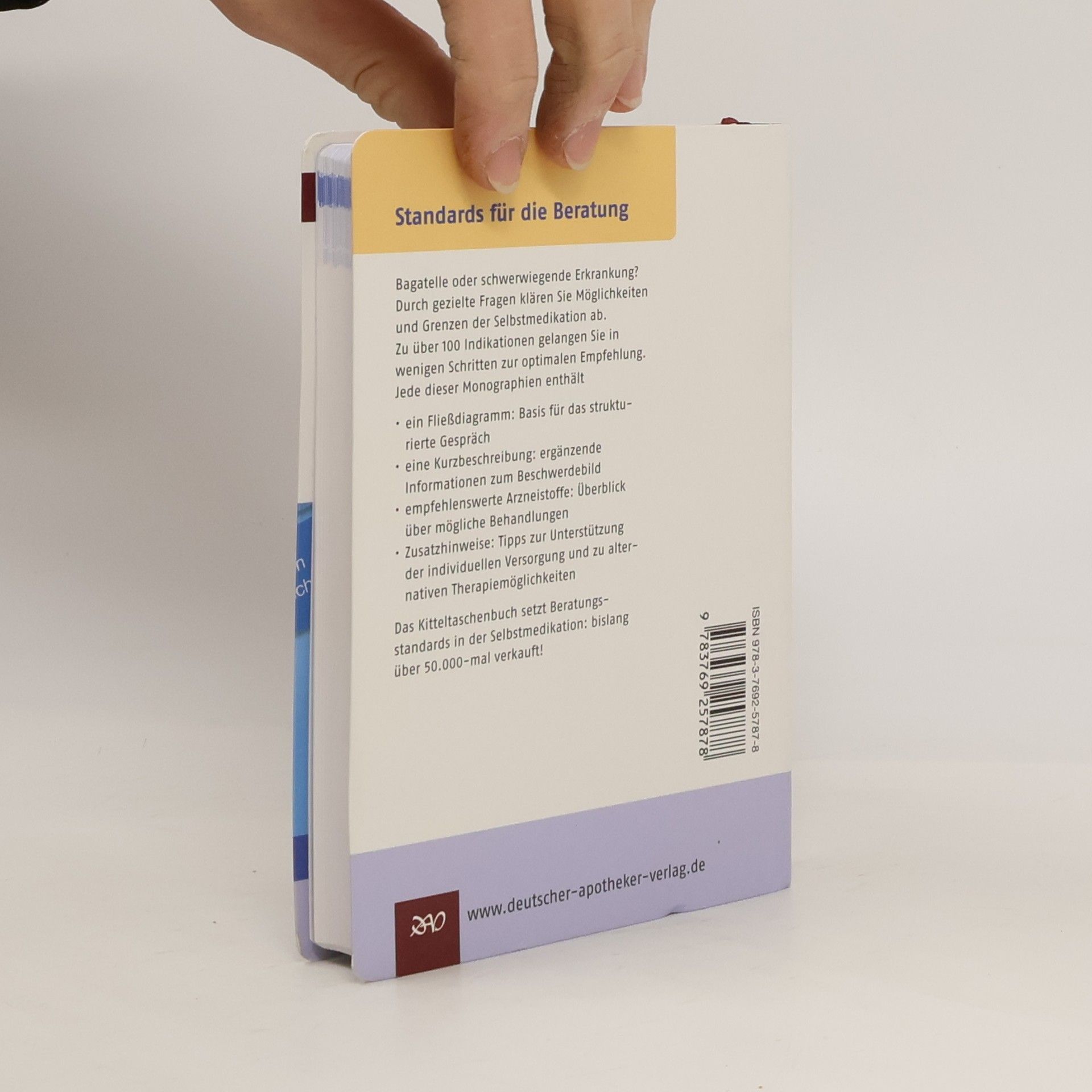 Standards für die Beratung Bagatelle oder schwerwiegende Erkrankung? Durch gezielte Fragen klären Sie Möglichkeiten und Grenzen der Selbstmedikation ab. Zu über 100 Indikationen gelangen Sie in wenigen Schritten zur optimalen Empfehlung. Jede dieser Monographien enthält ein Fließdiagramm: Basis für das strukturierte Gespräch eine Kurzbeschreibung: ergänzende Informationen zum Beschwerdebild empfehlenswerte Arzneistoffe: Überblick über mögliche Behandlungen Zusatzhinweise: Tipps zur Unterstützung der individuellen Versorgung und zu alternativen Therapiemöglichkeiten Das Kitteltaschenbuch setzt Beratungsstandards in der Selbstmedikation: bislang über 50.000-mal verkauft!