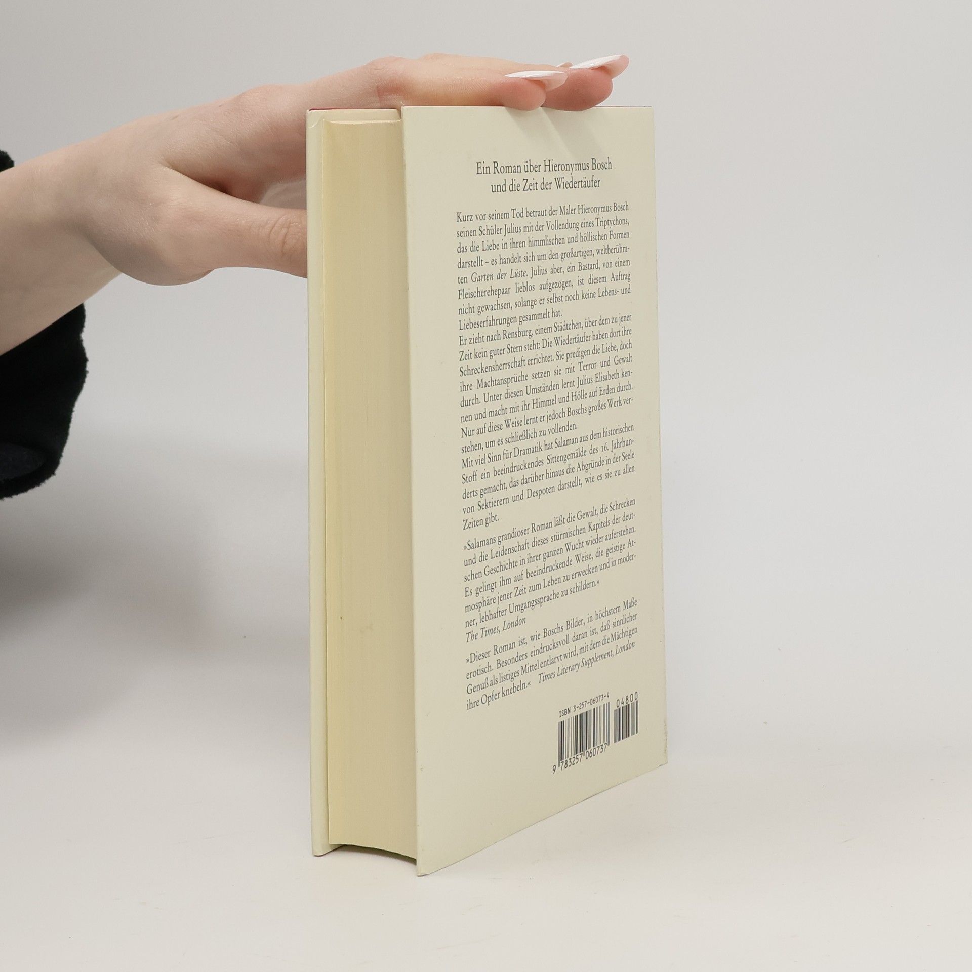 In einer deutschen Kleinstadt erlebt Julius, ein Schüler des Malers Hieronymus Bosch, die Schreckensherrschaft der Wiedertäufer, einer Glaubensgemeinschaft, die die Liebe predigt, aber mit Hilfe von Terror und Gewalt ihre Machtansprüche durchsetzen will. "Salamans grandioser Roman läßt die Gewalt, die Schrecken und die Leidenschaft dieses stürmischen Kapitels der deutschen Geschichte in ihrer ganzen Wucht wiederauferstehen. Es gelingt ihm auf beeindruckende Weise, die geistige Atmosphäre jener Zeit zum Leben zu erwecken und in moderner, lebhafter Umgangssprache zu schildern." (The Times, London.)