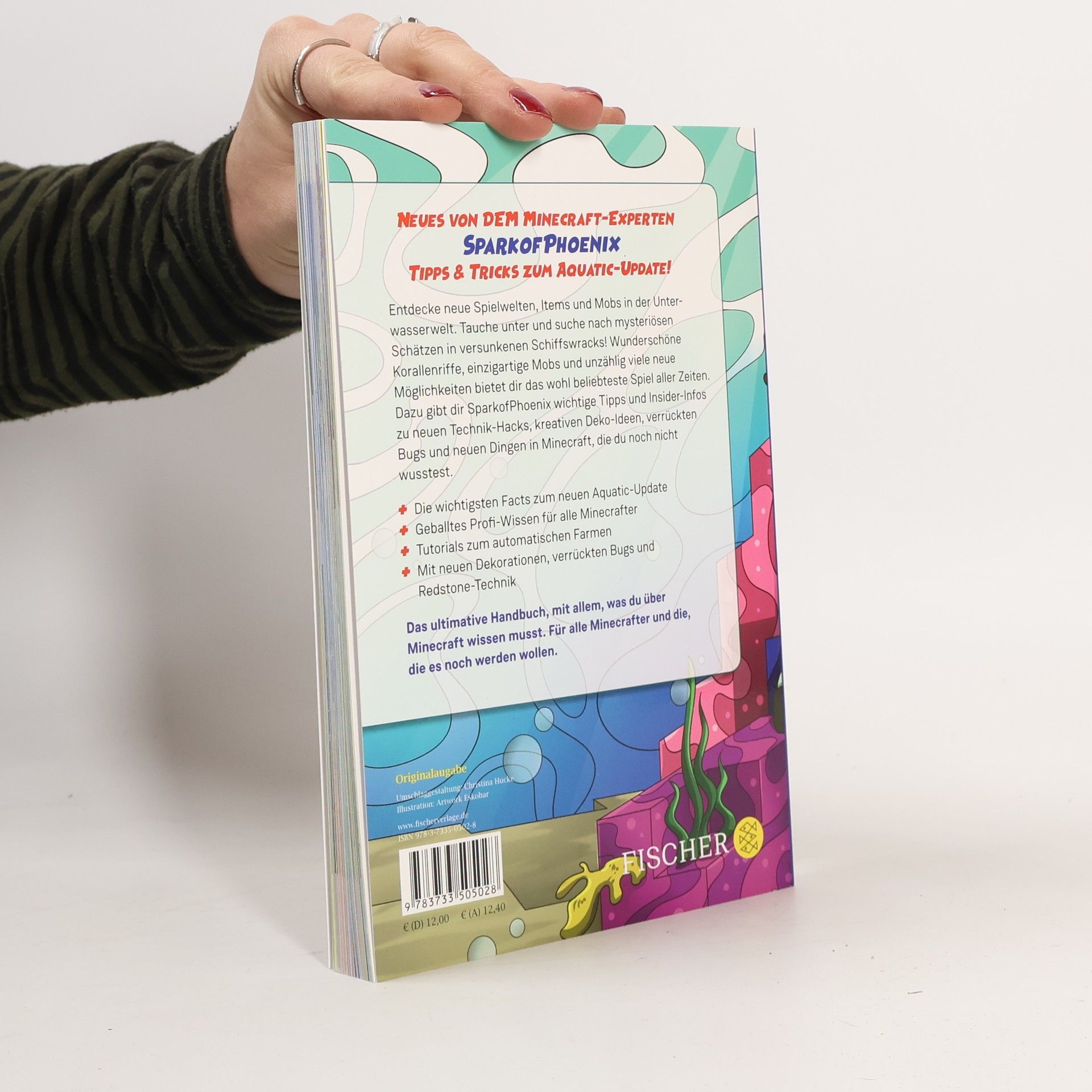 Das ultimative Handbuch, mit allem, was du über Minecraft wissen musst. Für alle Minecrafter, und die, die es noch werden wollen. SparkofPhoenix präsentiert geballtes Minecraft-Wissen und brandneue Facts zum spannenden Aquatic-Update! Entdecke neue Spielwelten, Items und Mobs in der Unterwasserwelt. Tauche unter und suche nach mysteriösen Schätzen in versunkenen Schiffswracks! Wunderschöne Korallenriffe, einzigartige Mobs und unzählig viele neue Möglichkeiten bietet dir das wohl beliebteste Spiel aller Zeiten. Dazu gibt dir SparkofPhoenix wichtige Tipps und Insider-Infos zu neuen Technik-Hacks, kreativen Deko-Ideen, verrückten Bugs und neuen Dingen in Minecraft, die du noch nicht wusstest. · Die wichtigsten Facts zum neuen Aquatic-Update · Geballtes Profi-Wissen für alle Minecrafter · Tutorials zum automatischen Farmen · Mit neuen Dekorationen, verrückten Bugs und Redstone-Technik Alle Bände der bisher erschienenen Minecraft-Bücher von SparkofPhoenix: SparkofPhoenix: 200 Dinge in Minecraft, die du noch nicht wusstest. Neues Minecraft-Wissen SparkofPhoenix: Das ultimative Handbuch für alle Minecrafter. Neues Profi-Wissen SparkofPhoenix: Neues Minecraft-Wissen zum Dorf-Update SparkofPhoenix: Spark und das Geheimnis der Pillager Kein offizielles Minecraft-Produkt. Nicht von Mojang genehmigt oder mit Mojang verbunden.