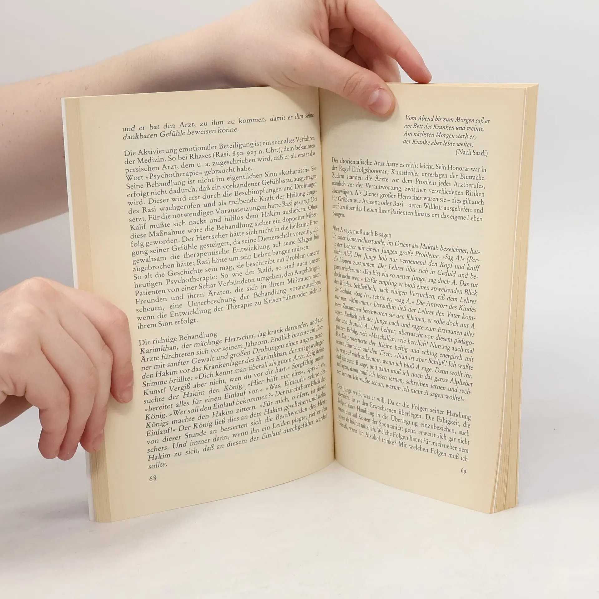 Fast einhundert gleichnishafte orientalische Geschichten sind in diesem Band versammelt und in Beziehung zu Fallbeispielen aus der psychotherapeutischen Praxis gesetzt. Es sind unterhaltende Geschichten, die jedoch nicht nur unterhalten, es sind Lehrstücke, die nicht nur lehren, es sind literarische Miniaturen, die nicht nur um der Kunst willen erzählt und niedergeschrieben wurden - es sind Gleichnisse zur Lebenshilfe, die jeder seinen eigenen Bedürfnissen entsprechend anwenden kann.