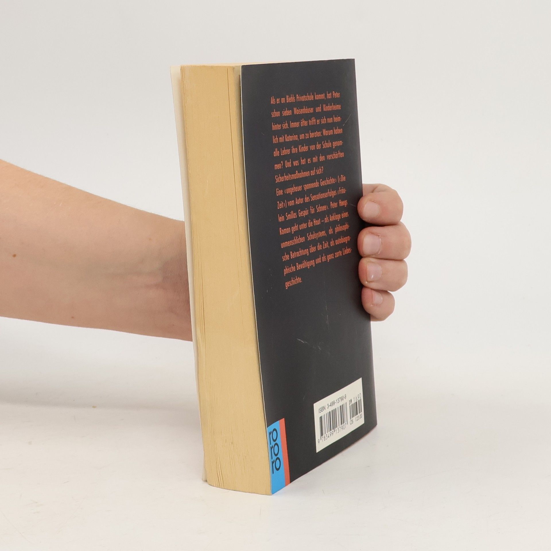 Als er an Biehls Privatschule kommt, hat Peter schon sieben Waisenhäuser und Kinderheime hinter sich. Immer öfter trifft er sich nun heimlich mit Katarina, um zu beraten: Warum haben alle Lehrer ihre Kinder von der Schule genommen ? Und was hat es mit den verschärften Sicherheitsmaßnahmen auf sich? Peter Hoegs Roman geht unter die Haut - als Anklage eines unmenschlichen Schulsystems, als philosophische Betrachtung über die Zeit, als autobiographische Bewältigung und als ganz zarte Liebesgeschichte.