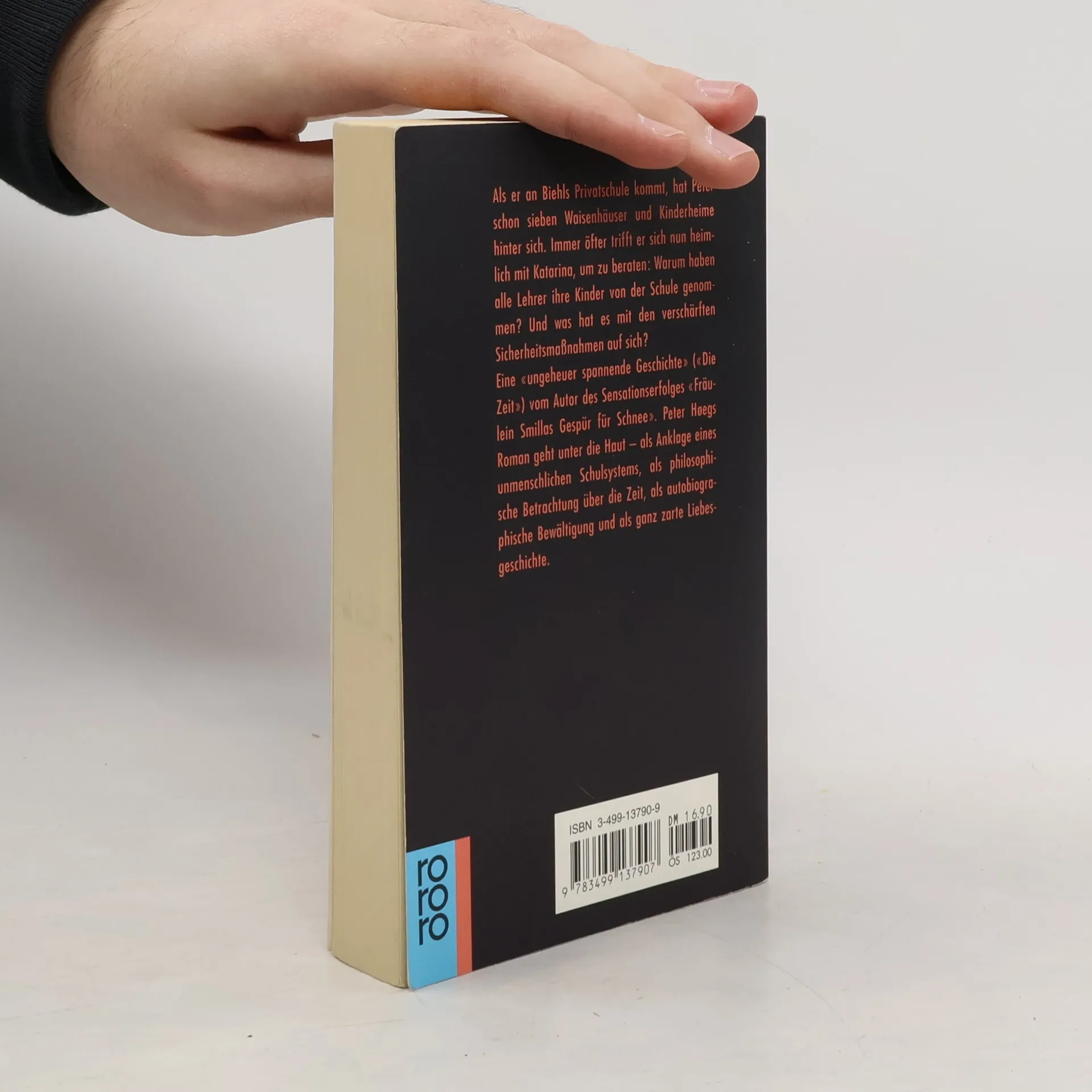 Als er an Biehls Privatschule kommt, hat Peter schon sieben Waisenhäuser und Kinderheime hinter sich. Immer öfter trifft er sich nun heimlich mit Katarina, um zu beraten: Warum haben alle Lehrer ihre Kinder von der Schule genommen ? Und was hat es mit den verschärften Sicherheitsmaßnahmen auf sich? Peter Hoegs Roman geht unter die Haut - als Anklage eines unmenschlichen Schulsystems, als philosophische Betrachtung über die Zeit, als autobiographische Bewältigung und als ganz zarte Liebesgeschichte.