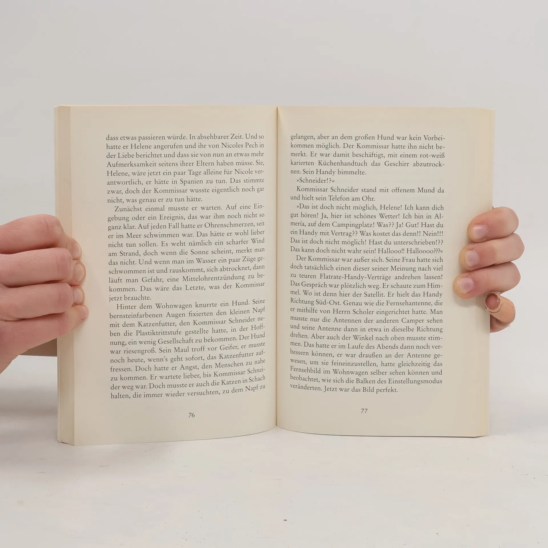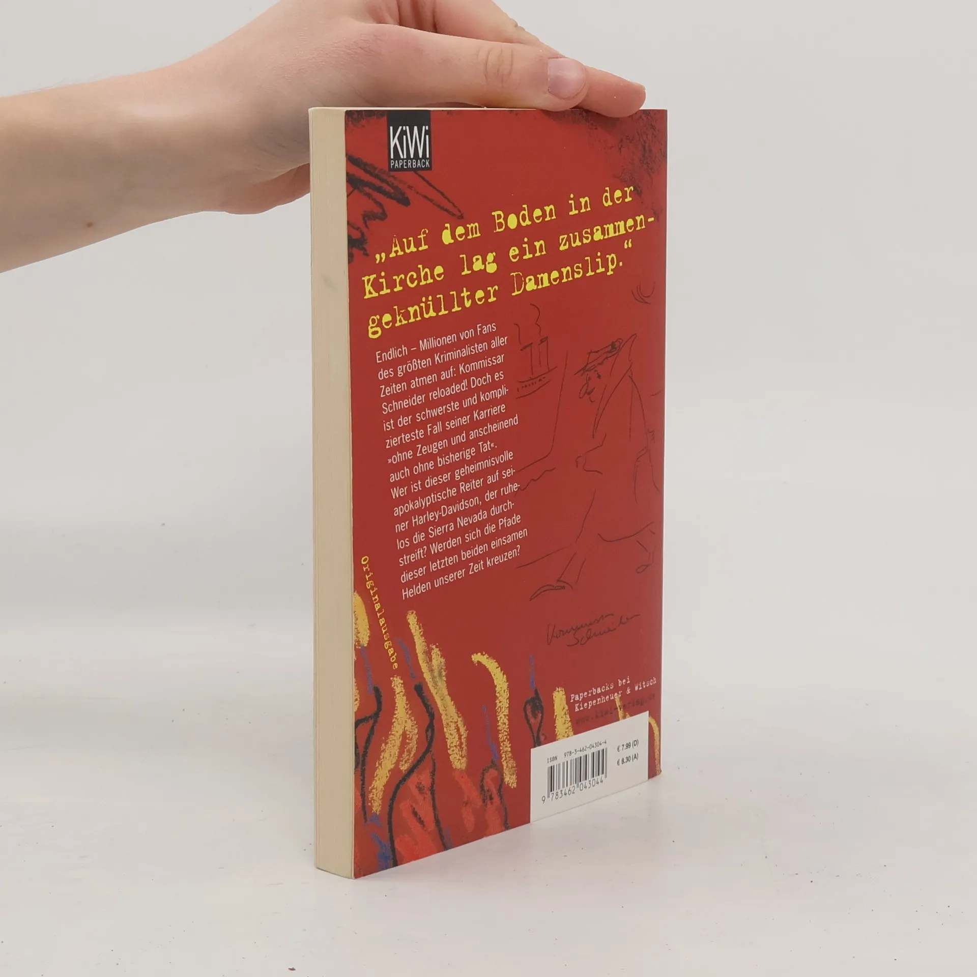 »Auf dem Boden in der Kirche lag ein zusammengeknüllter Damenslip.«»Das laute Geknatter kam von da drüben! Ein harscher Strahl Licht rannte über die mit Reliefs bekörperte Wand des Gotteshauses und verformte sich zu einem grellen Blitzezucken, genau über dem großen Fenster, wo die Jungfrau Maria ihr Kind im Arm wiegt, dann verschwand das Gleißen, und plötzlich, ohne Vorwarnung, raste die Silhouette eines Höllenmotorrads durch das Hauptportal, riss das Becken mit dem Weihwasser mit sich und sprang über den Altar, landete scheppernd an der Stirnwand, wo die Kerzen diesen unheimlichen, brennenden Schein fabriziert hatten, doch nun war das gesamte Kerzenfeuer schlagartig verworfen.«Wer ist der Akteur dieses wilden Auftritts? Vielleicht ein dummer Bruder des Teufels? Wo spielt denn dieses Inferno? In einer wüstenähnlichen Gegend im spanischen Hochland? Vielleicht aber später auch in Köln oder Südamerika? Das ganze Buch ist eine sehr mystische Angelegenheit, bei der man nicht viel voraussagen kann – nicht einmal, ob der Kommissar Schneider auftreten wird. Alles bleibt mysteriös und vage …»Der Meister der sinnlosen Sätze« Frankfurter Allgemeine Zeitung