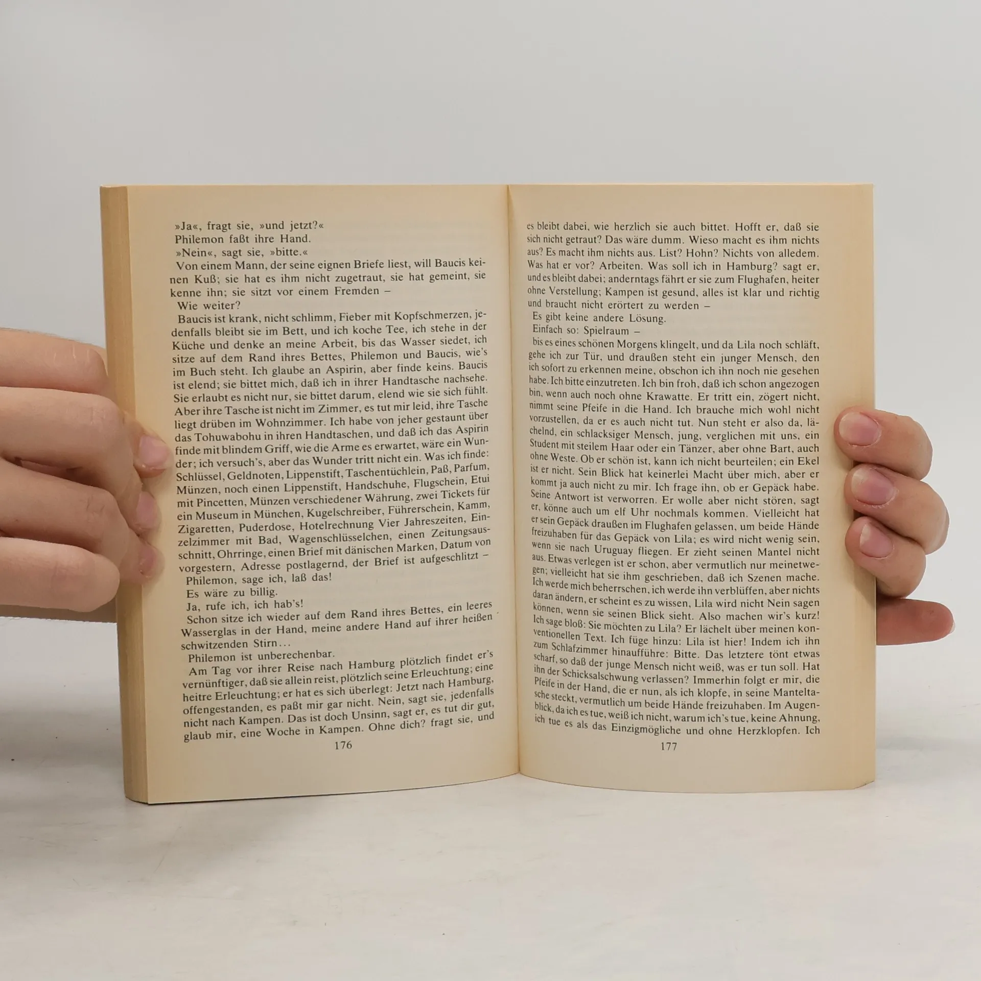 Der Erzähler erfindet (»Ich stelle mir vor:«) mögliche Lebensgeschichten dreier Personen: Da ist Gantenbein, der einen Blinden spielt, um so genauer seine Umwelt beobachten zu können. Oder da ist Enderlin, der immer »ein fremder Herr« bleibt. Auch Svoboda muß die Erfahrung machen, daß Liebe und Ehe endlich sind. Übrig im Spiel der erdichteten Rollen bleibt: Gantenbein.
