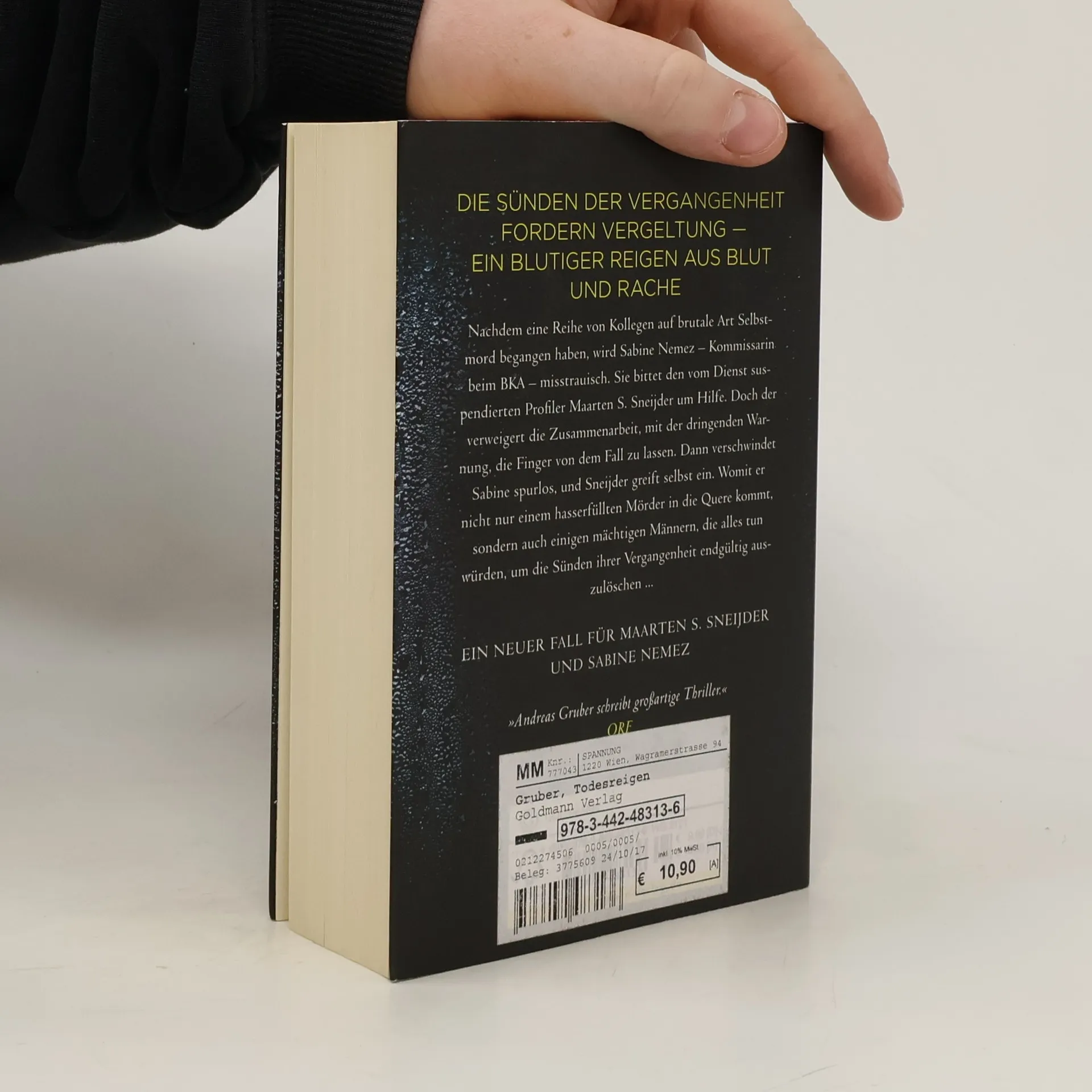 Sneijder und Nemez ermitteln wieder. Nachdem eine Reihe von Kollegen auf brutale Art Selbstmord begangen haben, wird Sabine Nemez – Kommissarin und Ausbilderin beim BKA – misstrauisch. Vieles weist auf eine jahrzehntealte Verschwörung und deren von Rache getriebenes Opfer hin. Sabine bittet ihren ehemaligen Kollegen, den vom Dienst suspendierten Profiler Maarten S. Sneijder, um Hilfe. Doch der verweigert die Zusammenarbeit, mit der dringenden Warnung, die Finger von dem Fall zu lassen. Dann verschwindet Sabine spurlos, und Sneijder greift selbst ein. Womit er nicht nur einem hasserfüllten Mörder in die Quere kommt, sondern auch seinen einstigen Freunden und Kollegen, die alles tun würden, um die Sünden ihrer Vergangenheit endgültig auzulöschen ... Der vierte Fall für Sneijder und Nemez.