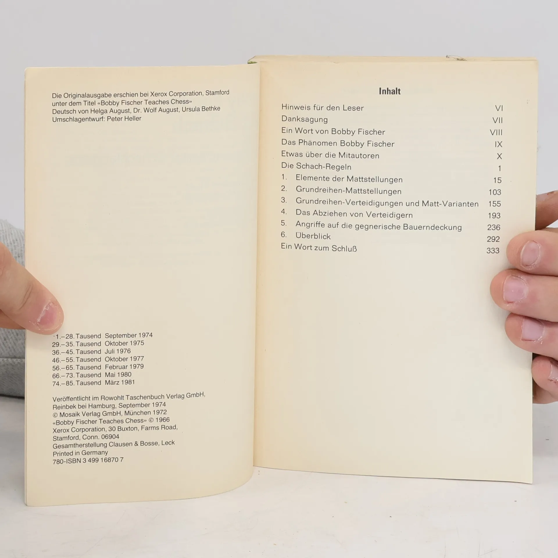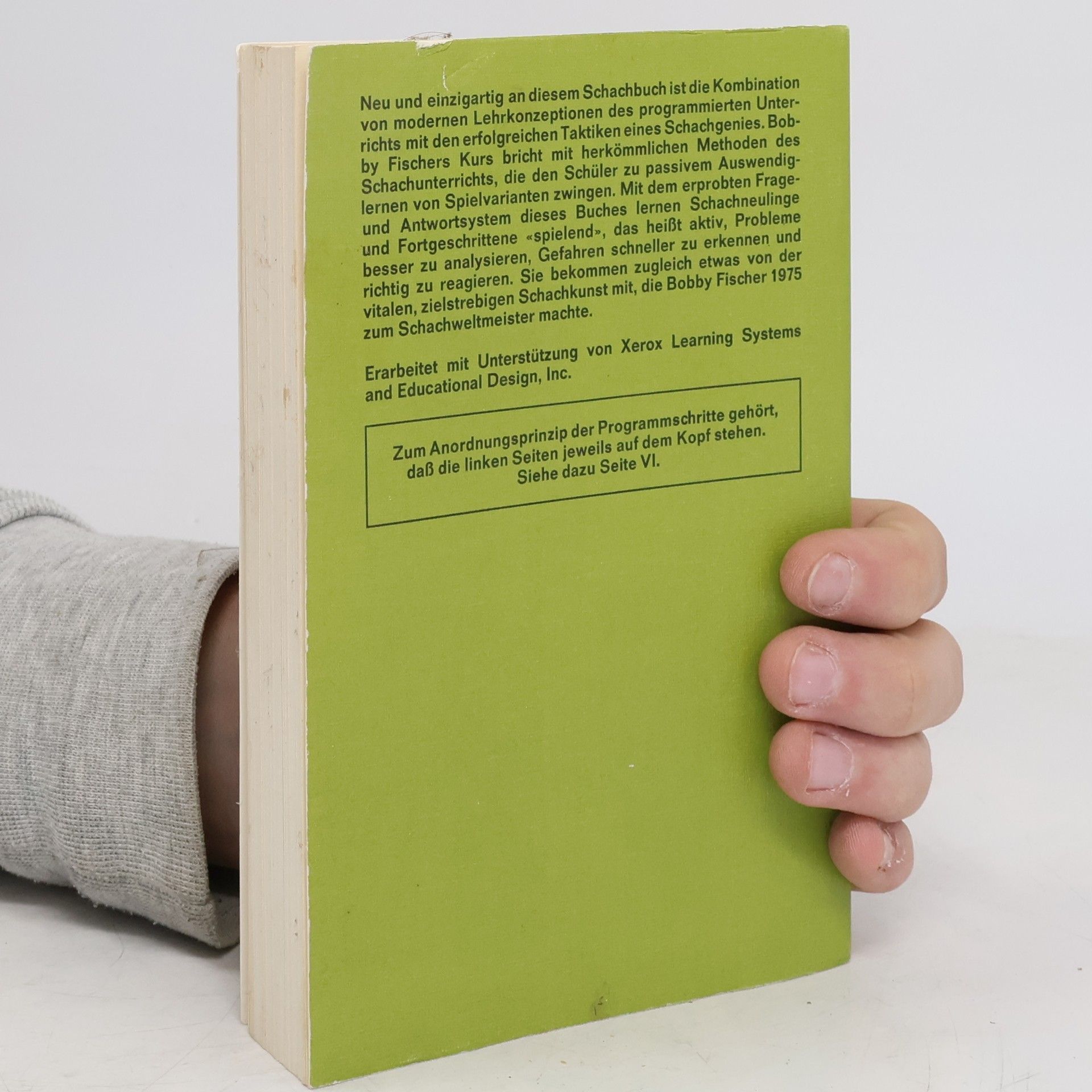 Neu und einzigartig an diesem Schachbuch ist die Kombination von modernen Lehrkonzeptionen des programmierten Unterrichts mit den erfolgreichen Taktiken des Schachgenies. Bobby Fischers Kurs bricht mit herkömmlichen Methoden des Schachunterrichts, die den Lernenden zu passivem Auswendig- lernen von Spielvarianten verleiten. Er schult die entscheidende Fähigkeit für erfolgreiches Spiel, rasch das Wesentliche einer Stellung und den angemessenen Zug zu erfassen. Gleichzeitig bekommen die Leser etwas von der vitalen, zielstrebigen Schachkunst mit, die Bobby Fischer zum einst jüngsten Schachgroßmeister der Geschichte machte. Das Buch bringt auf jeder Seite Aufgaben mit wachsendem Schwierigkeitsgrad, deren Lösung der Übende nach dem Umblättern kontrollieren kann und erläutert findet. Zum Anordnungsprinzip der Programmschritte gehört, dass die linken Seiten jeweils auf dem Kopf stehen. Im Anhang findet der Leser die von GM Wolfgang Unzicker kommentierten Partien von der Weltmeisterschaft 1972 zwischen Bobby Fischer und Boris Spasski in Reykjavik. Hinweis zur Gestaltung und Handhabung des Buches: KEIN Druckfehler! Es ist völlig beabsichtigt, dass die linken Seiten auf dem Kopf stehen. Denn so ist gewährleistet, dass man nicht voreilig in die Lösung blicken kann. Sie arbeiten einmal das Buch bis hinten durch, drehen es und arbeiten weiter. Dieses System ist eine Eigenart des Buches und von Bobby Fischer erdacht.