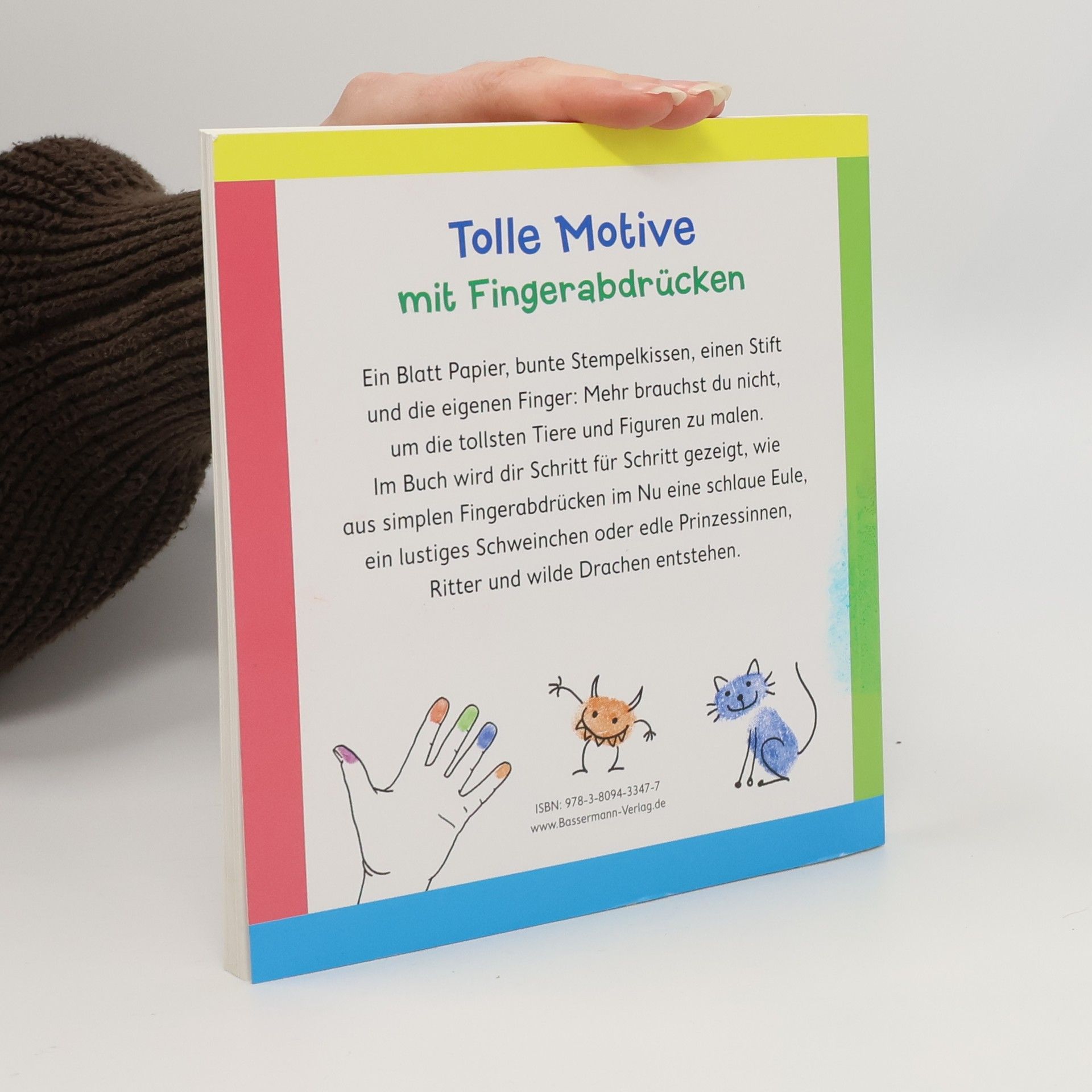 Tolle Motive mit den Fingern stempeln Ein Blatt Papier, bunte Stempelkissen, einen Stift und die eigenen Finger: Mehr braucht es nicht, um die tollsten Tiere und Figuren zu malen: Aus simplen Fingerabdrücken werden im Nu eine schlaue Eule, ein lustiges Schweinchen oder edle Prinzessinnen, Ritter und wilde Drachen. Im Buch wird Schritt für Schritt gezeigt, wie es geht. Und damit die kleinen Künstler ab 5 Jahren gleich loslegen können, sind dem Anleitungsbuch acht Stempelfarben beigelegt.Wichtig: Diese Fingerstempelfarben wurden gemäß der europäischen Produktsicherheitsrichtlinien getestet und für unbedenklich eingestuft. Ein Effekt der immer höheren Sicherheitsanforderungen ist leider, dass sich die Farben schlechter abwaschen lassen. Mit etwas Speiseöl lassen sich die Farben (unserer Erfahrung nach) jedoch leichter von den Händen entfernen. Ausstattung: acht getestete Stempelfarben.
