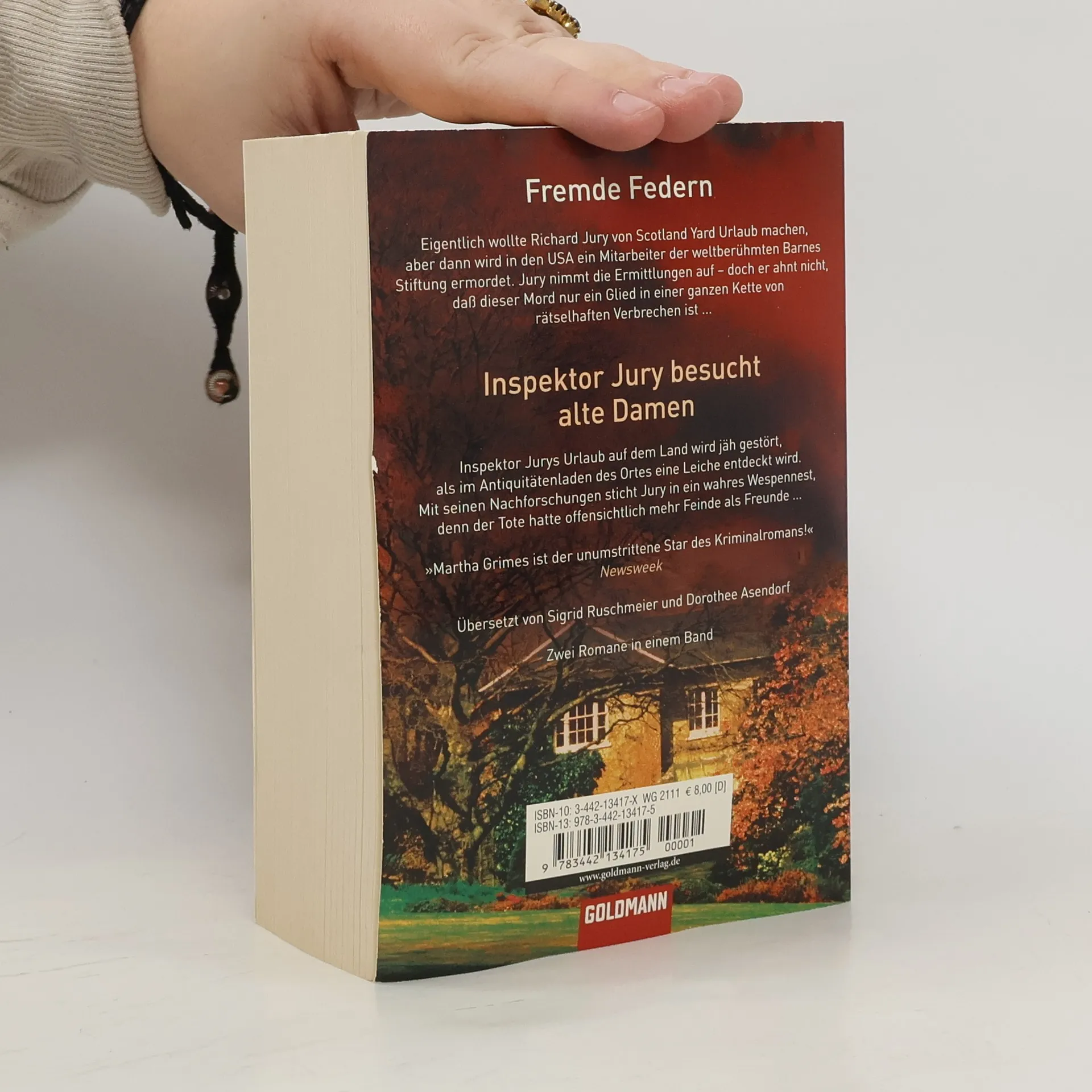 Die „2 in 1“ Taschenbücher von Goldmann: „Fremde Federn“ Eigentlich wollte Richard Jury von Scotland Yard Urlaub machen, aber dann wir in den USA ein Mitarbeiter der weltberühmten Barnes Stiftung ermordet. Jury nimmt die Ermittlungen auf – doch er ahnt nicht, dass dieser Mord nur ein Glied in einer ganzen Kette von rätselhaften Verbrechen ist. „Inspektor Jury besucht alte Damen“ Inspektor Jurys Urlaub auf dem Land wird jäh gestört als im Antiquitätenladen des Ortes eine Leiche entdeckt wird. Mit seinen Nachforschungen sticht Jury in ein wahres Wespennest, denn der Tote hatte offensichtlich mehr Feinde als Freunde.