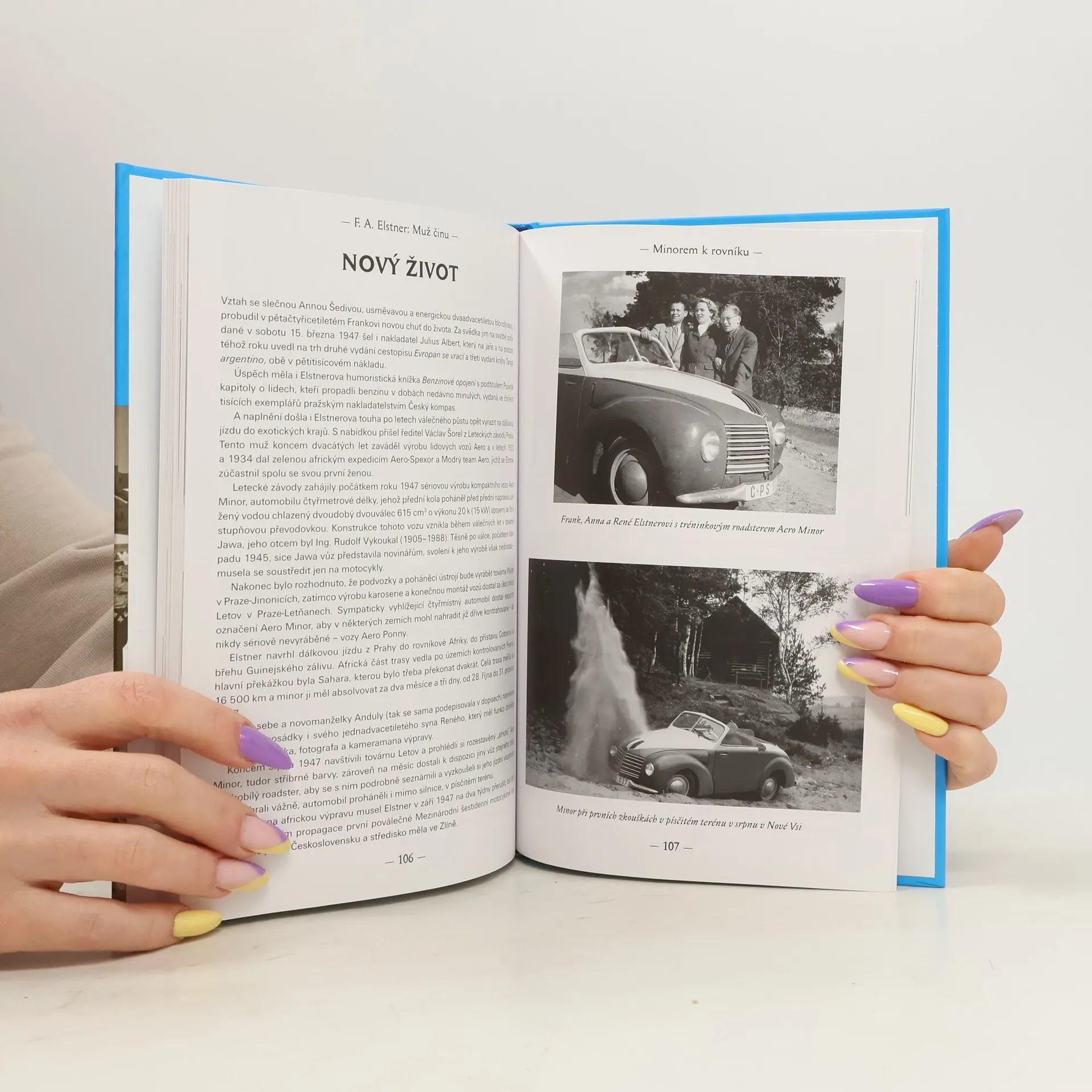 Kniha slovem i četnými fotografiemi dokumentuje cesty manželů Elstnerových. Popisuje jejich první výpravu do Afriky, kam v roce 1933 cestovali vozem Aero Spexor společně s dalšími dvěma posádkami aerovek. V roce 1934, doprovázeni Modrým teamem Aero, výpravu do Afriky opakovali. Sami pak cestovali v roce 1936 po USA a Mexiku, o dva roky později se vydali do Argentiny. Další delší jízdu podnikl Elstner až po válce v roce 1947 malým vozem Aero Minor spolu se synem Reném a svojí třetí ženou Annou. Trasa vedla z Prahy do rovníkové oblasti u Guinejského zálivu a zpět, se dvěma průjezdy napříč Saharou. Únor 1948 znamenal pro F. A. Elstnera konec cestování. Avšak mírné politické uvolnění druhé poloviny padesátých let mu umožnilo vydat se v roce 1959 zapůjčeným vozem Škoda Octavia do Sovětského svazu. Průvodcem na cestě dlouhé 14 tisíc kilometrů, jejíž trasa vedla až do Gruzie a na Krym, mu byl fotograf a filmař Jan Fiala. Kromě zmíněných dálkových jízd obsahuje publikace i několik kratších cest po Evropě, které podnikal ještě s první ženou Evou, a představuje Elstnerovu pestrou a mnohotvárnost osobnost - mimo jiné jako průkopníka skautingu v Československu a zapáleného propagátora dopravní bezpečnosti.