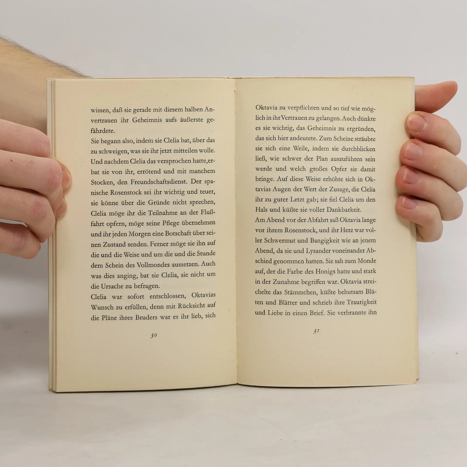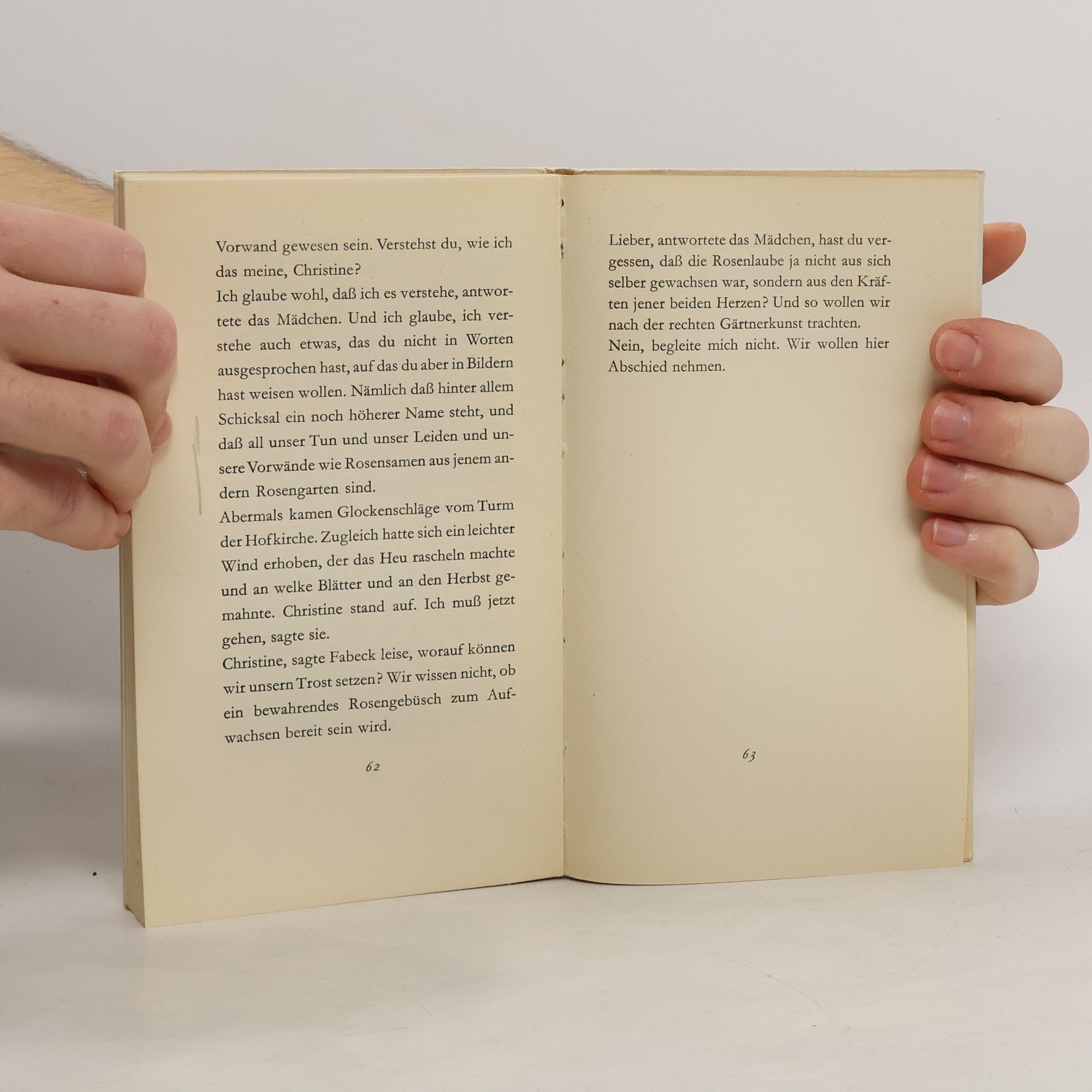Bevor er sich auf eine lange Reise macht, triff t der Dichter Fabeck noch einmal seine Freundin Christine. Wie jeden Abend steigen die beiden einen Berg hinauf, und während die Menschen unten im Tal zu Bett gehen, bittet Christine den Freund um eine Geschichte. Sie setzen sich vor ein steinernes Tempelchen, und Fabeck beginnt, von einem Liebespaar zu erzählen, das Abschied nehmen muss, und von einem verzauberten spanischen Rosenstock, der eines Tages zu welken beginnt.