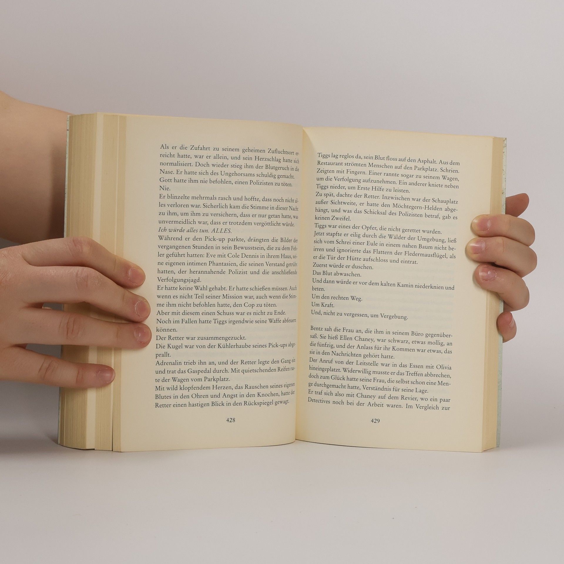 Die Stimme dröhnte in seinem Kopf. Töte. Töte sie beide. Den Mann und die Frau. Opfere sie. Heute Nacht. Das ist deine Buße. Eve Renner zweifelt heimlich an der Unschuld ihres Adoptivvaters. Der berühmte Arzt soll seine ärztliche Pflicht verletzt und somit den Tod einer Patientin verschuldet haben. Als sich Eves alter Freund Roy mit ihr mitten in der Nacht in einer abgelegenen Hütte treffen möchte, weil er angeblich Beweise für die Schuld ihres Vaters hat, sagt sie sofort zu. Dort angekommen, findet sie seine grausam entstellte Leiche, auf Roys Stirn hat der Mörder eine Zahl tätowiert und die Wände mit Blut beschmiert. Völlig schockiert ruft Eve um Hilfe, doch das Letzte, was sie sieht, bevor ihr schwarz vor Augen wird, ist, wie ihr Liebhaber, der Staranwalt Cole Dennis, eine Waffe auf sie richtet …