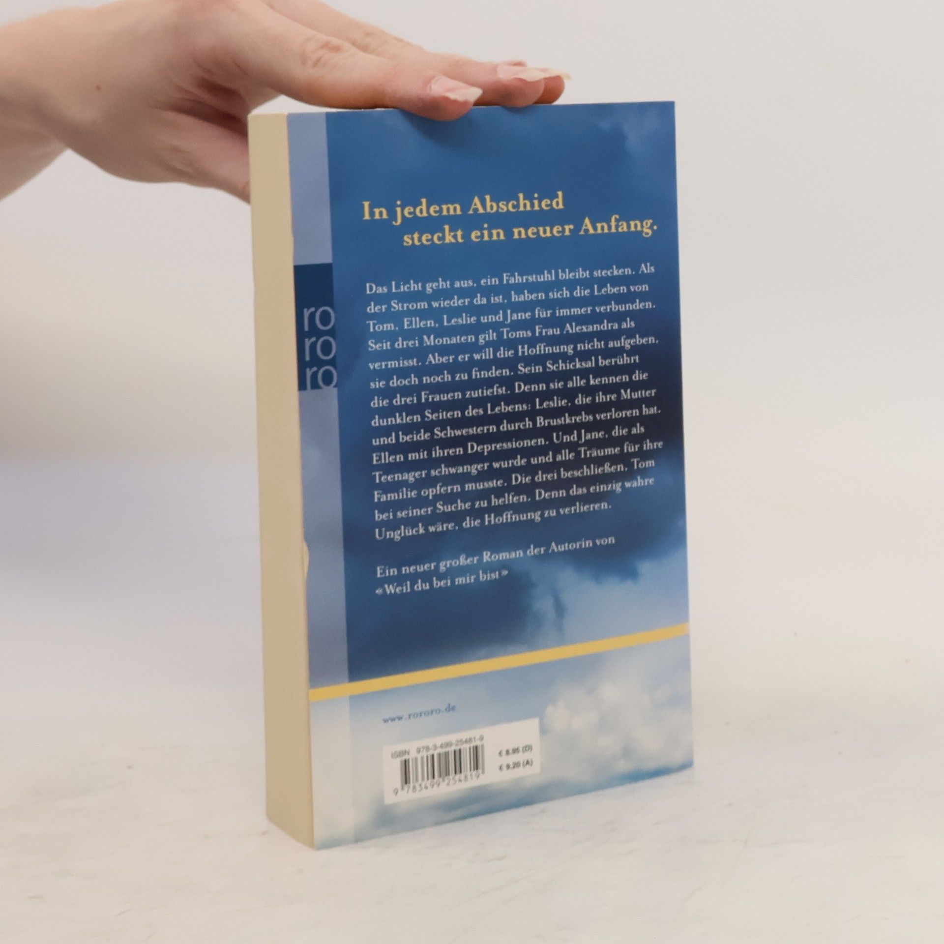 In jedem Abschied steckt ein neuer Anfang Das Licht geht aus, ein Fahrstuhl bleibt stecken. Als der Strom wieder da ist, haben sich die Leben von Tom, Ellen, Leslie und Jane für immer verbunden. Seit drei Monaten gilt Toms Frau Alexandra als vermisst. Aber er will die Hoffnung nicht aufgeben, sie doch noch zu finden. Sein Schicksal berührt die drei Frauen zutiefst. Denn sie alle kennen die dunklen Seiten des Lebens: Leslie, die ihre Großmutter, die Eltern und beide Schwestern durch Krebs verloren hat. Ellen mit ihren Depressionen. Und Jane, die als Teenager schwanger wurde und alle Träume für ihre Familie opfern musste. Die drei beschließen, Tom bei seiner Suche zu helfen. Denn das einzig wahre Unglück wäre, die Hoffnung zu verlieren. Ein neuer großer Roman der Autorin von 'Weil du bei mir bist'
