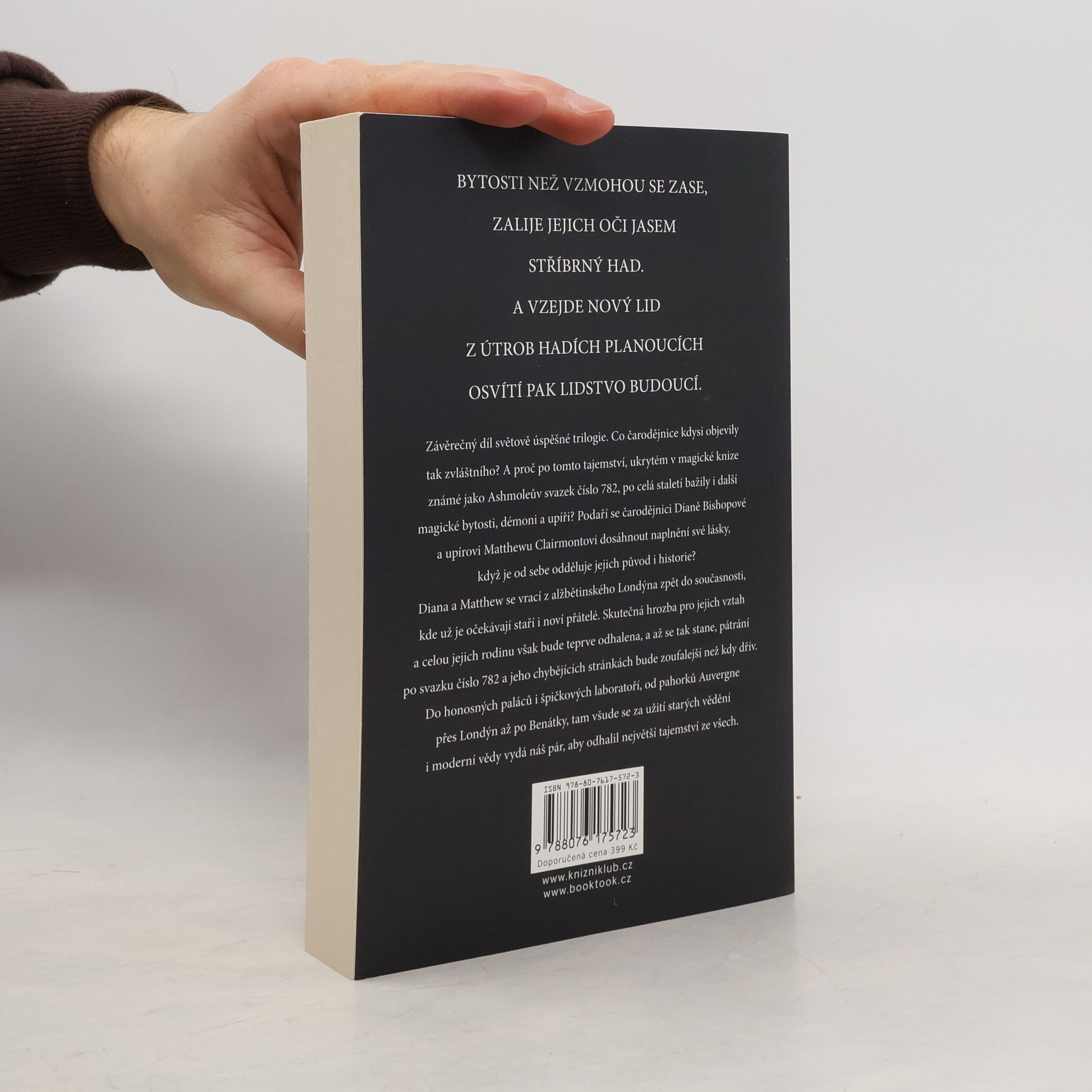 Závěrečný díl světově úspěšné trilogie. Hlavní hrdinové a milenci, čarodějnice Diana Bishopová a upír Matthew Clairmont, se vracejí v čase z alžbětinského Londýna zpět do naší současnosti. Diana je těhotná a o to víc odhodlaná bránit se proti těm, kteří chtějí ukrást a zneužít tajemství objevené čarodějnicemi v dávných dobách a ukryté v tajemném Ashmoleově svazku. Než se však Dianě a Matthewovi podaří odhalit obsah tajného rukopisu alias Knihy života, musí uhájit i svůj zakázaný vztah.