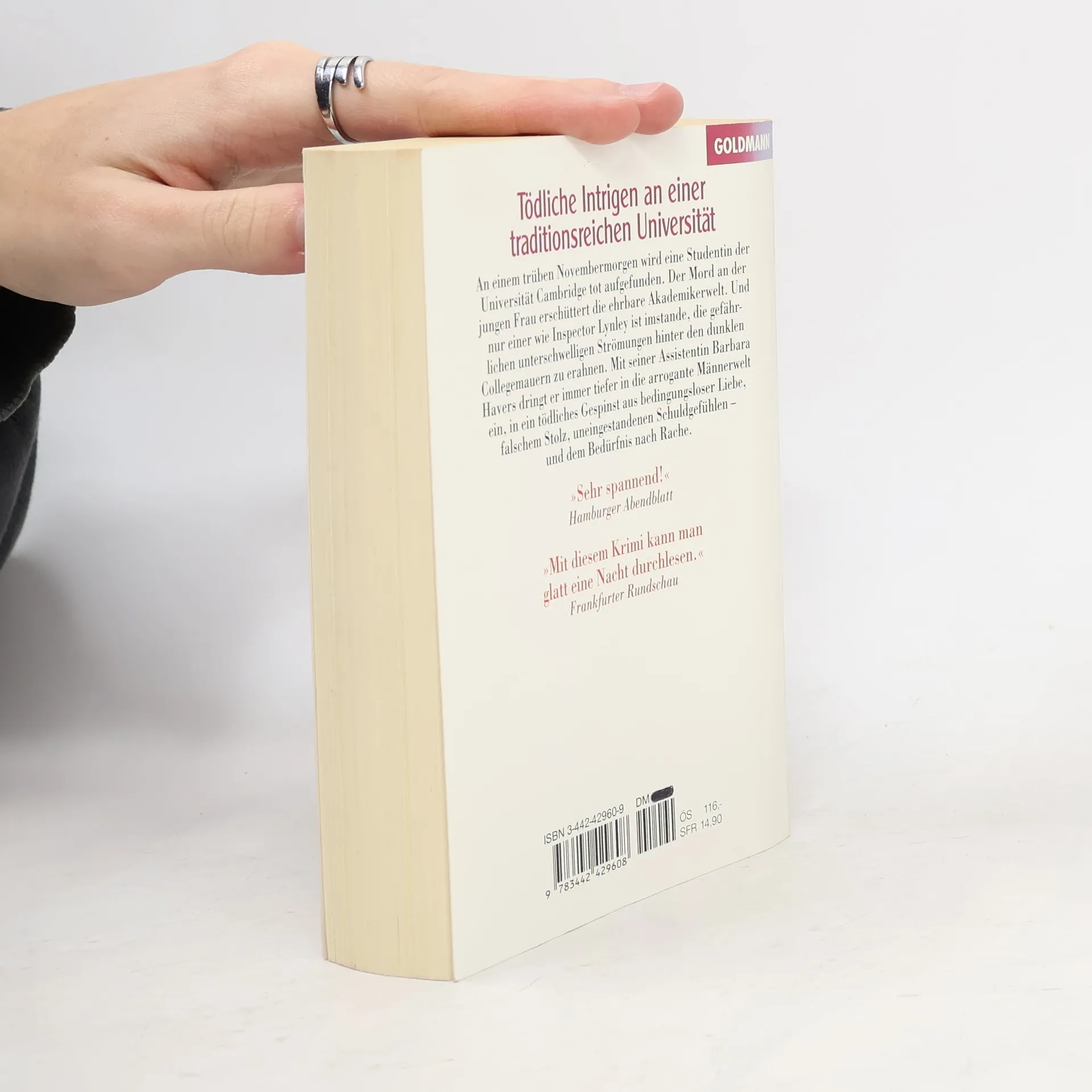 Inspector Lynleys fünfter Fall führt ihn an die ehrwürdige Universität Cambridge. Eine Studentin wurde ermordet und ihr Tod erscheint zunächst rätselhaft. Doch je tiefer Lynley und seine Assistentin in den Fall eindringen, um so dichter wird das Geflecht aus falschem Stolz, uneingestander Schuld und bedingungsloser Liebe in einer akademischen Männerwelt, in der Frauen einen schweren Stand haben und bisweilen in Gefahr geraten.