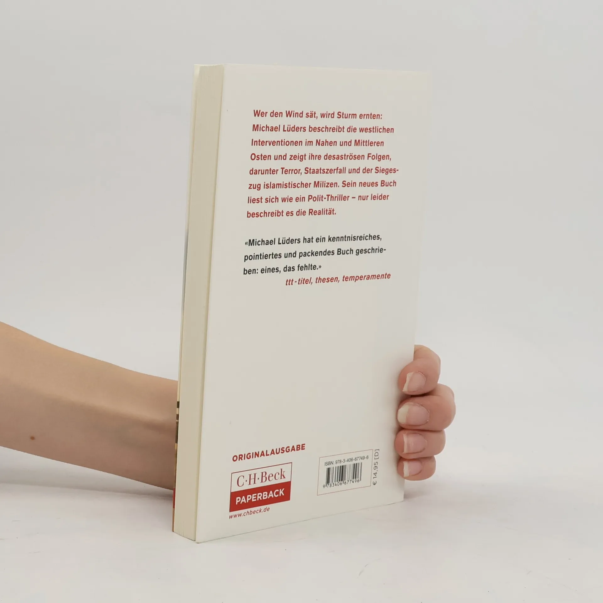 „LIEST SICH WIE EIN POLIT-THRILLER“ BERND SCHEKAUSKI, MDR FIGARO Wer den Wind sät, wird Sturm ernten - Michael Lüders beschreibt die westlichen Interventionen im Nahen und Mittleren Osten seit der Kolonialzeit und erklärt, was sie mit der aktuellen politischen Situation zu tun haben. Sein neues Buch liest sich wie ein Polit-Thriller - nur leider beschreibt es die Realität. Eine Geschichte erscheint in unterschiedlichem Licht, je nachdem, wo man beginnt sie zu erzählen. Und wir sind vergesslich. Das iranische Verhältnis zum Westen versteht nur, wer den von CIA und MI6 eingefädelten Sturz des demokratischen Ministerpräsidenten Mossadegh im Jahr 1953 berücksichtigt. Ohne den Irakkrieg von 2003 und die westliche Politik gegenüber Assad in Syrien lässt sich der Erfolg des „Islamischen Staates“ nicht begreifen. Wer wissen will, wie in der Region alles mit allem zusammenhängt, der greife zu diesem Schwarzbuch der westlichen Politik im Orient. Die verheerenden Folgen westlicher Politik im Orient Geschrieben von einem der besten Kenner